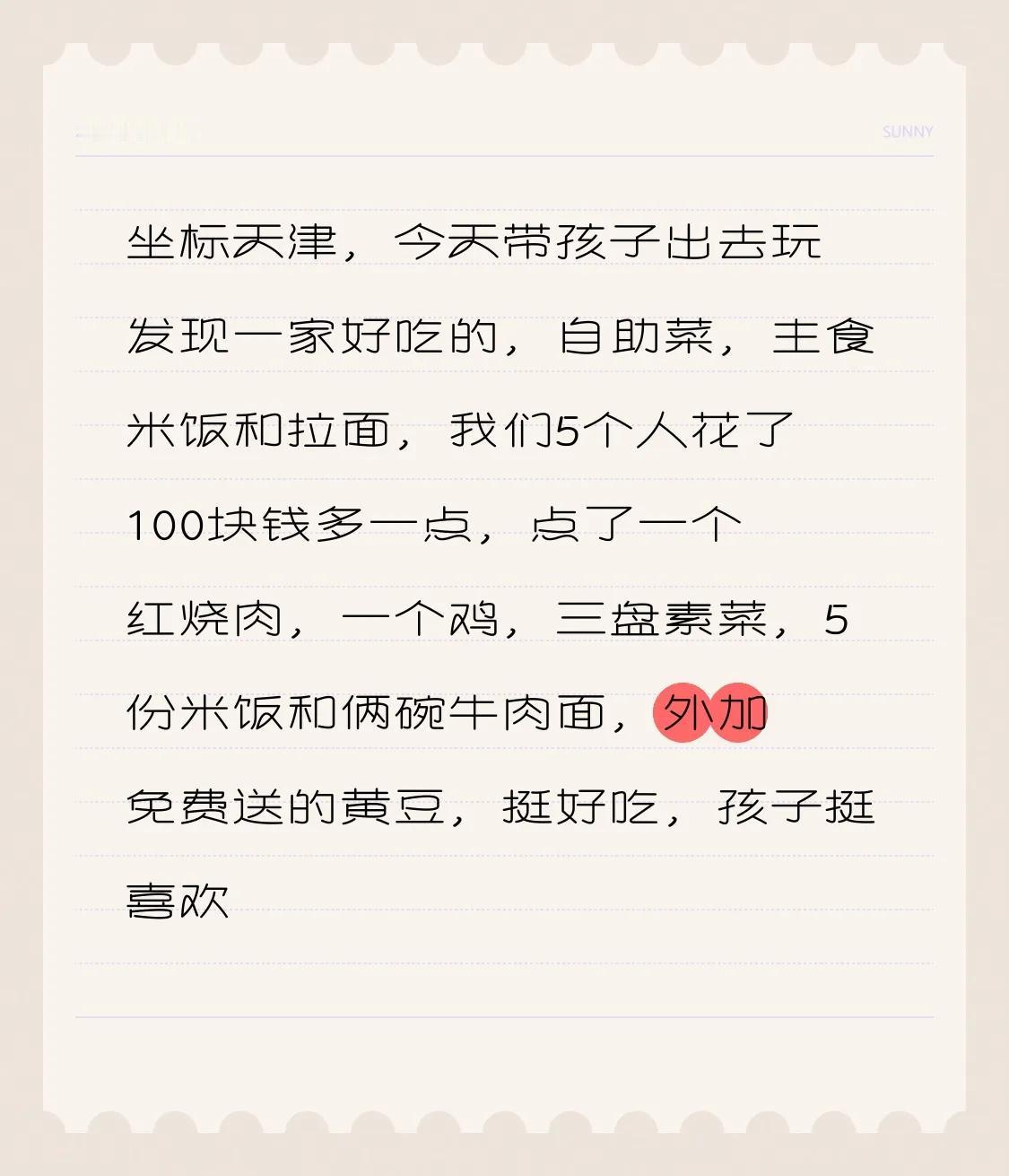 坐标天津,今天带孩子出去玩发现一家好吃的,自助菜,主食米饭和拉面,我们5个人花了100块钱多一点,点了一个红烧肉,一个鸡,三盘素菜,5份米饭和俩碗牛肉面,外加免费送的黄豆,挺好吃,孩子挺喜欢