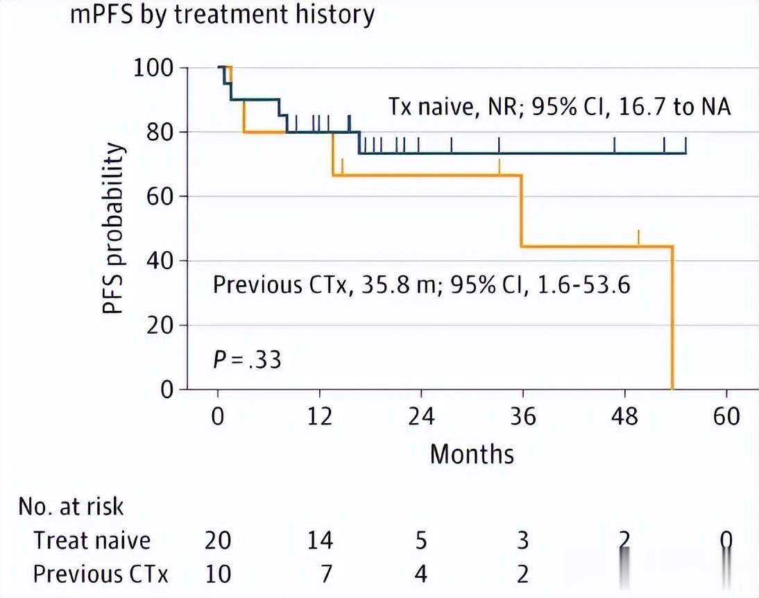 在洛拉替尼治疗后,30位患者中22人客观缓解,5人病情稳定,客观缓解率和疾病控制率分别达到73%和90%,中位无进展生存期到达53.6个月。其中:
