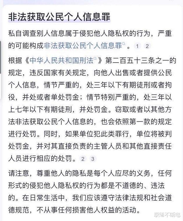 1、这个候选人的做法真的是对的吗?大家都是打工人,作为hr,肯定也是希望能给公司引进一些好的人选,职场素养高的人。这个本身就是hr的职责所在也是对公司负责。在背调的过程中,产生了疑问多找一些问下,这个也无可厚非,毕竟hr圈子还是比较小,找一找还是比较容易。因为工作不好找,就直接将人家送进局子,人家职场生涯算是完了。从法律的层次来讲,暗调确实是非法采集了自己的信息,这个不否认,但是从伦理道德来看,这个行为是否过激?
