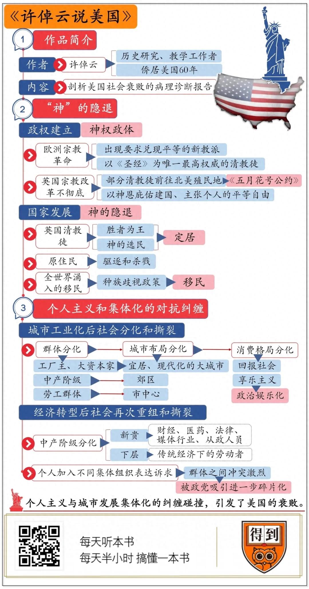 作者在书中把中国作为参照物,从文化的角度思考了美国衰落的原因。许先生提到:“比人稍微长一点是政治,比政治稍微长一点是经济,而文化仅稍次于自然,乃是万年鉴。”作者认为,美国文化的脉络是“神”的隐退,也就是推崇个人主义。两百多年来不同文化背景的人,像作者一样满怀憧憬来到美国,希望融入这个社会。但随之而来的工业发展要求分工合作,城市生活造成密集定居,这就和美国底层的个人主义发生剧烈碰撞。“神”的隐退、城市发展带来的集体化这两种力量的互相纠缠碰撞,造成美国社会的撕裂和重组,由此引发了美国的衰败。