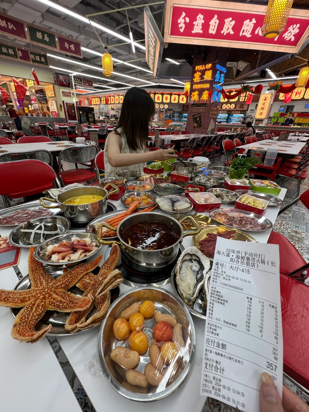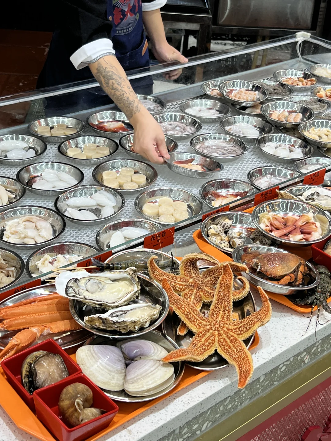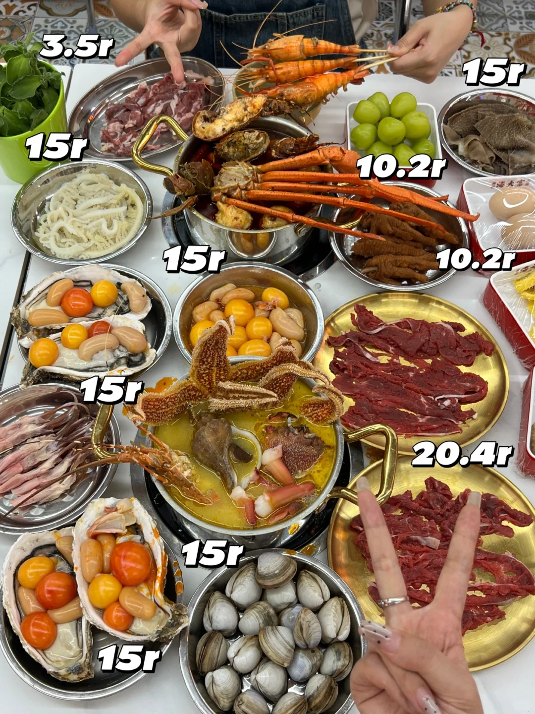 不愧是海鲜小火锅届的萨莉亚!!!! 绿盘3.5r 黄盘6.8r 红盘10.2r !! 最最贵的海鲜也是要20.4r !!!! 终于可以放开肚子吃,实现海鲜自由了🦞 海鲜的种类又多又新鲜的,海星、大闸蟹🦀大龙虾、基围虾🦐生蚝🦪鲍鱼、各种鲜切的牛肉🥩还有各种水果🍉点心🥧本穷鬼的快乐食堂没错了