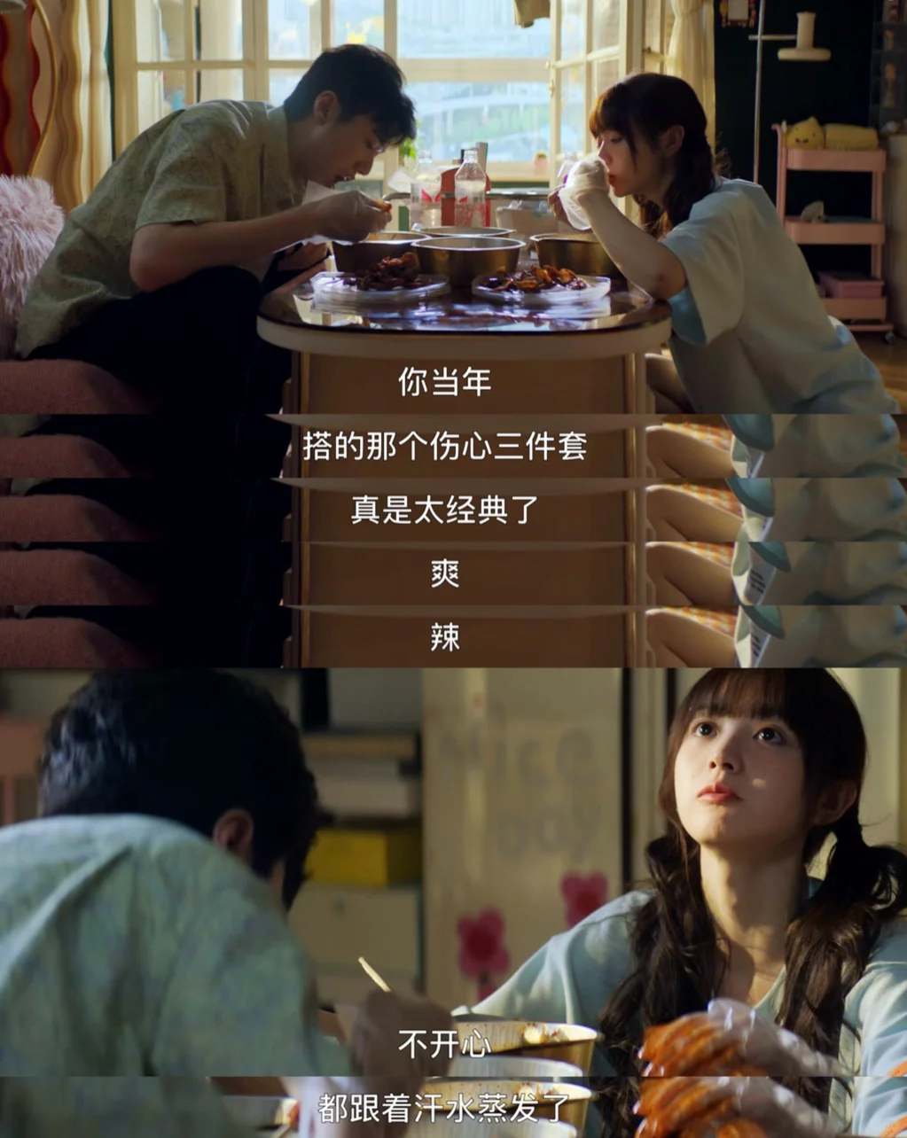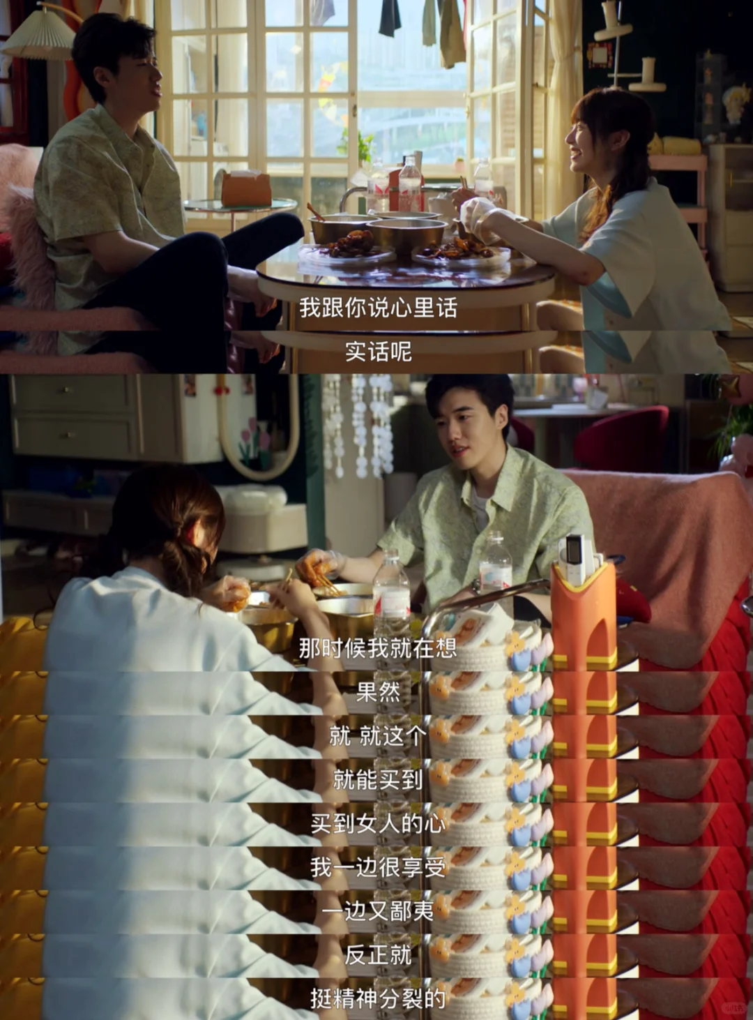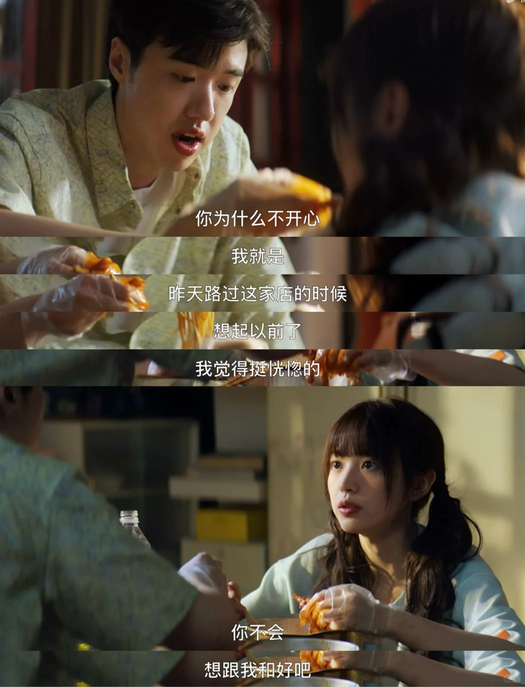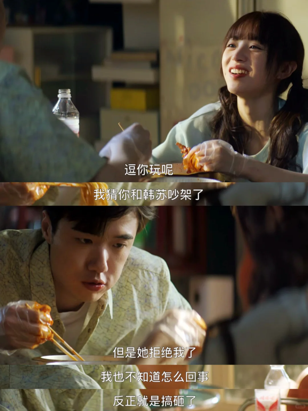 高鹏被韩苏彻底拒绝,买了吃的来找何知南,何知南也正因为和王子路的事情郁闷,二人像好朋友一样坦然相见边吃边聊。