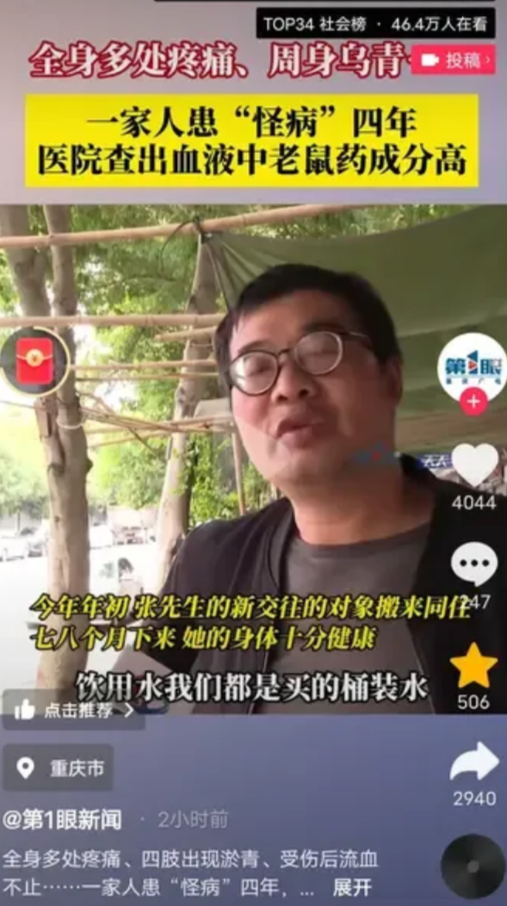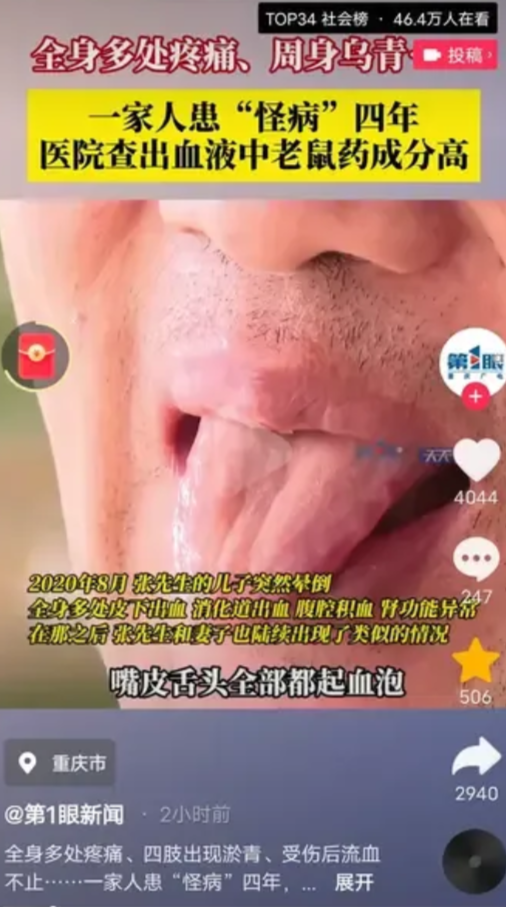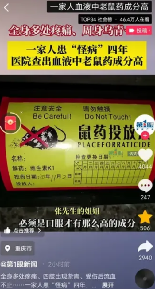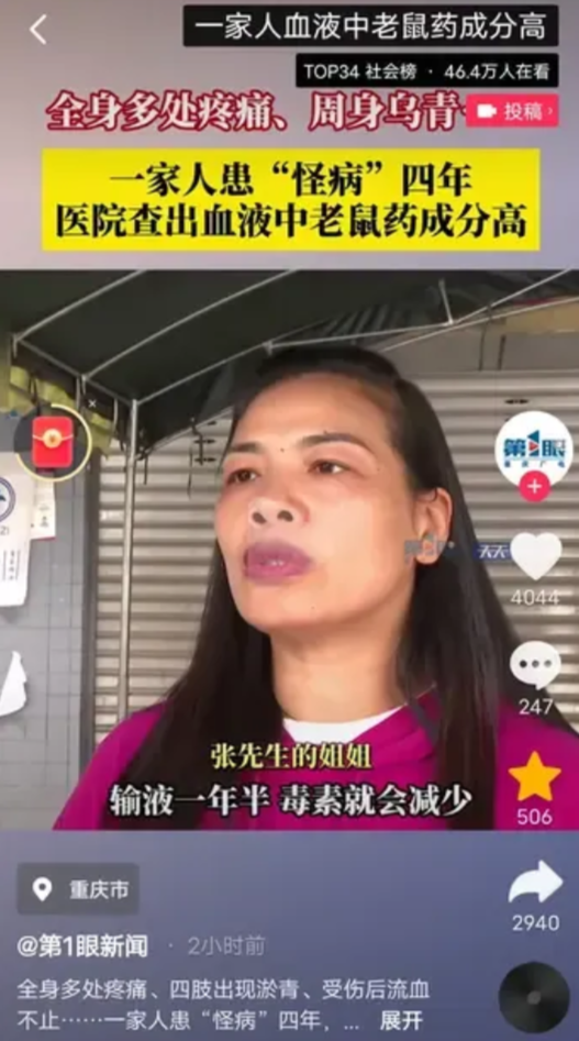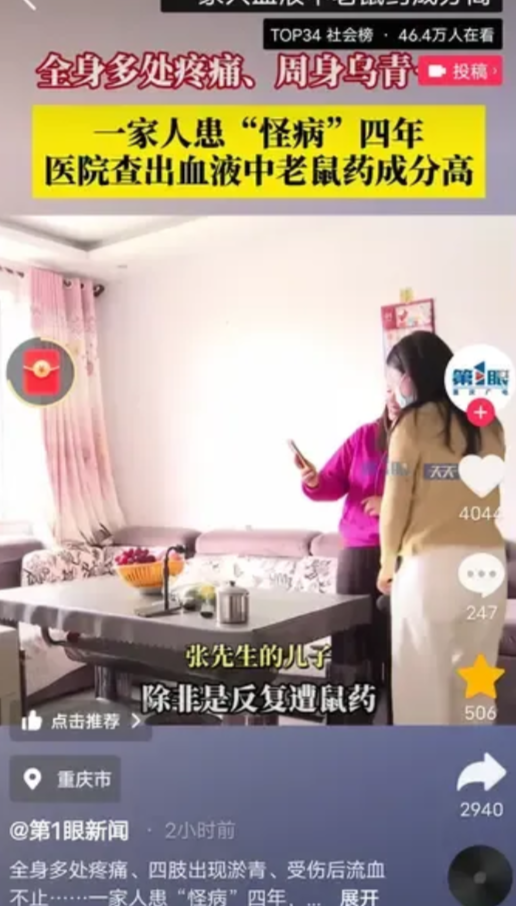 细思极恐,10月3日发布。重庆,一家人四年血液里老鼠药成分高!期间,这家的妈妈还因此去世, 据这家的亲属称,首先,在2020年,这家的儿子先犯了病,随后,这家爸爸妈妈也犯了同样的病,医生诊断为鼠药中毒, 随后,进行输液治疗,毒素减少!这期间,妈妈去世! 然而,最近爸爸和儿子又出现了症状,去医院一查,又有鼠药成分在血液里,医生称,只有口服才能达到这么高的成份!父子每周输两次液才能缓解疼痛! 亲属表示,已经同居七八个月的儿子的女友非常的健康,楼上楼下的邻居也没事,这家人喝的桶装水,把家里的东西都清理了一下,都没找到来源! 目前,家人已报警! 网友表示,是不是熟人下毒,下到调料里?或定期,少量的下毒? 又有网友表示,若下毒到调料里,为何同居七八个月的女友没事?