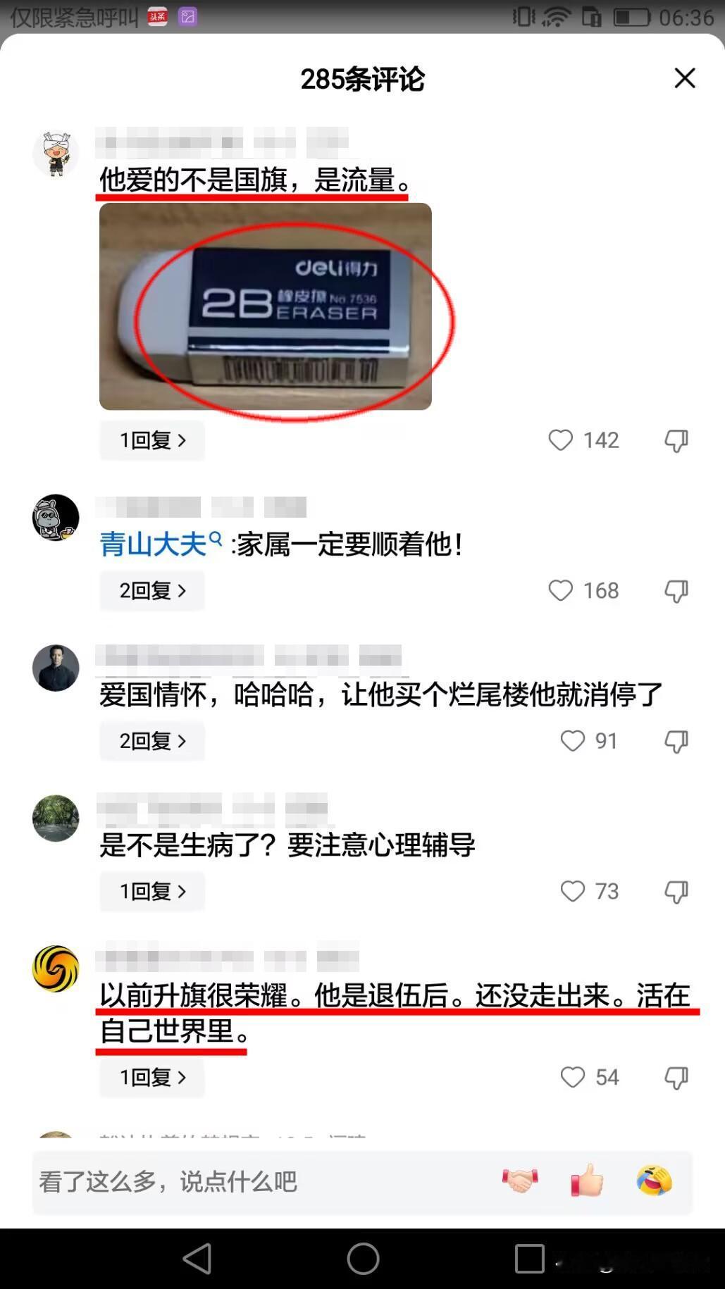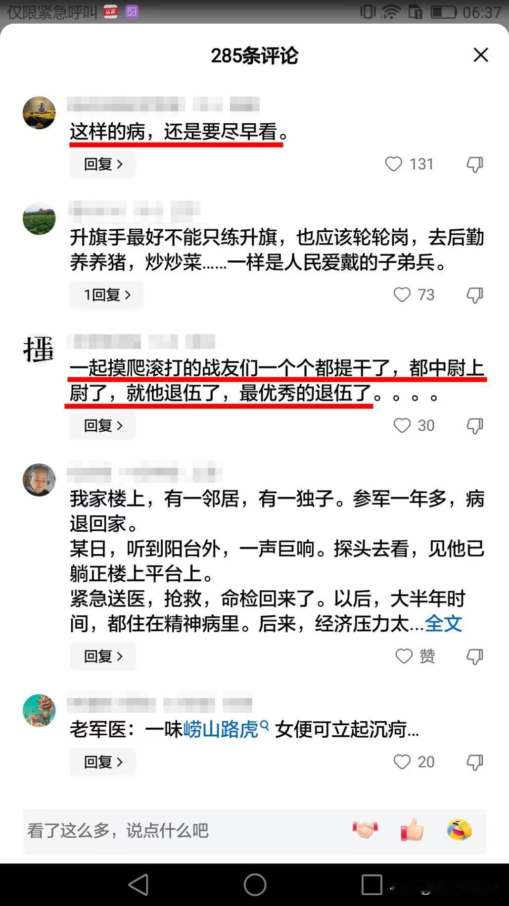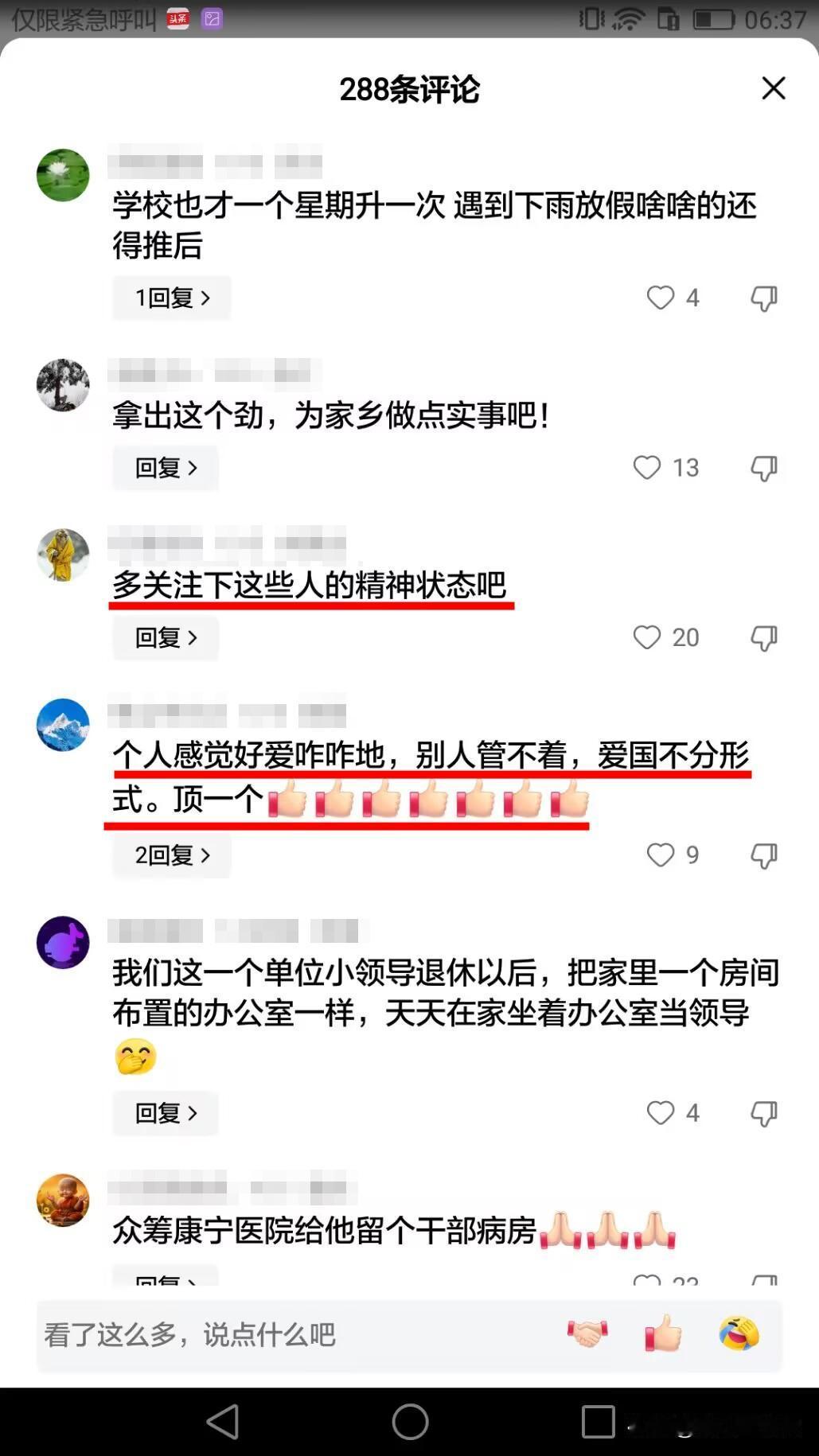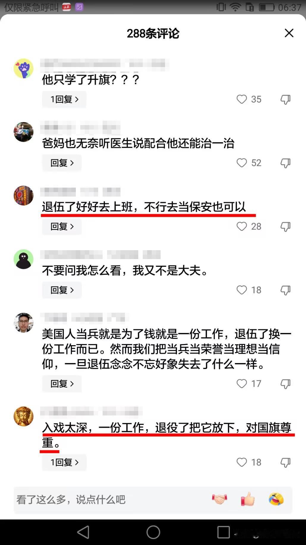 一个退役的国旗手,天天在自己家里升旗,父母是他的升旗操作员。 令我吃惊的不是他的这种行为,而是评论区里几乎全部的都是指责、揶揄,甚至谩骂! 我们先不说这是爱国情怀,还是哗众取宠。就从一个人的习惯角度来说,这不是很正常的事吗? 就像张三早晨喜欢锻炼身体,李四早晨喜欢练字,王五早晨喜欢养养花种种菜一样,都是个习惯而已,怎么张自轩升起国旗就生出毛病了,他一不扰民,二不违法,怎么就惹得某些人说三道四呢? 有人说他为了流量,拜托,我在头条专门查了他的账号,一共18个粉丝,他为了什么流量?有人说他不干正事,不去挣钱养老人,你怎么就知道他不干正事了?升旗才需要几分钟的时间,一天当中剩下的时间难道他都在练习升旗? 心里爱这份工作,怎么就成了病了?如果他真的入戏太深不能自拔,那么治病也是他父母的事。实际上,并不是入戏太深,就像很多退役军人一样,心中对自己曾经当兵的那段历史记忆深刻,并且自豪,只不过,有些人把这藏在心里,有些人就像张自轩一样,在不影响他人的前提下,穿上曾经的军装,翻拍一下曾经的荣耀,仅此而已。 所以,我们还是从包容的角度,从正能量的角度来理解和看待张自轩这种现象,我也对网上有人退役的人,还穿上军装,踢着正步,专门录出来拿到网上蹭流量而反感,但是,张自轩和这些人有天壤之别。 理解万岁吧。
