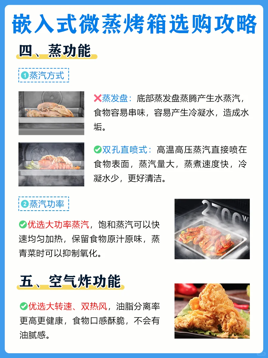 ✅优选有智能除异味、一键烘干、蒸汽清洁杀菌、水路除垢保养、智能反积水功能的,蒸烤箱更好打理。