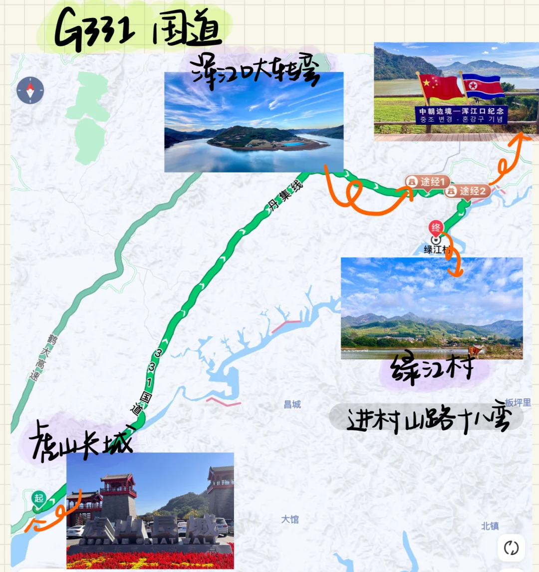 p1 路线图 p2 g331 国道 丹东到绿江村路线及途径点 p3 绿江村到集安 tips1️⃣来绿江村必玩的 看老渔翁撒网 绿江小天池 绿江码头快艇(60/人 时长太概20-30min)风景还不错蛮刺激的 tips2️⃣来绿江村的话 尽量天黑之前赶到 不然容易开到崩溃 进绿江村的路可以说是山路十八弯 科目三没白学 tips3️⃣从绿江村出来我们只走了一小段国道 然后就走的高速 感觉国道总有地方在修路 不太好开 就先写这些 后续我想起来啥再补充