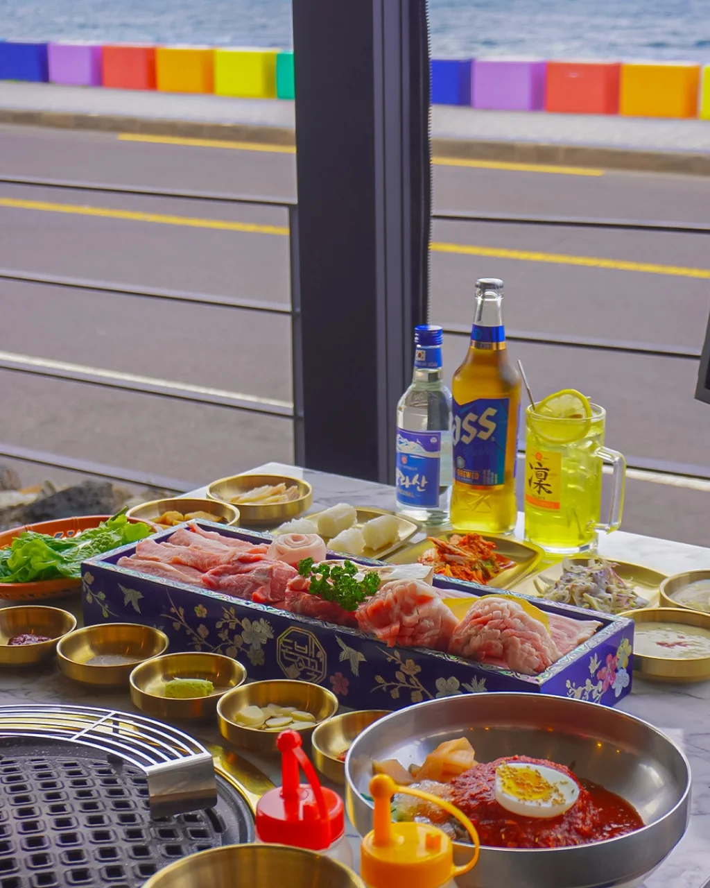 他们家紧邻多都彩虹海岸路,可以一边欣赏美景,一边享受济州岛特产黑猪肉🐷套餐。不同部位的🥩有不同的口感,烤制后油滋滋香喷喷,蘸上酱料,裹起生菜,对味蕾一整个大友好~