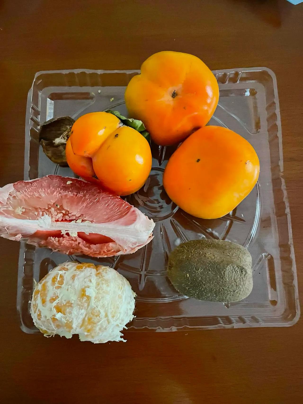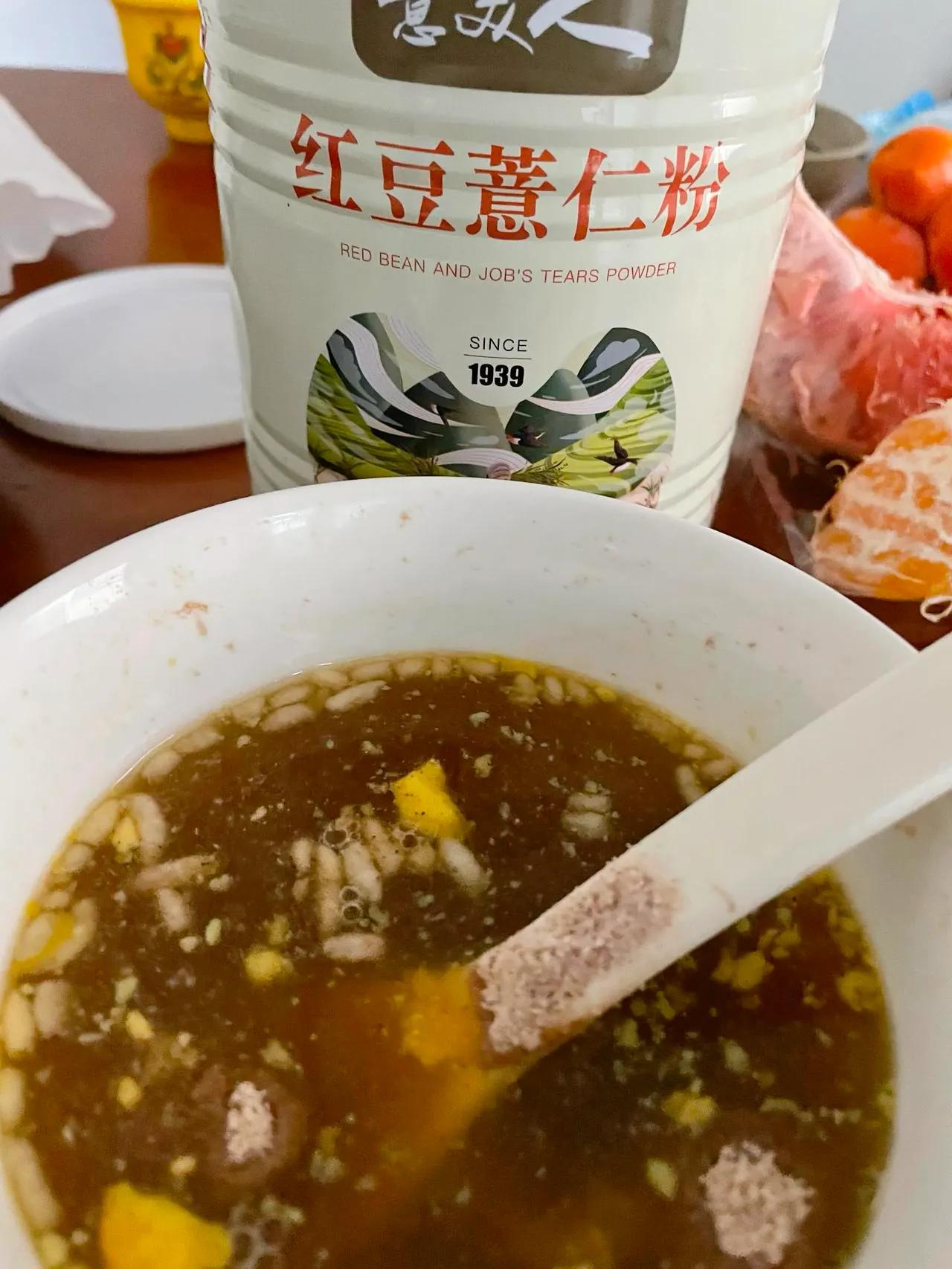 #秋日美食大赏# 早歺两个红糖水煮土鸡蛋、爆米花、红豆薏仁粉、柿子等。