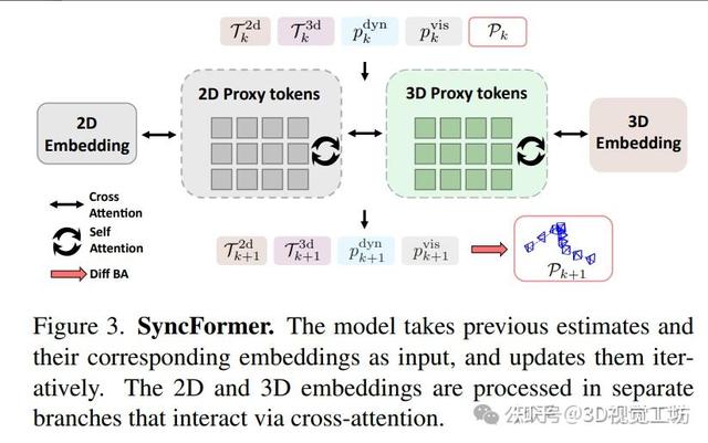 该模型以先前的估计值及其对应的嵌入作为输入,并对其进行迭代更新。2D和3D嵌入是在各自的分支中处理的,并通过交叉注意力机制进行交互。