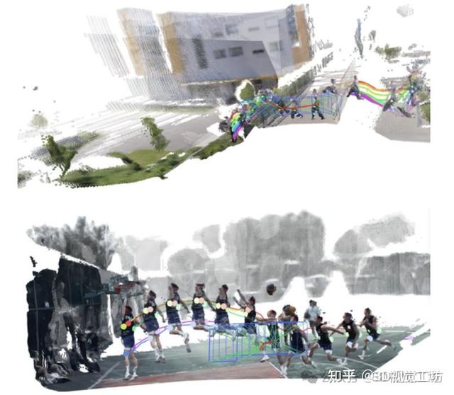 融合点云、相机姿态和3D点轨迹。我们可视化从视频深度和相机姿态中重构的融合点云,以及世界空间中的长期3D点轨迹。