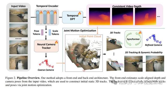 我们的方法采用前端和后端架构。前端从输入视频中估计尺度对齐的深度和相机位姿,用于构建初始静态3D轨迹。然后,后端通过联合运动优化迭代地细化轨迹和位姿。