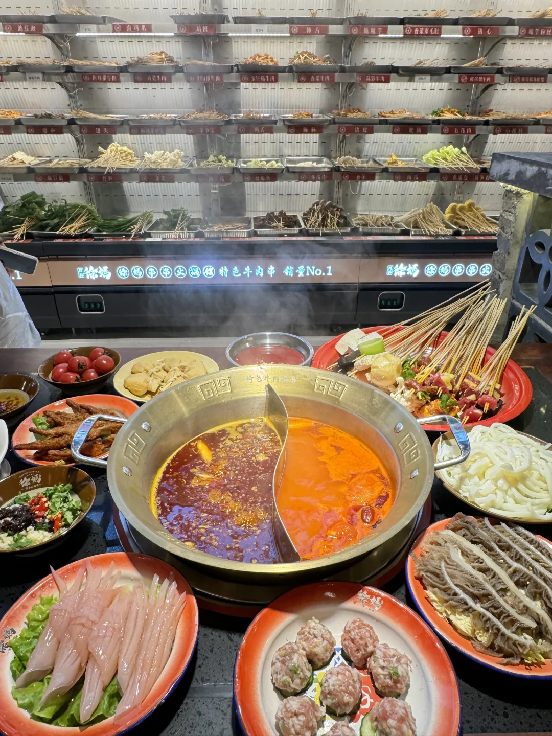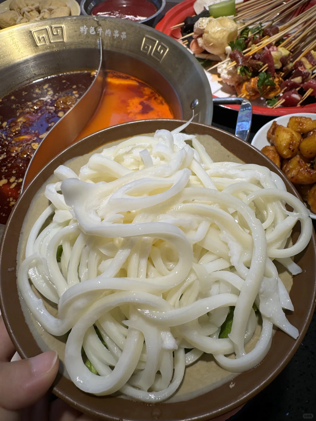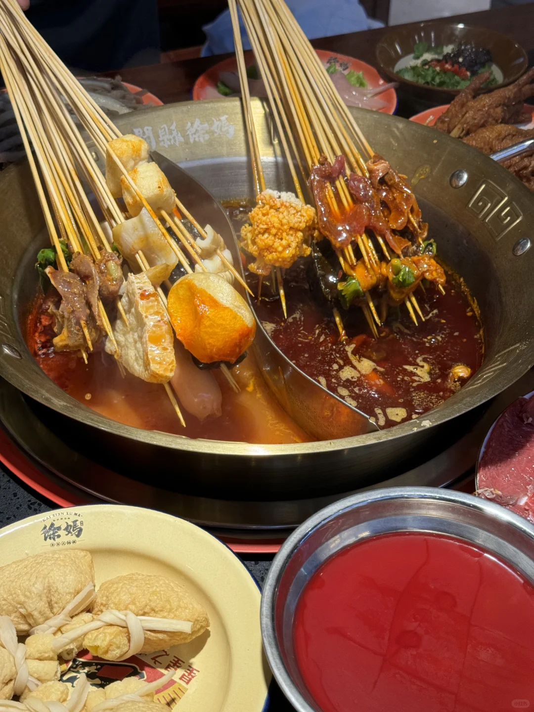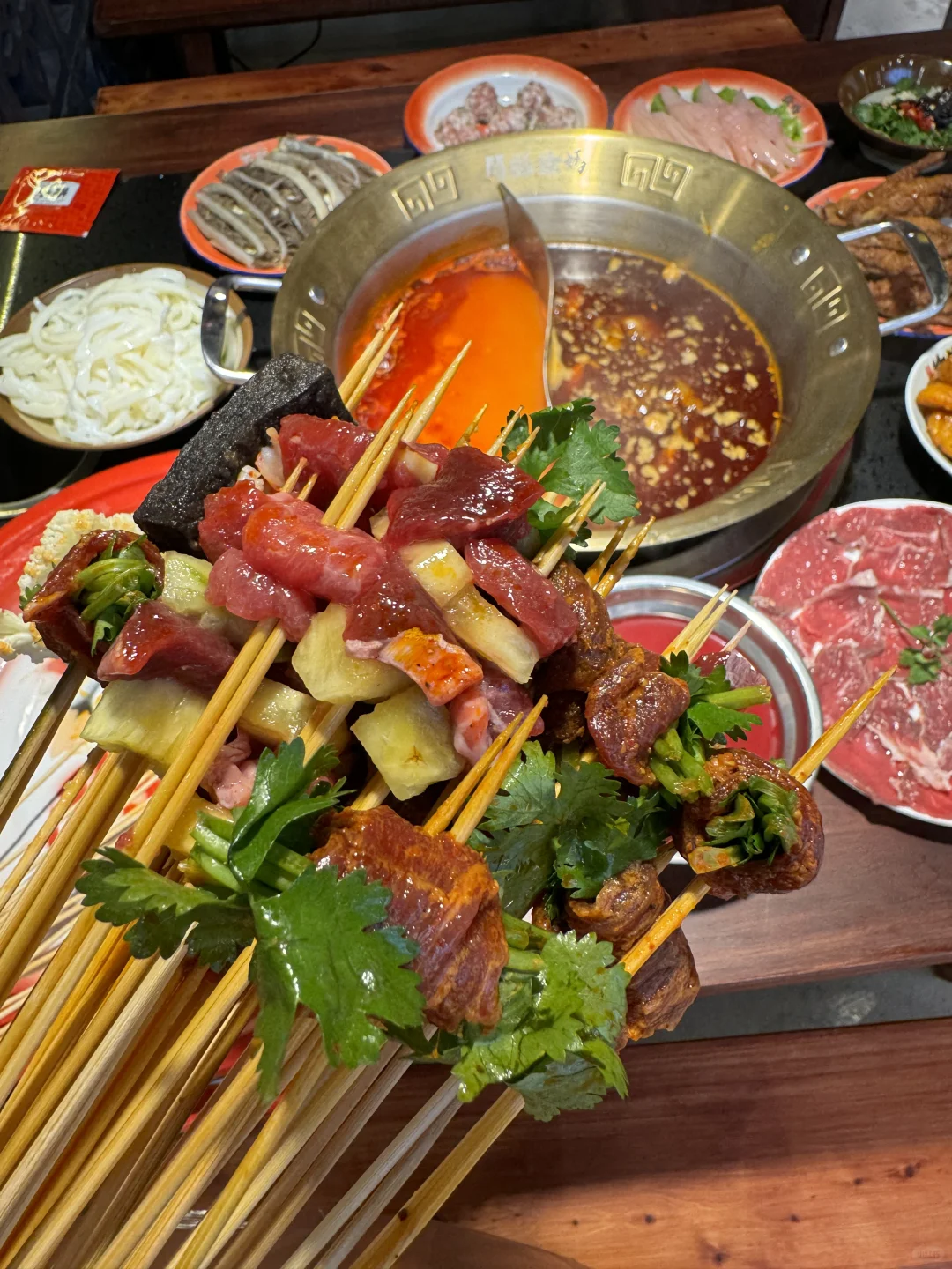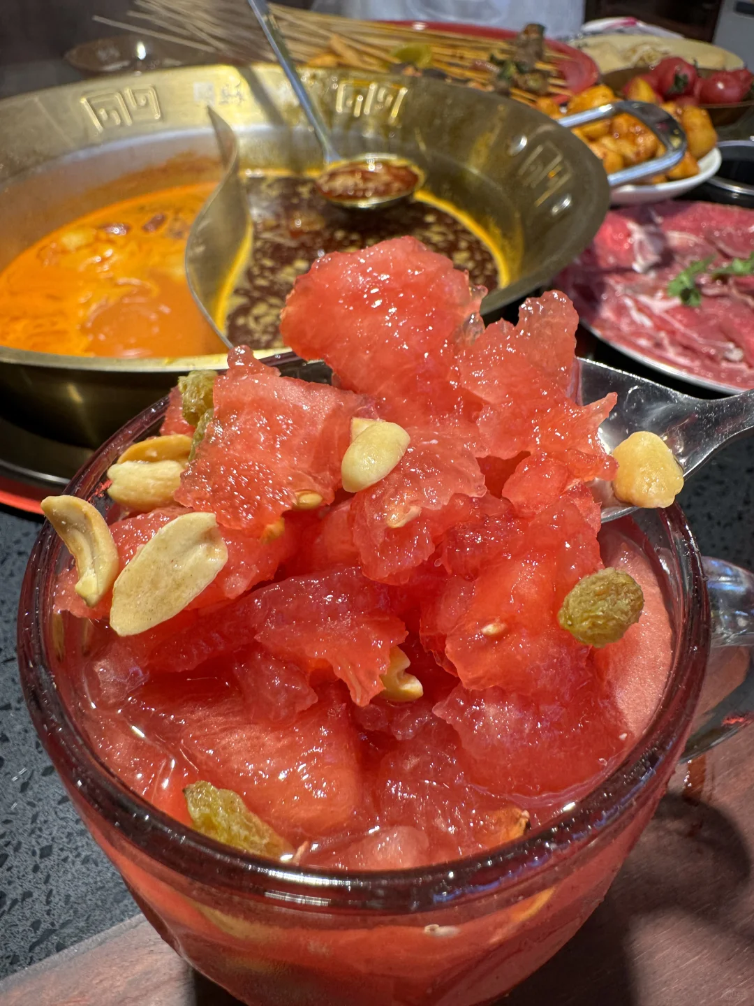 烟火气满满的串串,每个月都要吃的程度! 牛油鸳鸯锅底,牛油香气扑鼻,辣辣的超爽! 鲜切黄牛肉很新鲜,纹路清晰上等牛肉就是吃的过瘾 千丝黄喉、香菜牛肉、凤梨牛肉一定要下辣锅!!嘎嘎有滋味! 锅巴洋芋🥔外脆里面~土豆心堪比土豆泥一样绵密! 西瓜刨冰,好爽!大块西瓜果肉!清爽解腻!! 环境也很干净,整洁!!服务更是没得说!