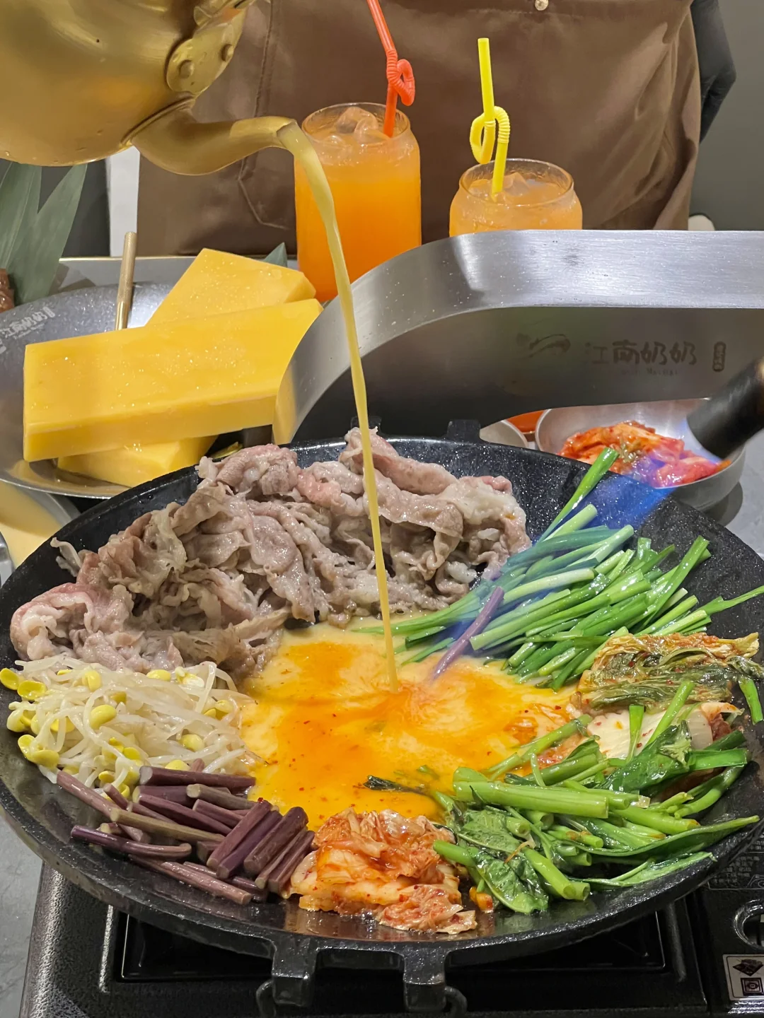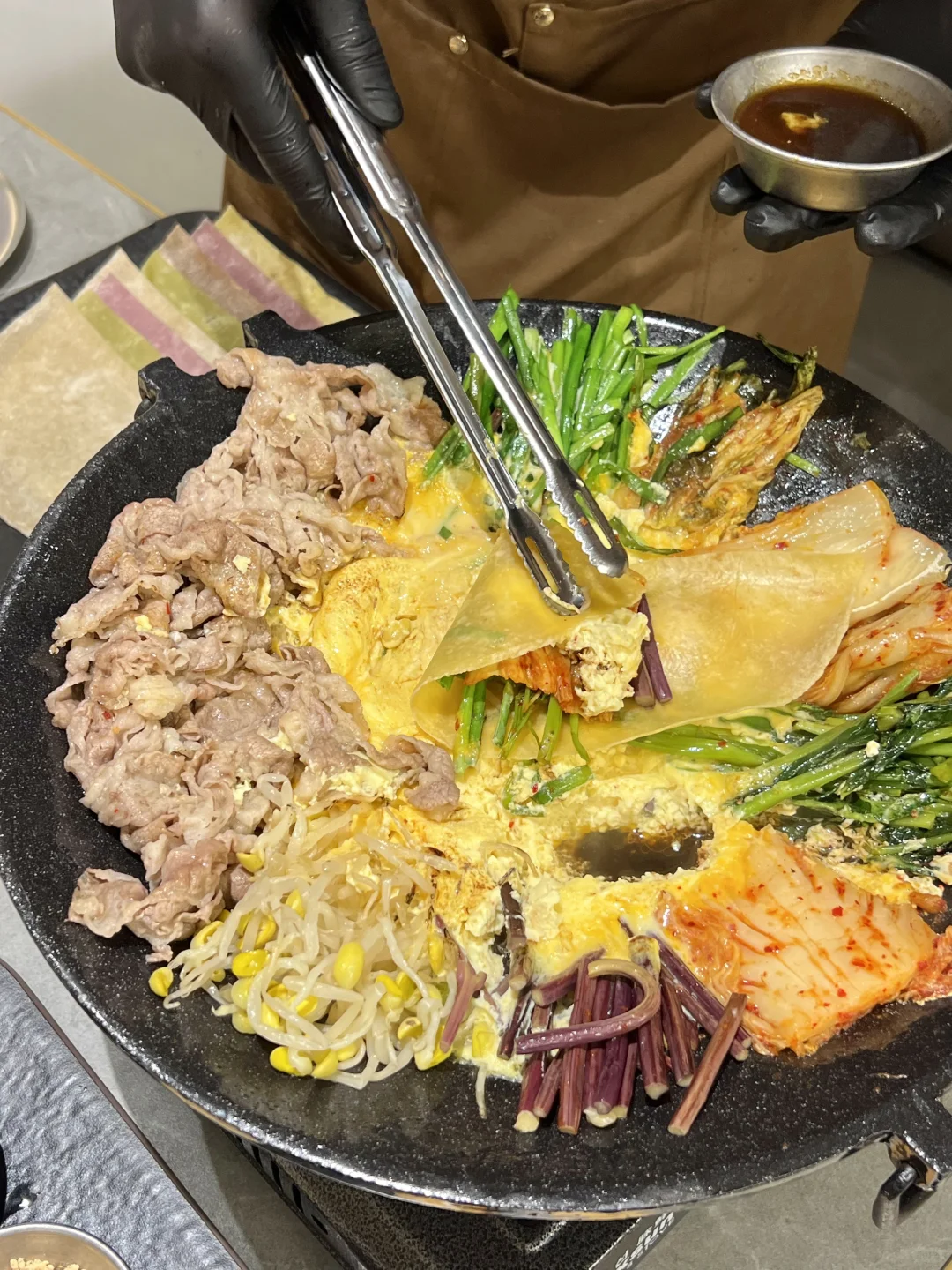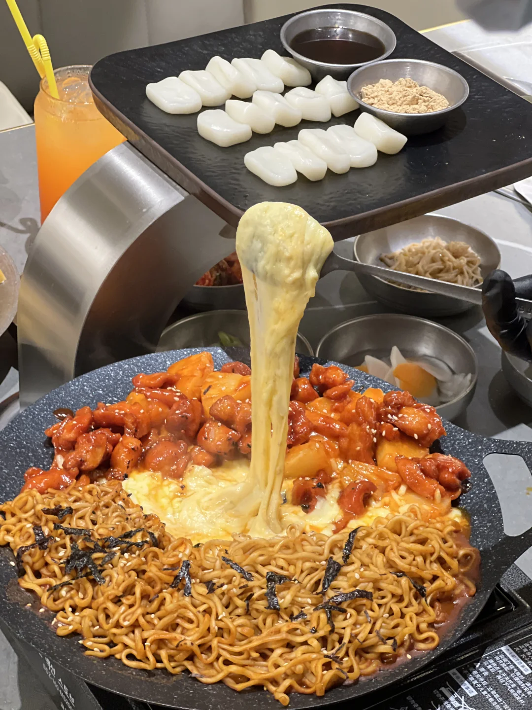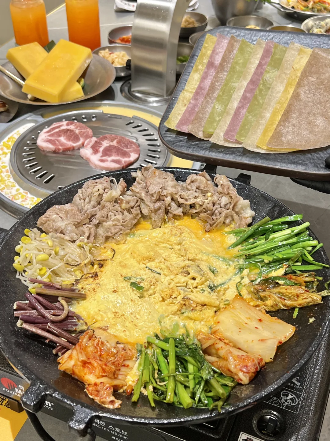 和韩国吃的一样一样的!!无敌了 ▪️蜂蜡五花肉也太好吃了!不用烤的很焦都好好吃!不油腻!蘸酱嘎嘎香~好有胶质感! ▪️肥牛七彩锅全都是现场火烤熟的!加入鸡蛋液!再用七彩饼包着吃好鲜嫩啊! ▪️芝士菠萝鸡火鸡面 鸡肉好甜嫩啊~芝士好醇厚!跟火鸡面裹在一起,好好好好浓郁! ▪️打糕!!好好好软乎乎~真的和平常吃的不一样!糯唧唧!裹上红糖和黄豆粉超爱的!! 各种烤肉、辣鸡爪、生拌牛肉都好好吃🤤无雷无雷!