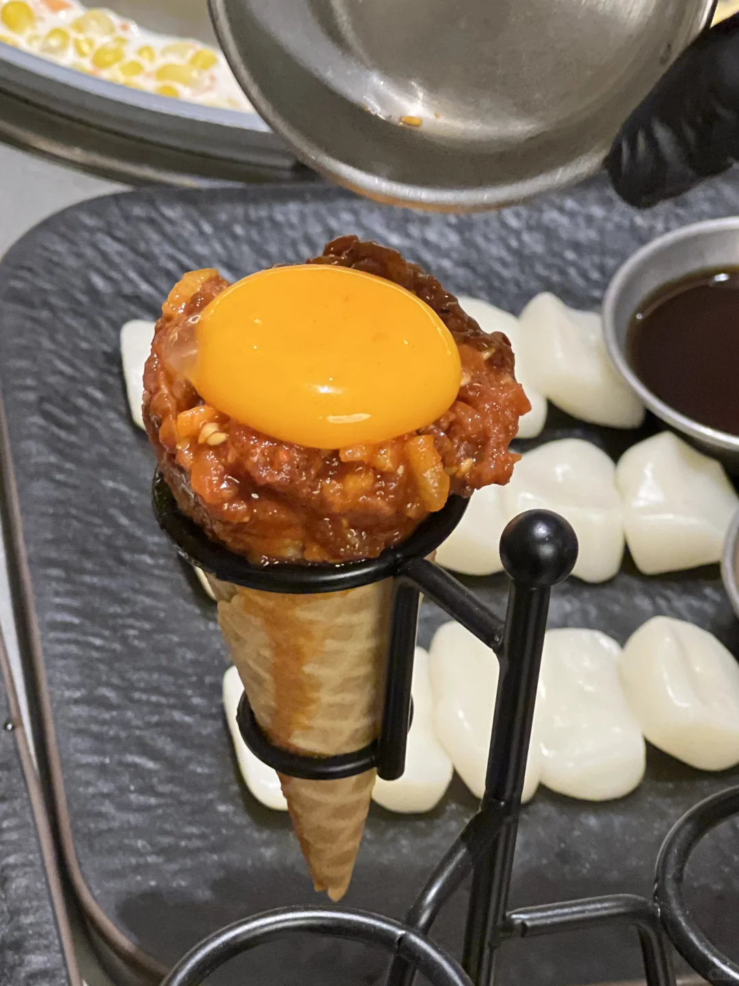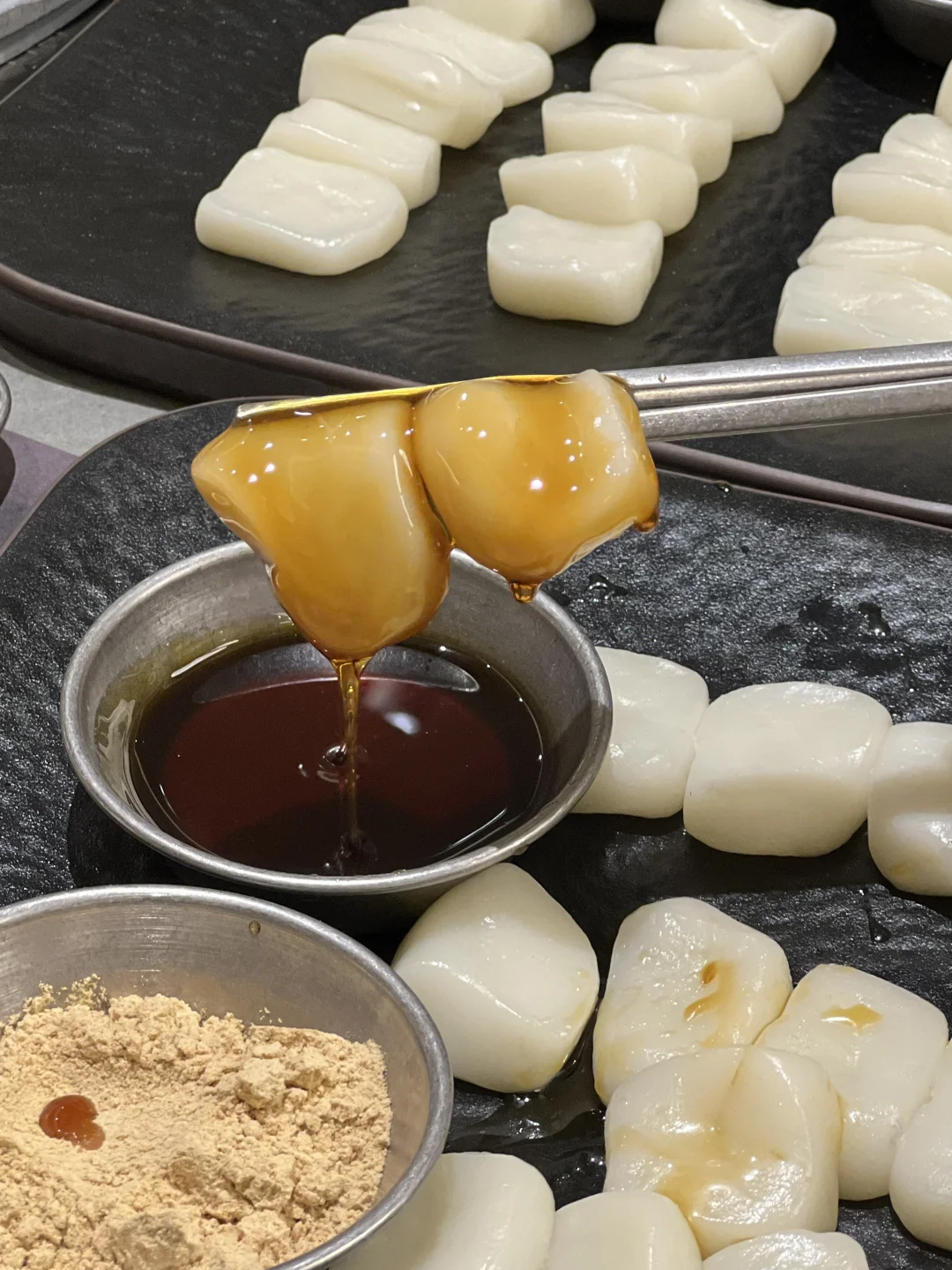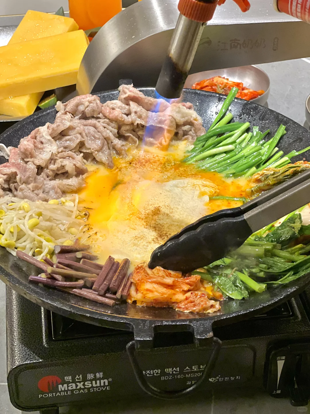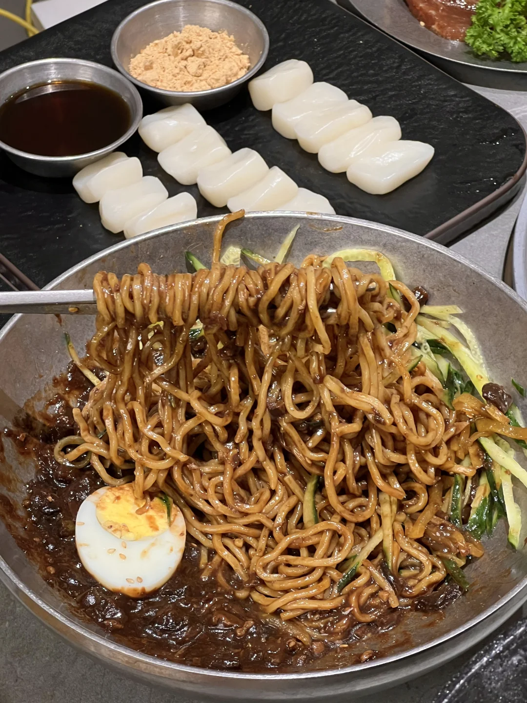 和韩国吃的一样一样的!!无敌了 ▪️蜂蜡五花肉也太好吃了!不用烤的很焦都好好吃!不油腻!蘸酱嘎嘎香~好有胶质感! ▪️肥牛七彩锅全都是现场火烤熟的!加入鸡蛋液!再用七彩饼包着吃好鲜嫩啊! ▪️芝士菠萝鸡火鸡面 鸡肉好甜嫩啊~芝士好醇厚!跟火鸡面裹在一起,好好好好浓郁! ▪️打糕!!好好好软乎乎~真的和平常吃的不一样!糯唧唧!裹上红糖和黄豆粉超爱的!! 各种烤肉、辣鸡爪、生拌牛肉都好好吃🤤无雷无雷!