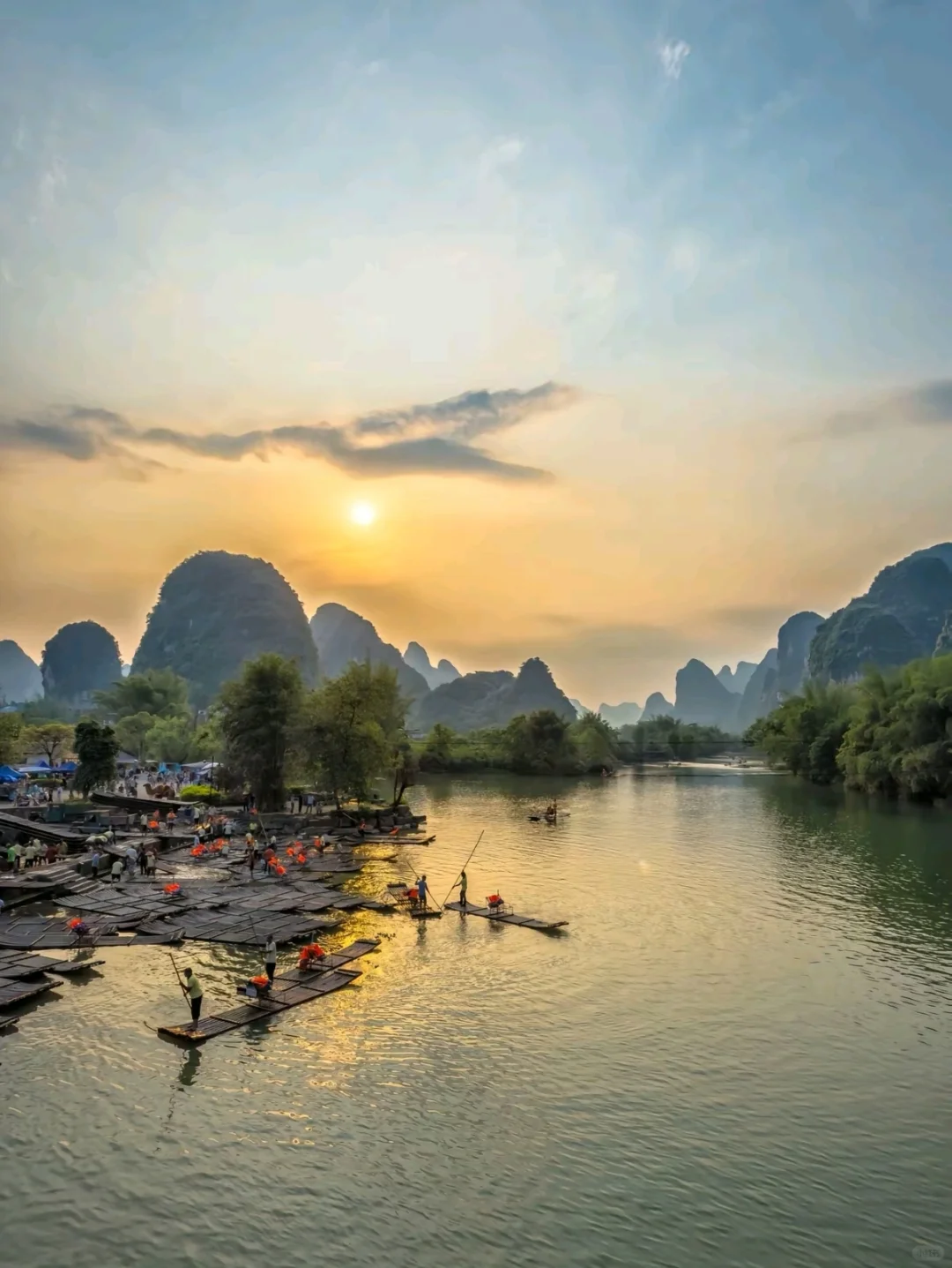 🔺遇龙河漂流:来阳朔必玩项目,乘坐特色的竹筏漂流在遇龙河上,两边就是十里画廊风景绝美🍀,而且无论什么天气都各有千秋,不会踩雷。还有漂流时的冲坝体验也很有趣