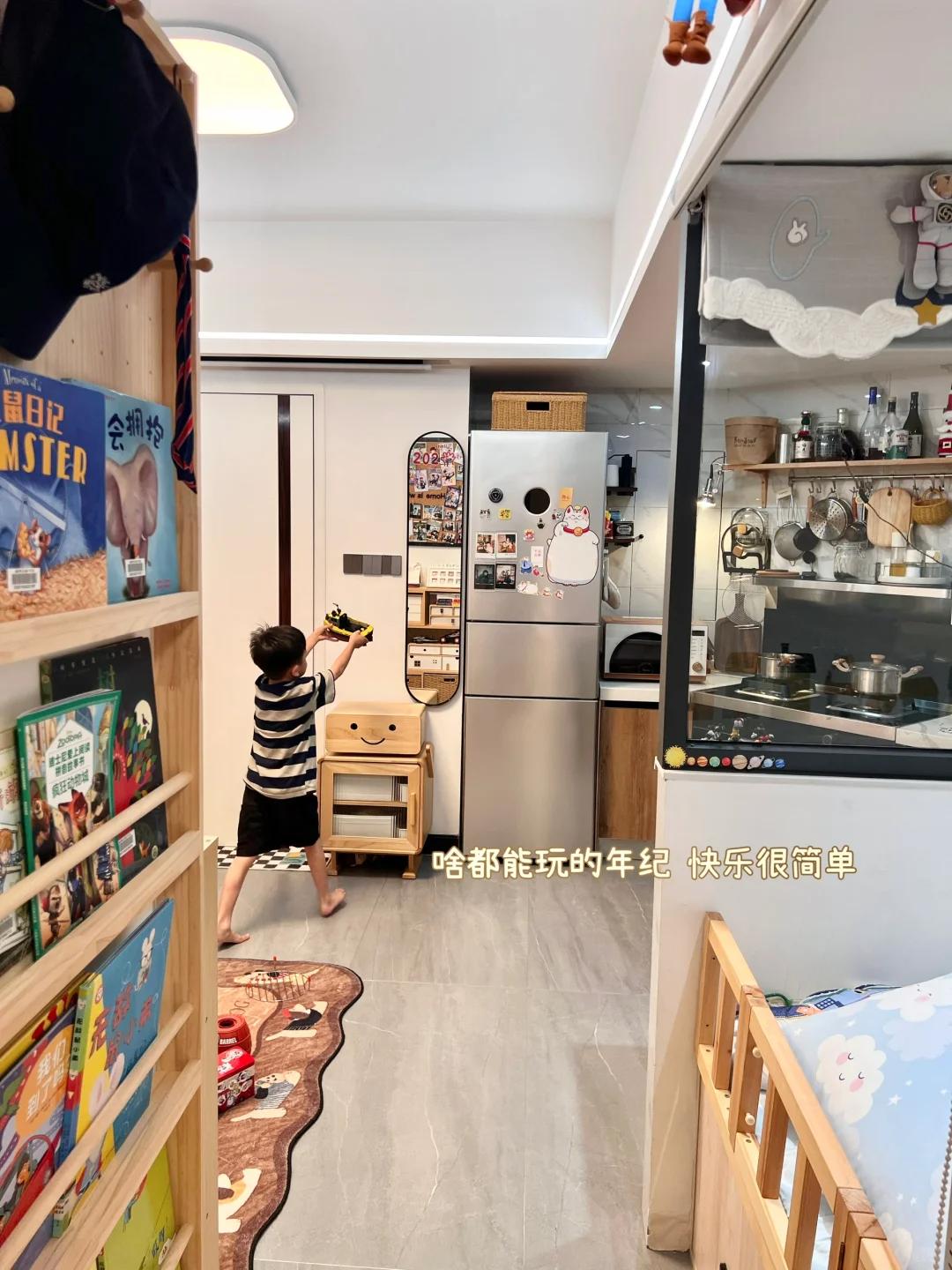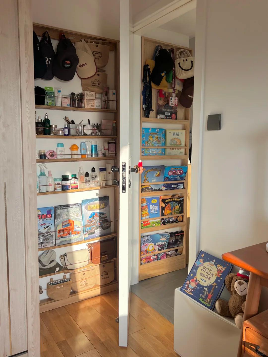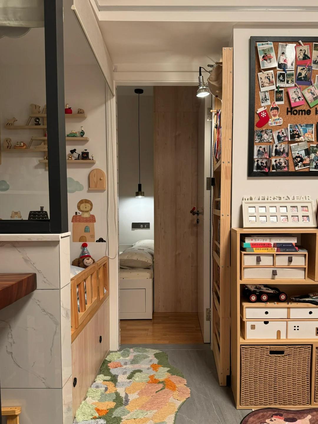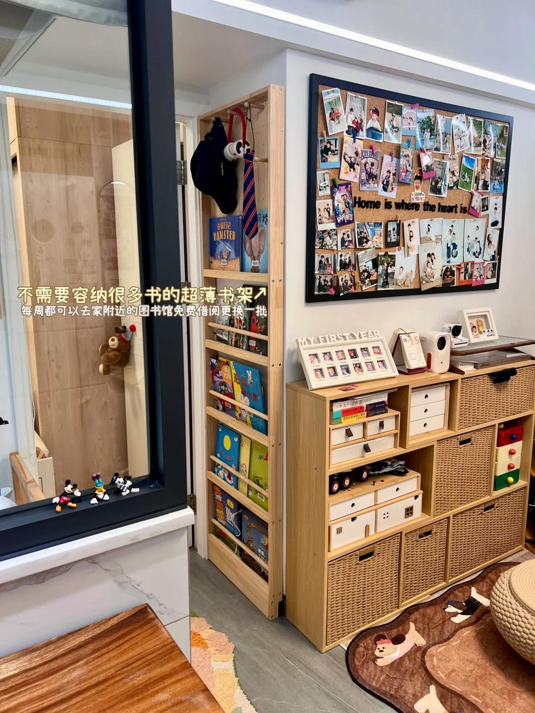 就连卧室门槛侧壁的小窄墙,博主也利用起来了,她直接定制了一个超薄的书架,小孩各种书籍都可以放在里面,一点死角都没有浪费。