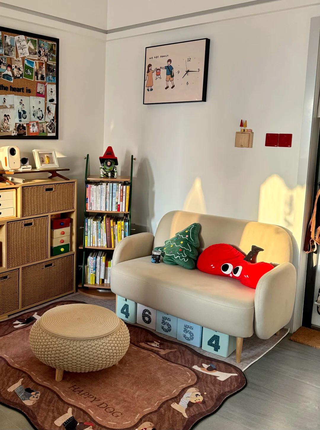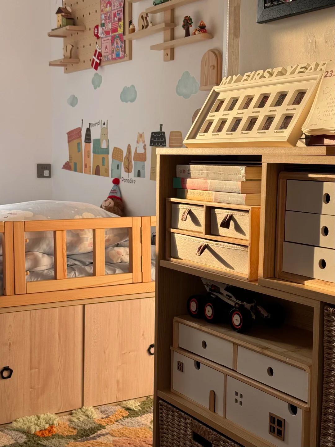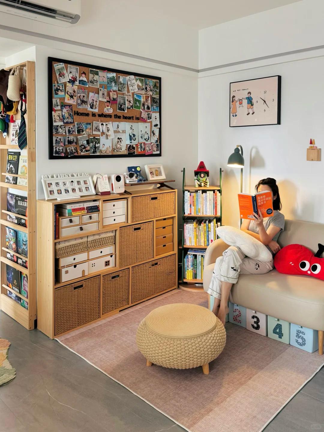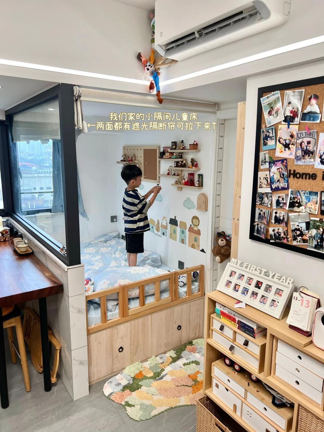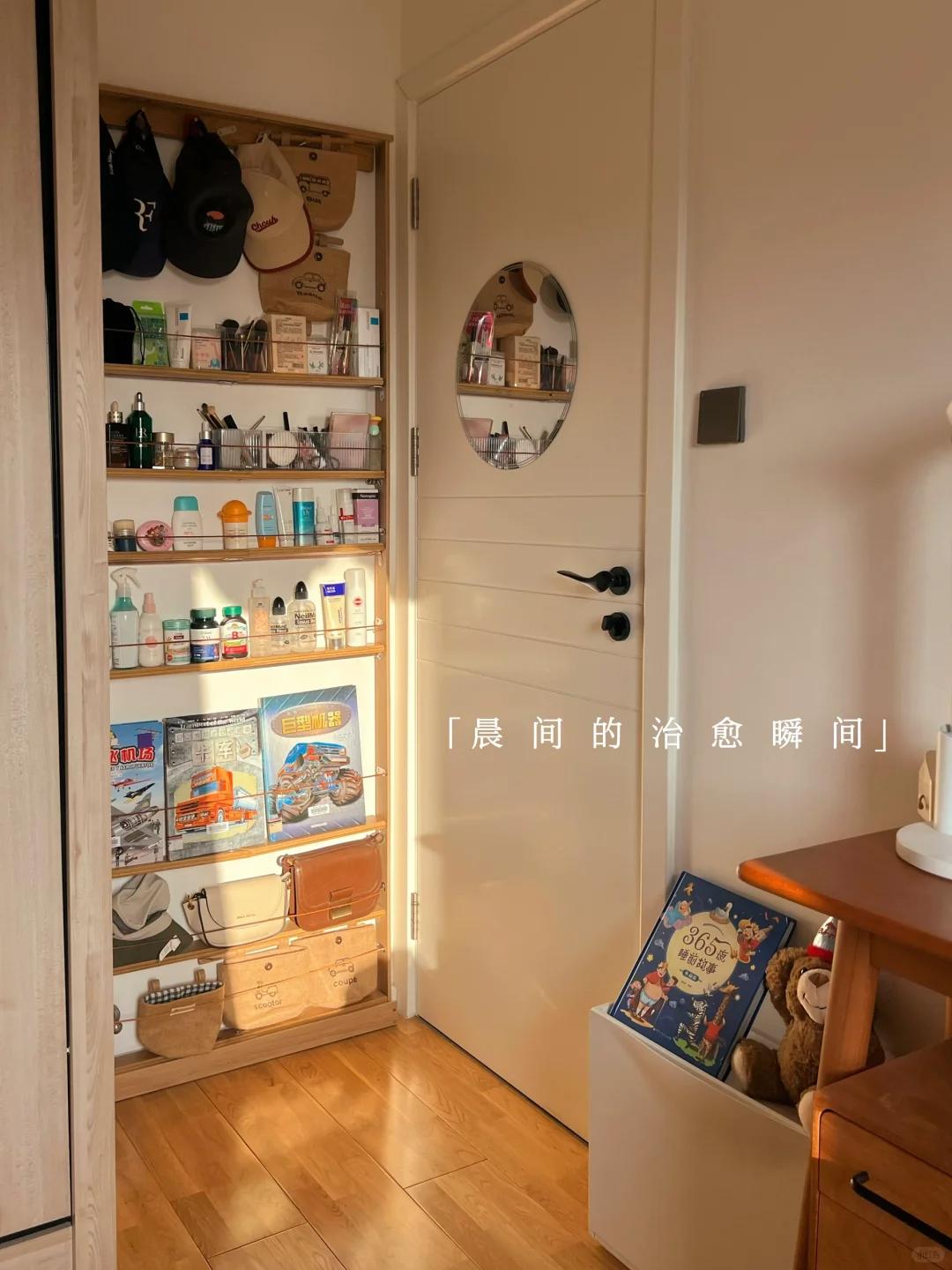 就连卧室门槛侧壁的小窄墙,博主也利用起来了,她直接定制了一个超薄的书架,小孩各种书籍都可以放在里面,一点死角都没有浪费。