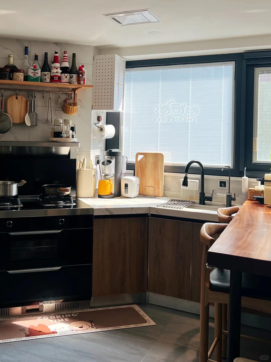旁边的厨房也直接布置成开放式的,橱柜是博主自己定制的,根据她的烹饪习惯,将垂直空间利用起来,日常的时候,厨具都是放在橱柜内部,突然来客人,也不会觉得杂乱。