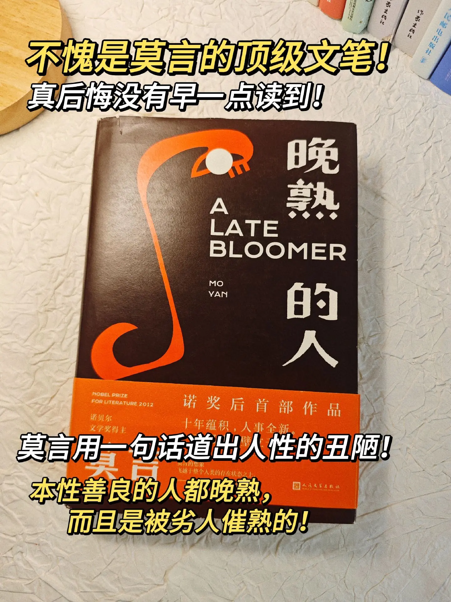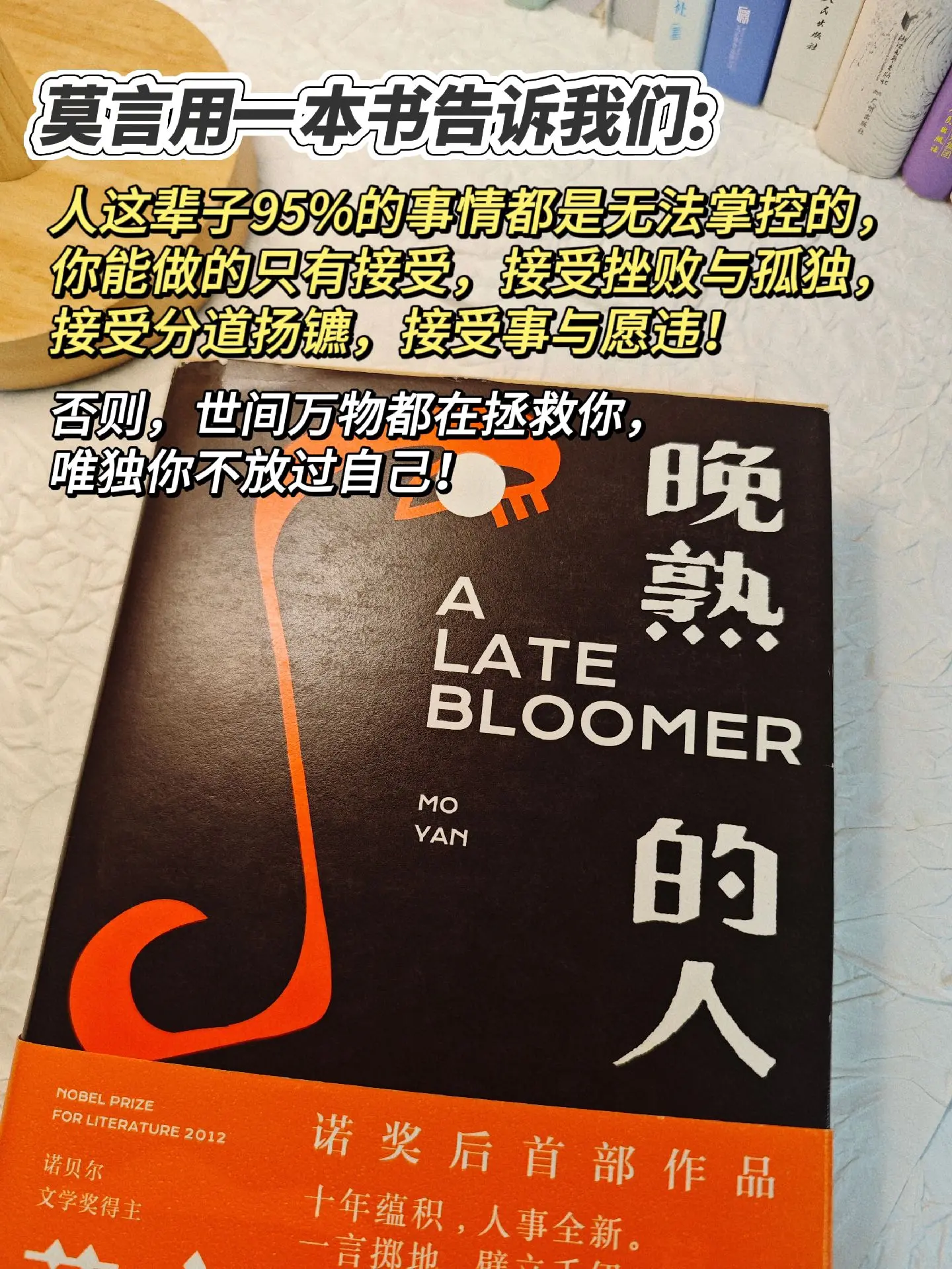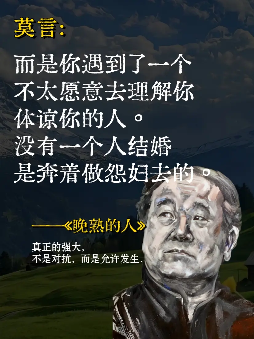 天哪😭莫言太会写了,治愈了我的精神内耗。莫言用一本书告诉我们,我们这辈子有95%的事是无法控制的,你抓的越牢越会失去它,你能做的只有接受,接受世事无常,接受事与愿违,接受失败和孤独。其实真正的强大不是去对抗,而是允许,允许一切的发生!这是莫言获得诺奖后的首部作品,写尽了世间百态,道尽了人情冷暖,读完瞬间醍醐灌顶!