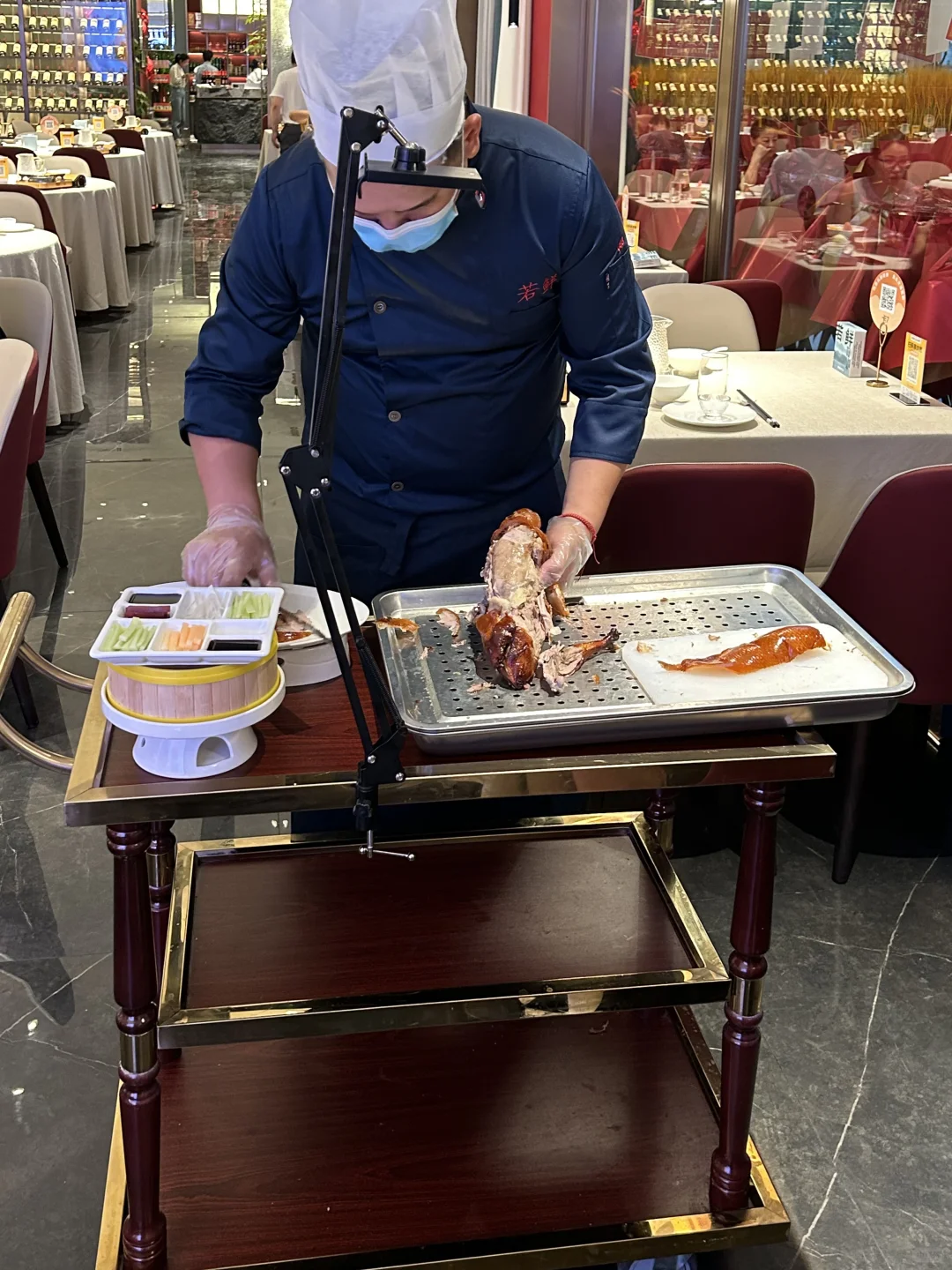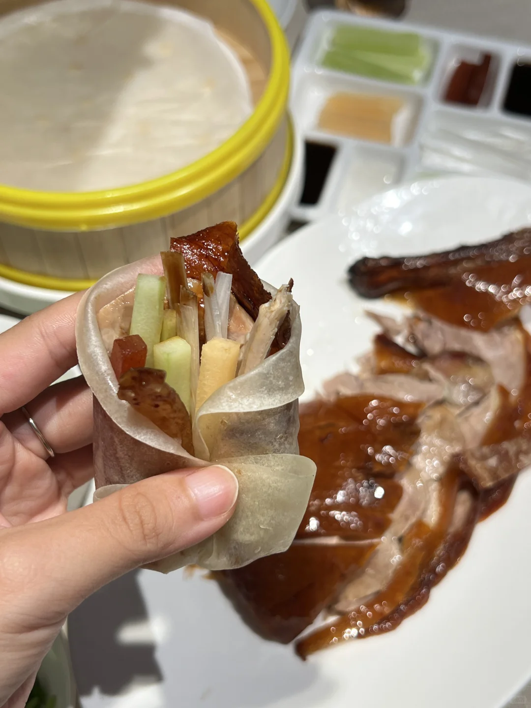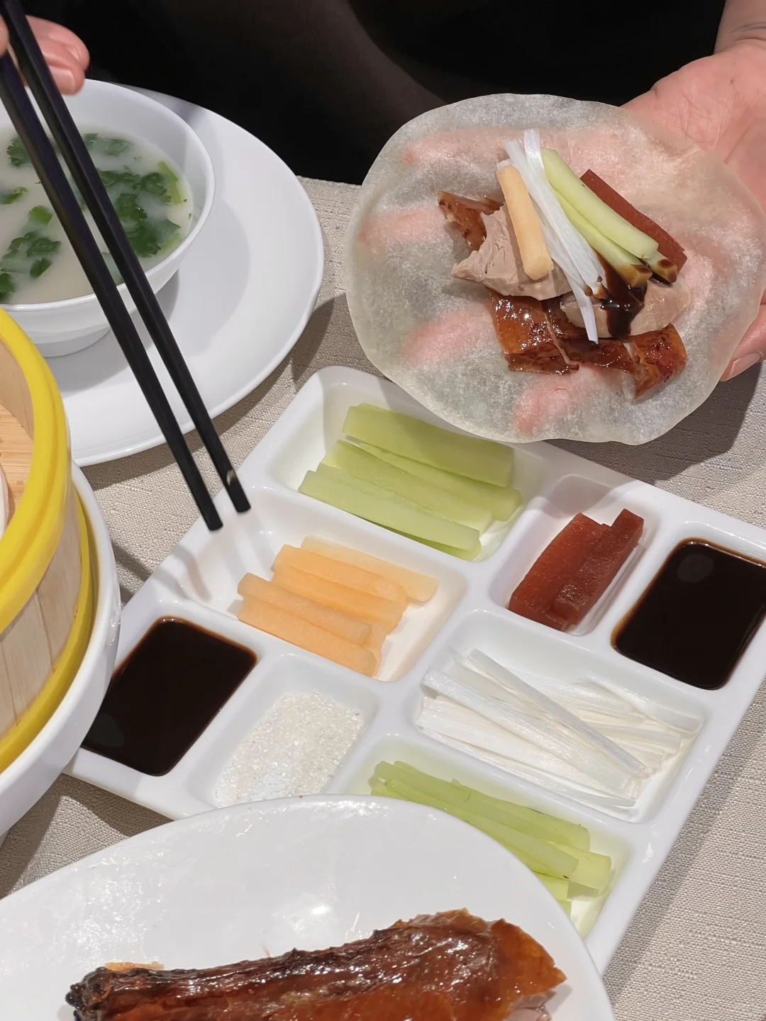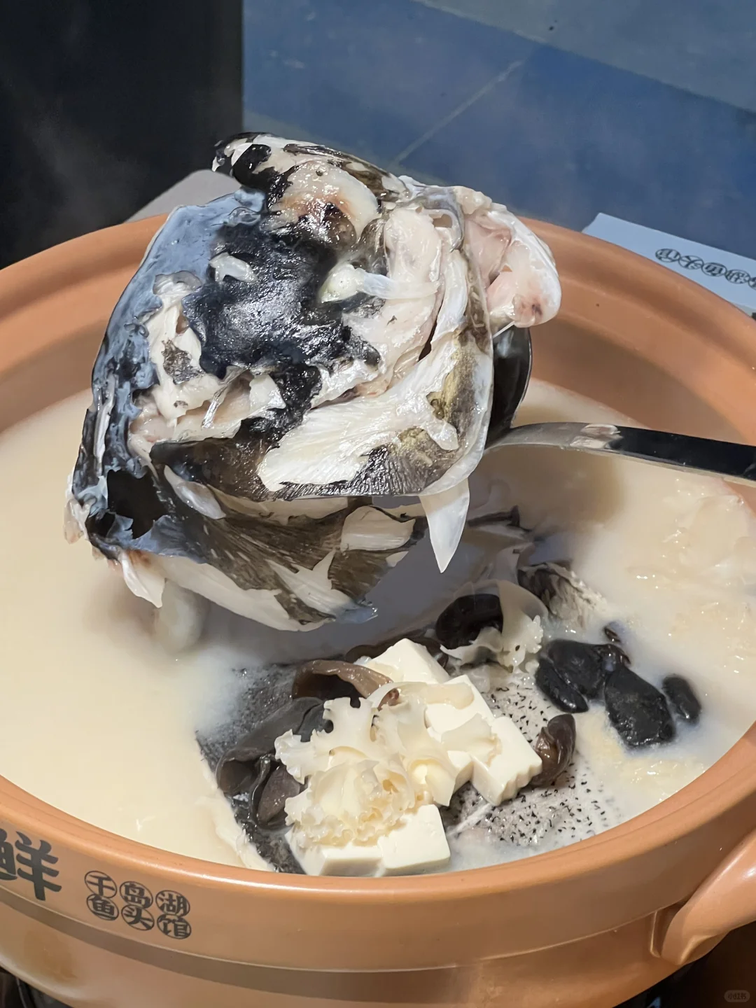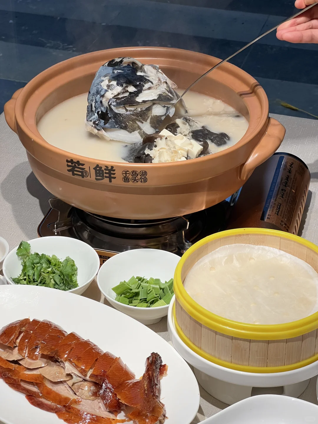 新鲜鱼头汤!海鲜明档很新鲜,种类很多!! 鱼头汤是店里的招牌!白花花的好像牛奶!很嫩的鱼肉!鱼头很大,汤熬的很入味,加上香菜胡椒粉更加好喝!不愧是千岛湖直运~ 烤鸭是师傅现切的,外酥里嫩!薄饼加上烤鸭,黄瓜,葱丝,甜面酱…这一口好满足! 小炒也好好吃!!!上桌就忍不住动筷的程度! 店里环境很明亮干净,进去就让人觉得很舒服!
