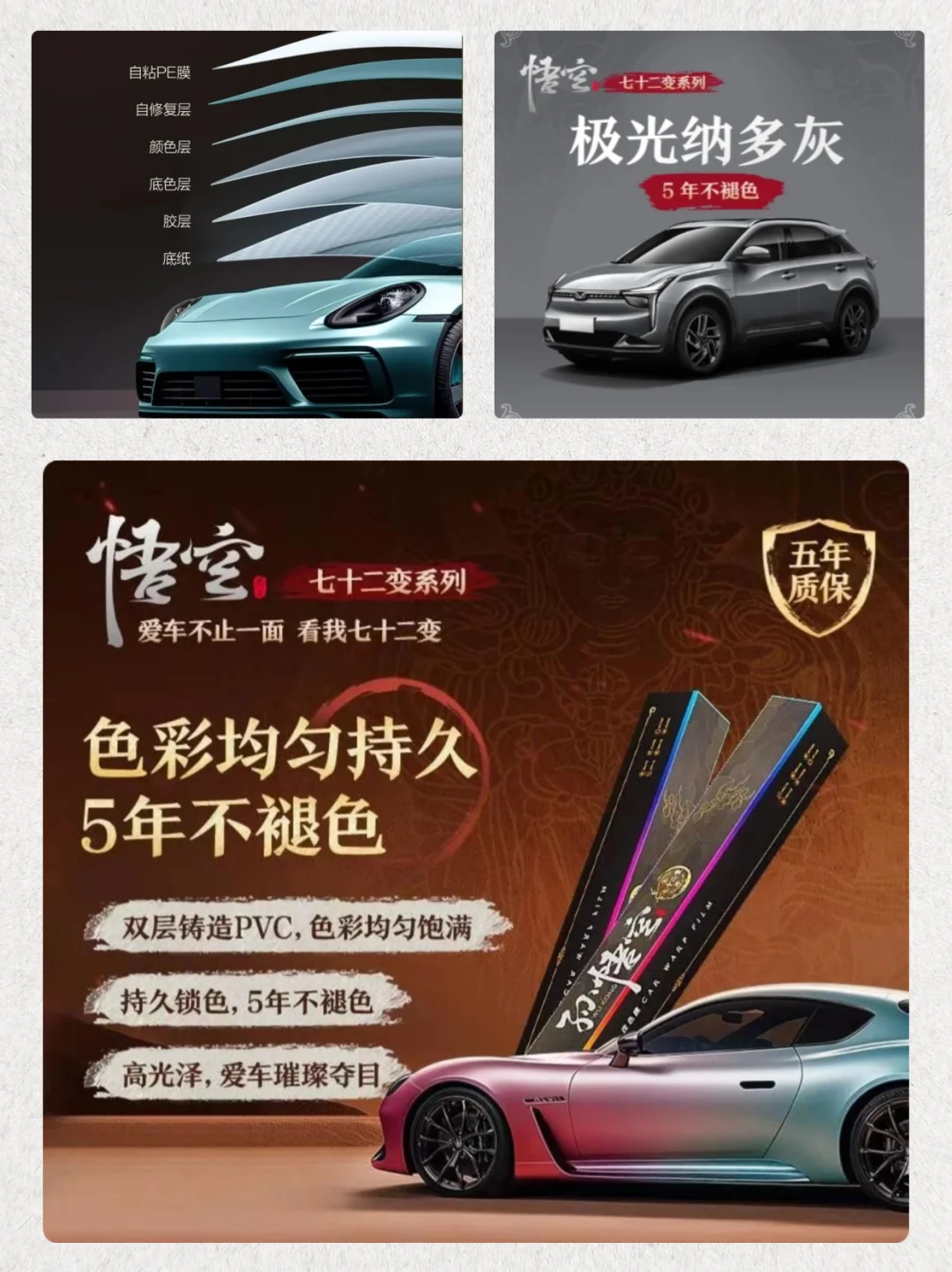 今天给大家推荐这款🔥孙悟空“七十二变系列”改色膜它是采用双层铸造级PVC薄膜,色彩均匀、鲜艳,能够抗紫外线、抗老化,✔️用个五六年不成问题。而且拉伸率>300%,施工时不易出现气泡或者翘边。