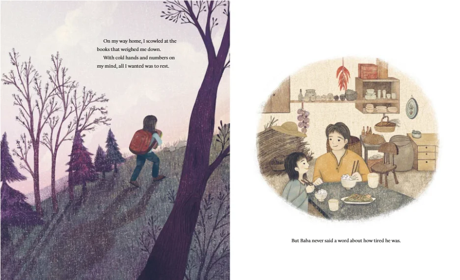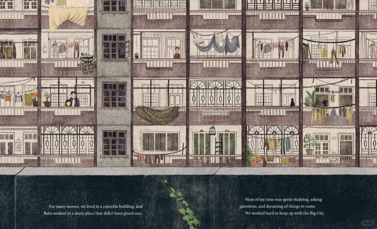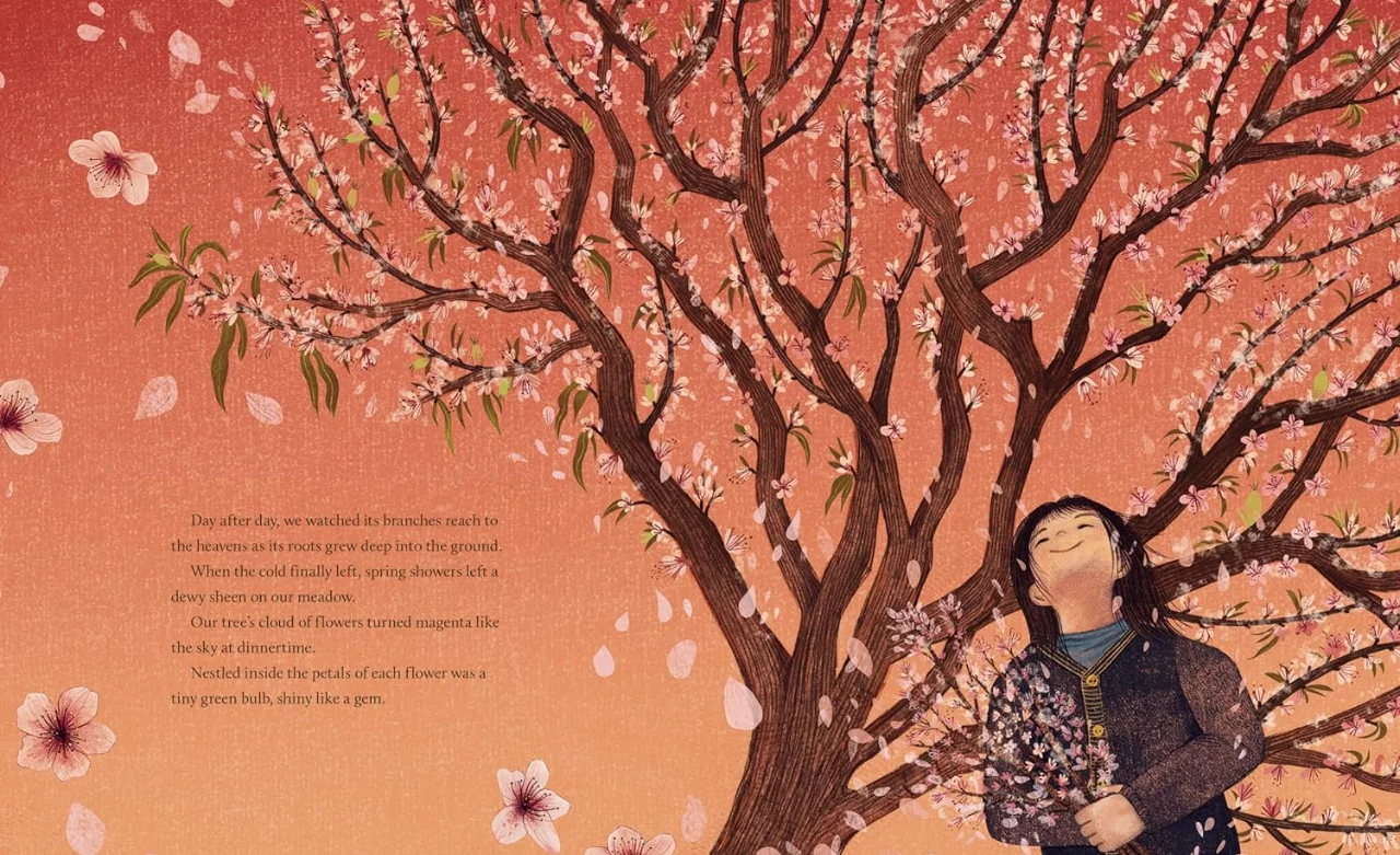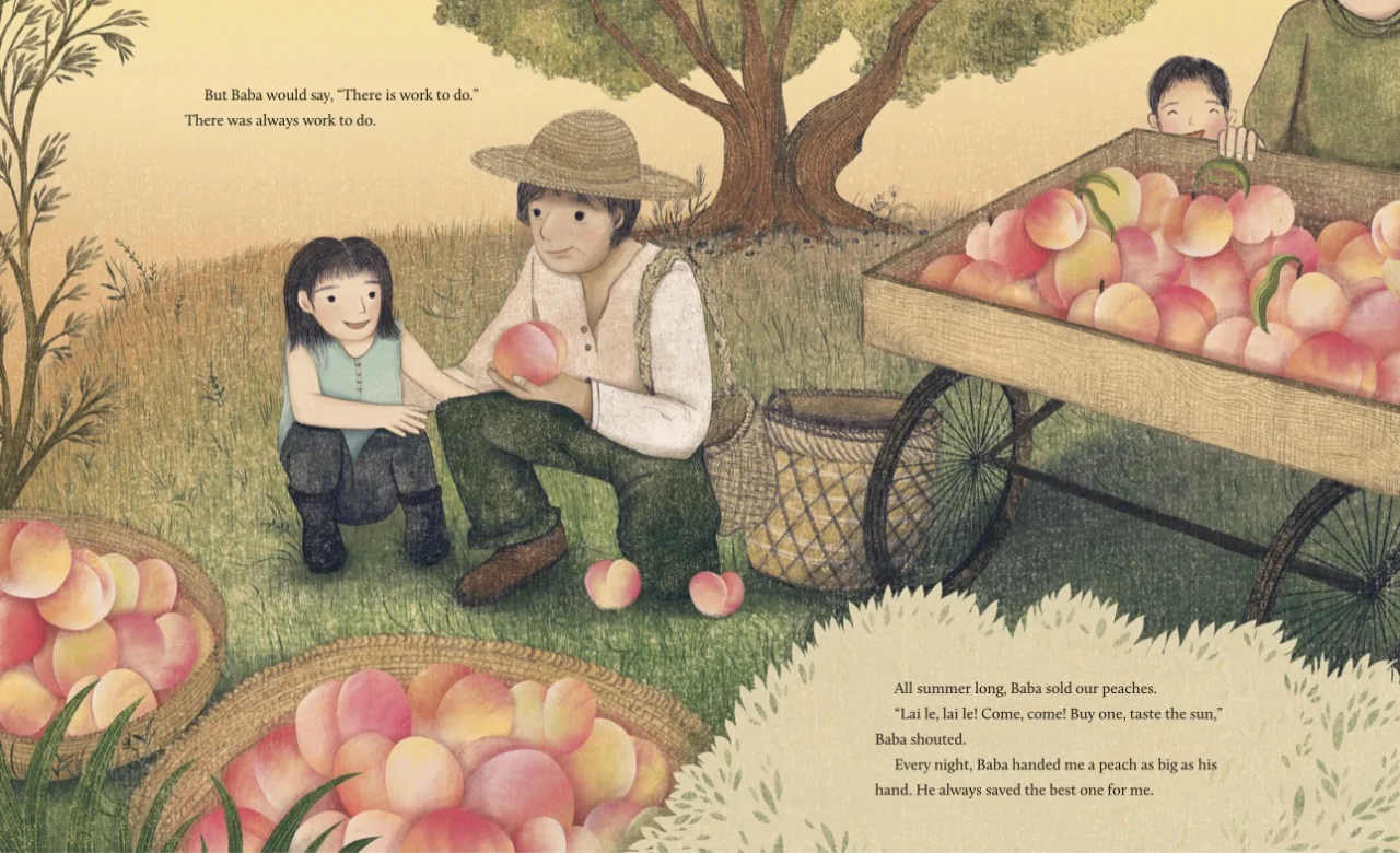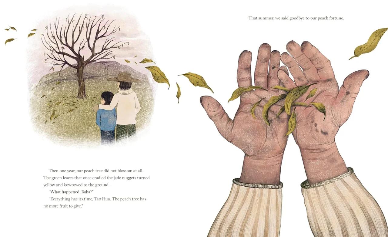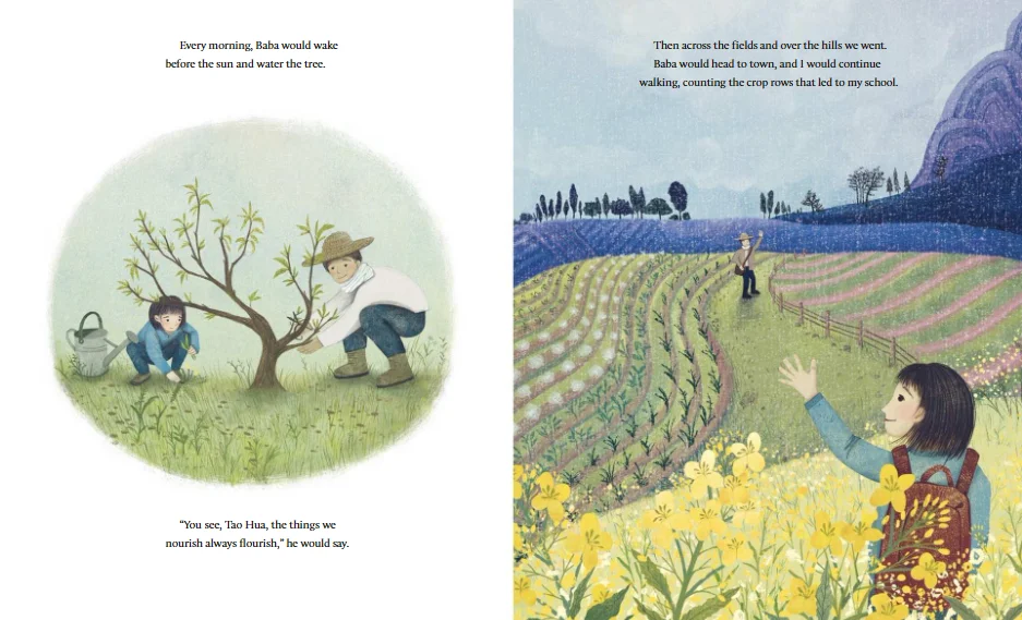 一天,他们在石屋后面发现了一颗桃树,象征着好运的桃树。爸爸说这是一个祝福,就像好鞋、热米饭和书一样。