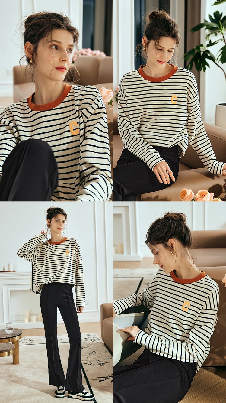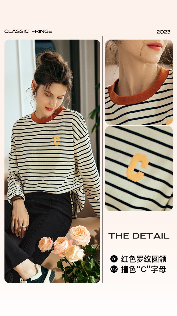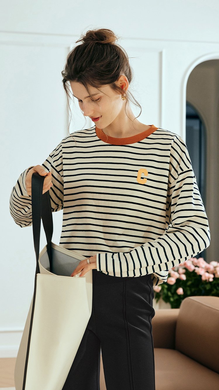 甄选环葆有机棉面料,吸湿透氣;舒适护暖,紧致密实,质感好不易起球;胸前领口撞色字母设计,增添趣味感;经典黑白条纹,可单穿、可内搭,实穿性强;条纹多次改良粗细适中,拒绝视觉膨胀感