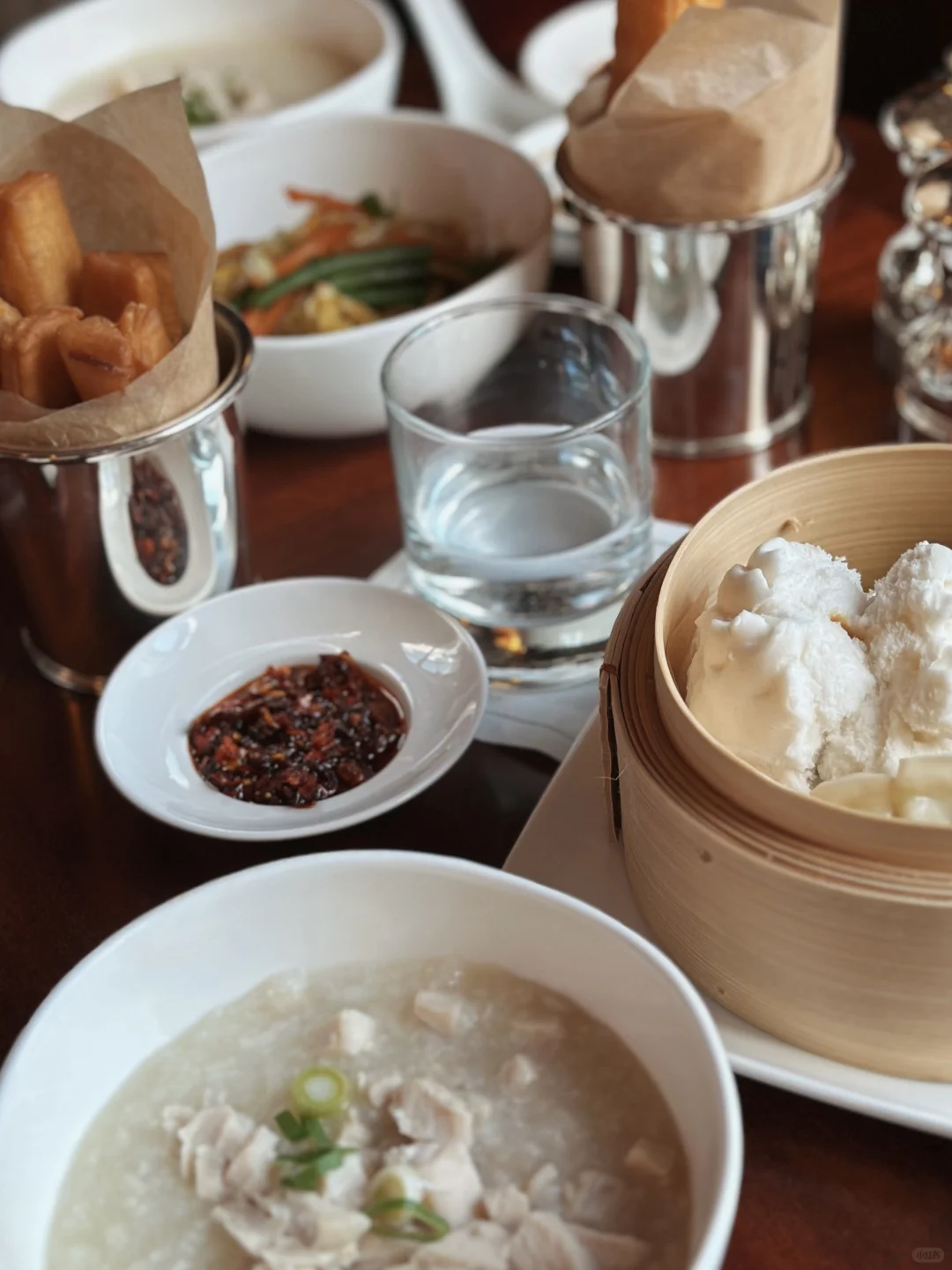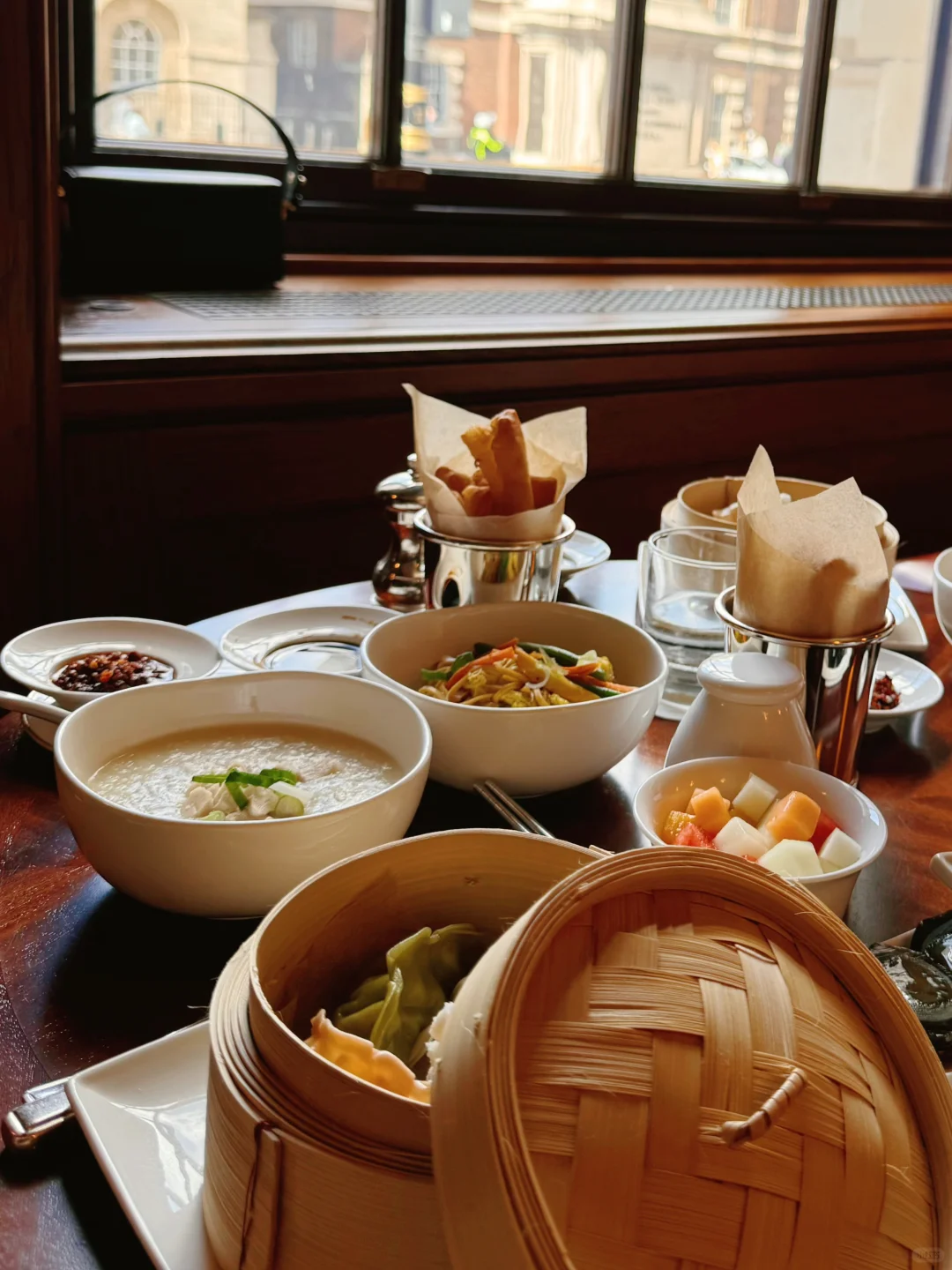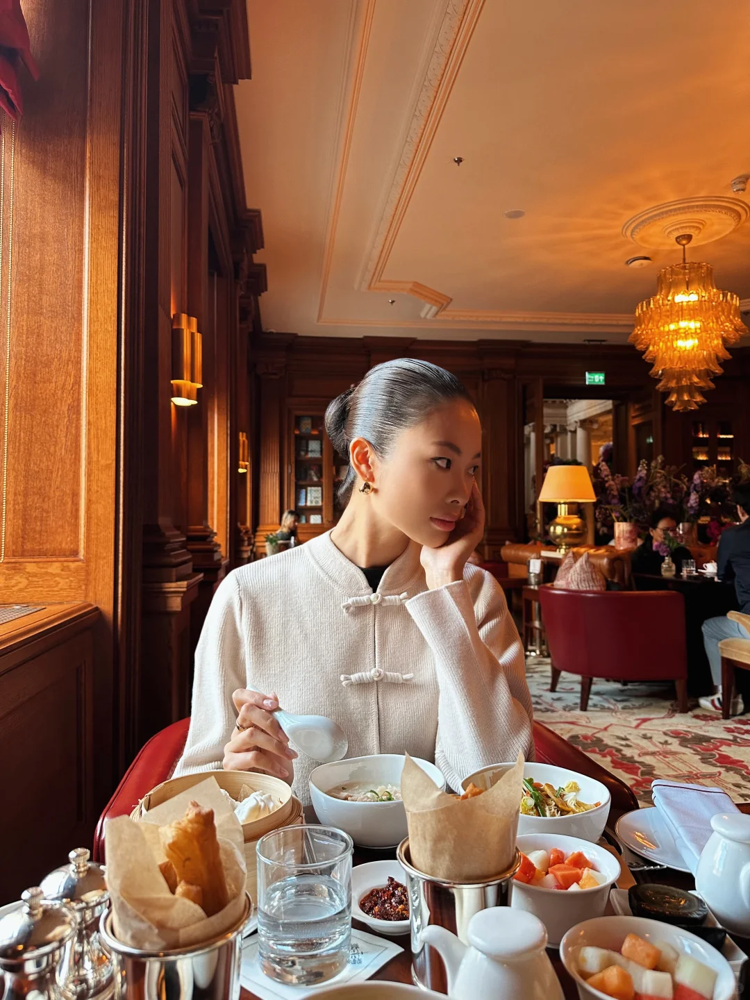 温热的鸡丝粥,酥脆的油条,精致的粤点,配上细腻的英式服务与环境,此刻东西方的碰撞是如此强烈。有那一瞬间让我感觉民国小姐生活应是这般。