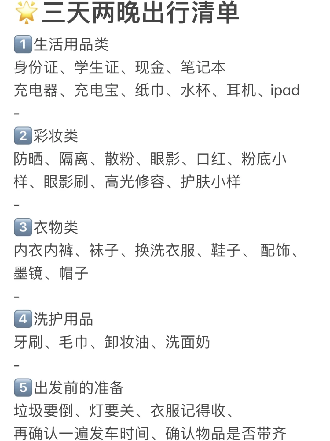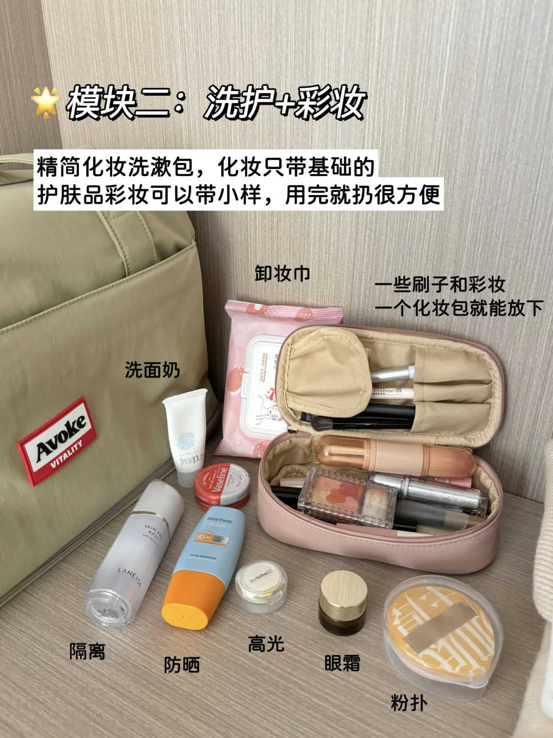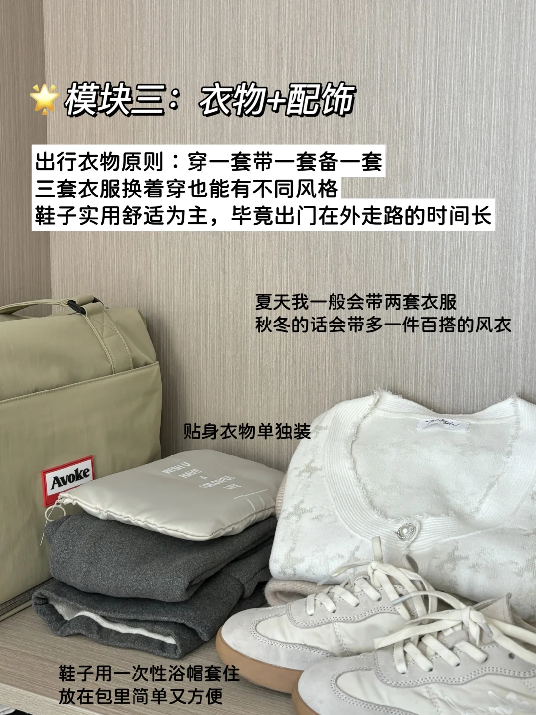 自从开始精简生活之后,🚶‍♀️出行也变得更加简单 现在一个双肩包就能搞定3天2夜的行李🧳 主打精简、自在、轻装上阵 - 分享一些我的出行精简思路: 🌟一个实用的包包 外出旅行我会带一个容量足够大的旅行包 防水防油防污,可以适应各种场合 整个包重量比一瓶水💧还轻,拎着也不觉得累 多隔层设计方便随拿随取 底部有隐形拉链,快速扩容多一倍收纳空间 - 🌟出行必带清单 1️⃣模块一:证件及电子产品 生活用品只带必须的 水杯、雨伞、纸巾、充电宝随身带 可以节省不必要的开销,随拿随取 - 2️⃣模块二:洗护+彩妆 精简化妆洗漱包,化妆只带基础的 护肤品彩妆可以带小样,用完就扔很方便 - 3️⃣模块三:衣物+配饰 出行衣物原则:穿一套带一套备一套 三套衣服换着穿也能有不同风格 鞋子实用舒适为主,出门在外走路的时间长 - 现在出行一次比一次更精简 从20寸行李箱到现在只带一个包 虽然东西变少了,但出行体验却更好了 -