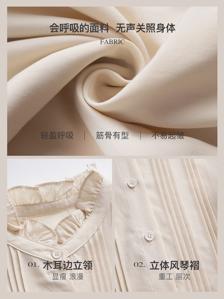 甄选时装梭织料,柔软亲肤,不易皱好打理;小立领木耳边,彰显优雅气质,散发魅力;前中门襟简洁单排扣点缀,美观好穿脱;前中风琴褶,优雅浪漫不刻板,立体显瘦;丰富层次感的同时,支撑起衣身筋骨感;泡泡袖修饰肩形和手臂,进一步塑造优雅造型