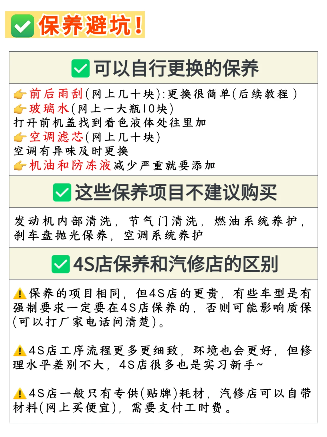 很多姐妹对汽车保养一头雾水,每次去 4S 店都被工作人员说得云里雾里,各种推荐的保养项目让人不知所措。😵其实,汽车保养并不复杂,只要按照正确的周期和项目进行,了解什么该保养,什么项目没必要保养,就能保持良好的车况,记住不要销售推荐什么就保养什么! ➡️另外,每台车的车况不同,保养项目也会有所差异。除了基础保养,要根据实际情况判断是否需要做其他项目。⚠️不同汽车品牌的耗材也不一样,不会汽车保养的姐妹,可以留言我帮你解答~