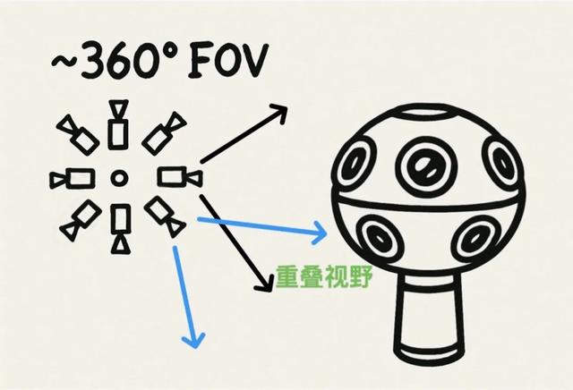 为了获得真·全景图像,我们可以用多摄像头组合,同时拍摄各个角度的画面,用算法把照片拼接融合成一个环带画面,或者球面的立体画面。