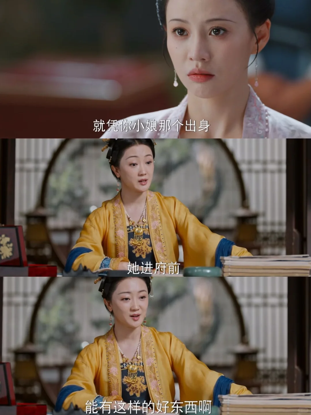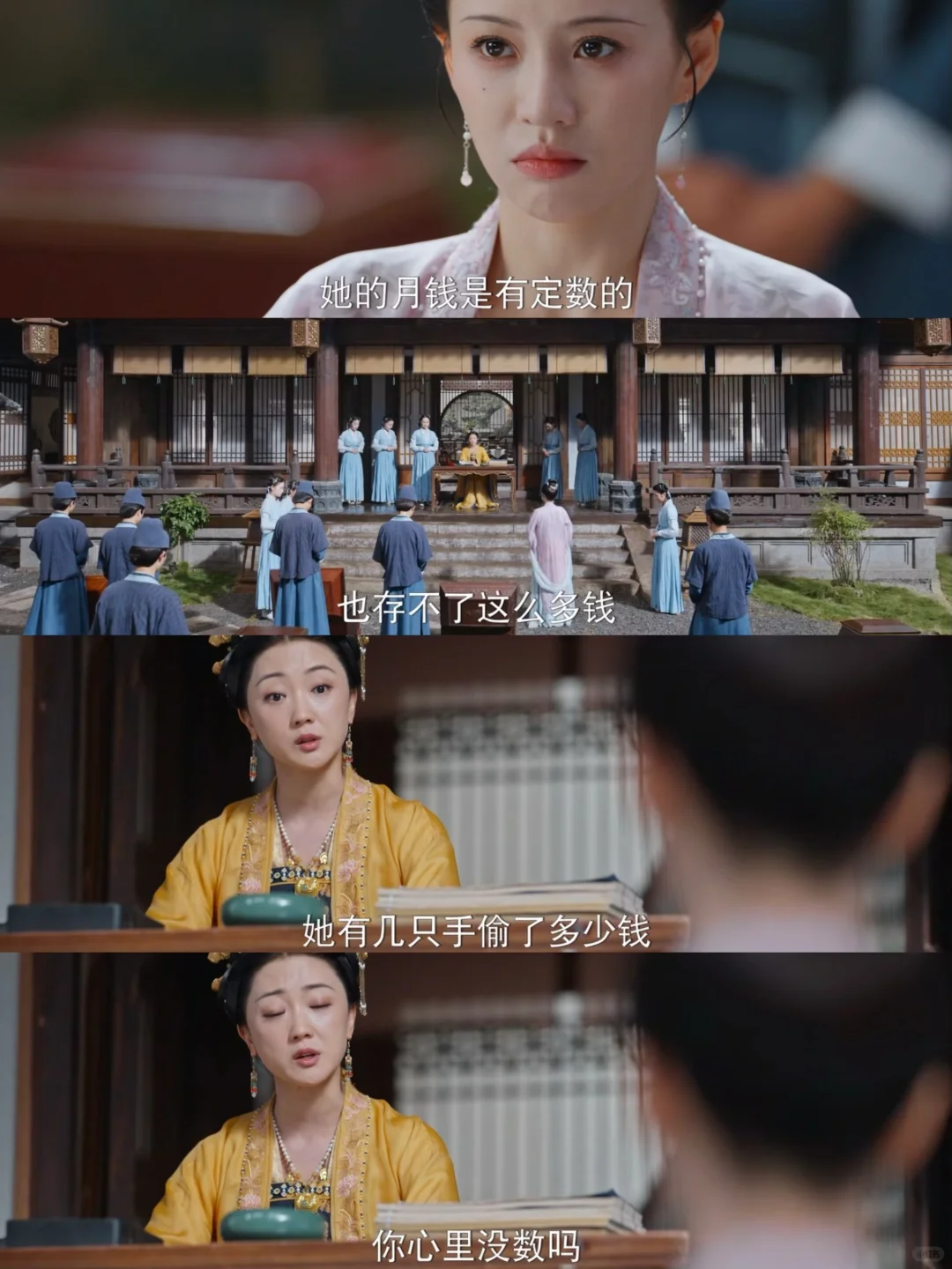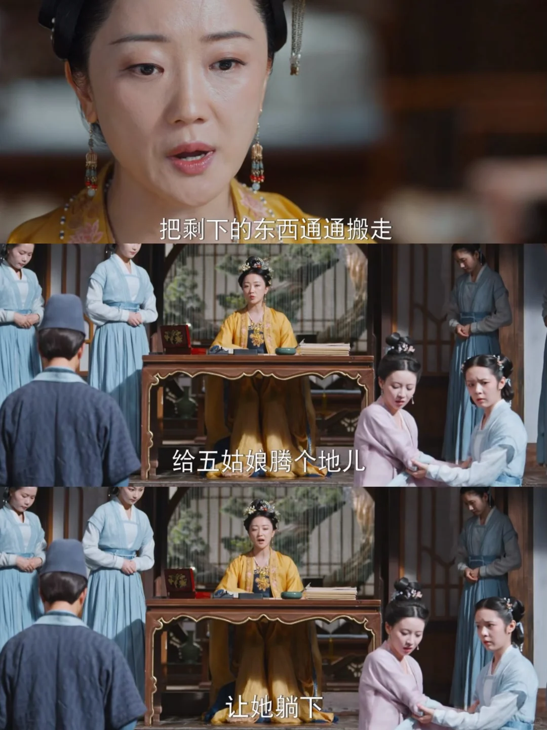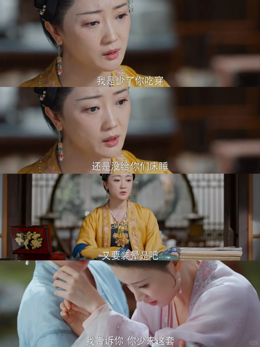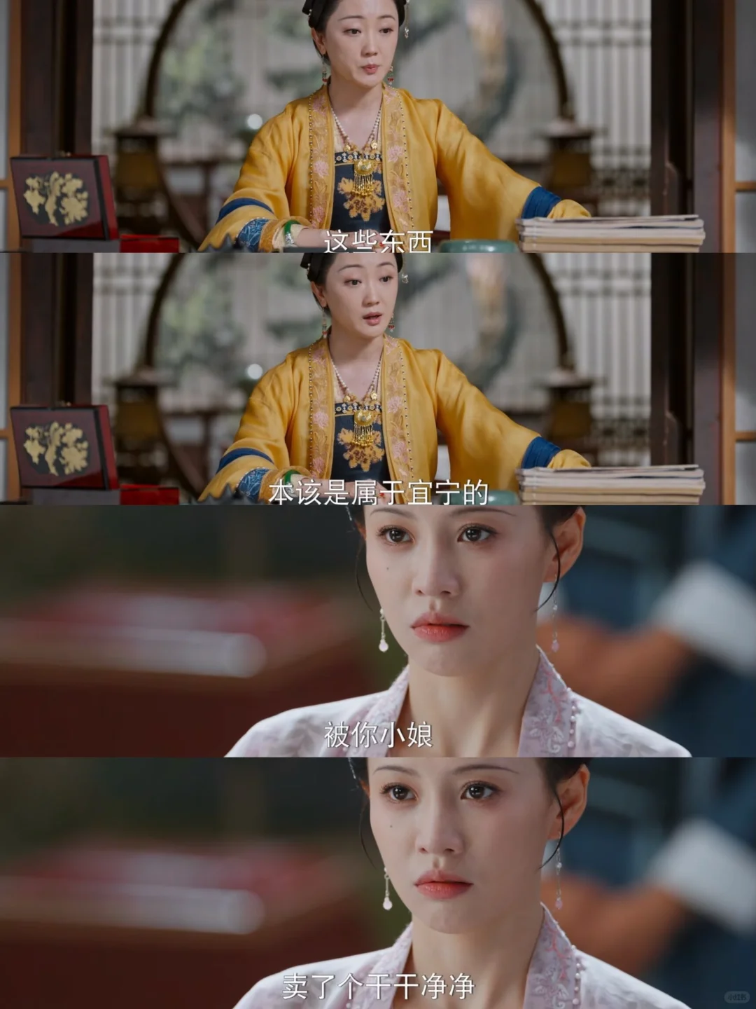 乔小娘倒了,大娘子过来查东西,发现了罗宜宁母亲的遗物,刚准备带走,罗宜怜就跑来说这是母亲的,被揭穿后,又说是父亲送的,再次被揭穿后,就装可怜,装晕。