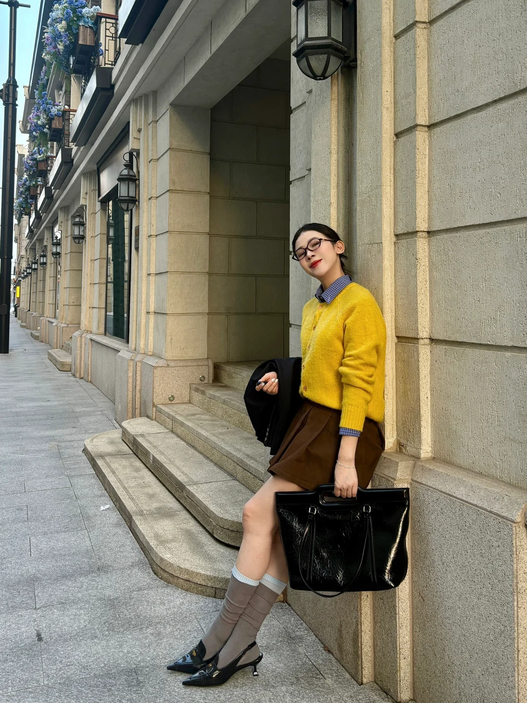 Shou下来的好处就是什么风格都敢尝试 秋冬怎样能穿的出彩 就是用亮色啊! 今天这一身就比较复古又吸睛 明黄色和咖色的搭配 真的很有秋日氛围感哦