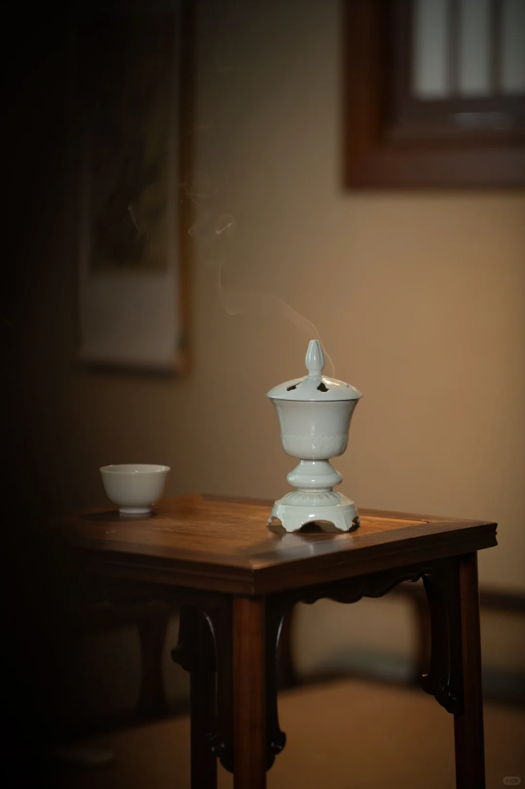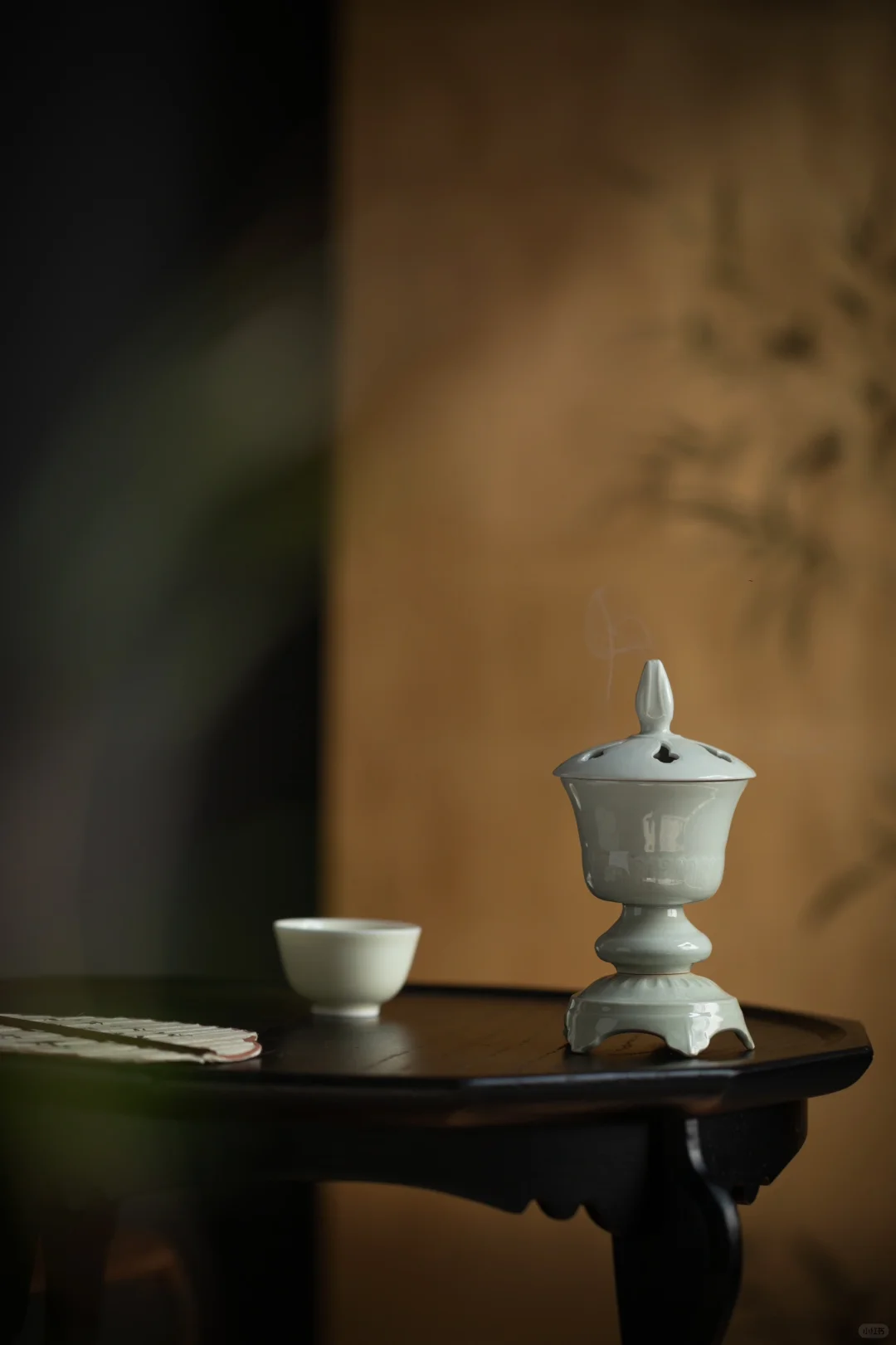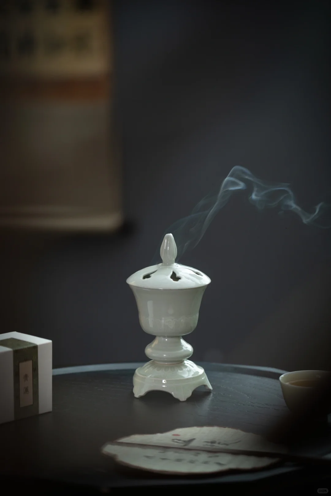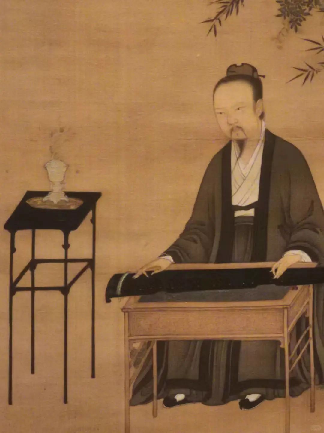 在画面中,抚琴者右侧有一黑色高几,上面摆放的香炉为白色,上部有盖,是封闭式的熏炉,底部有承盘。香炉的袅袅青烟与琴音交绕,营造出一种典雅富丽的氛围。
