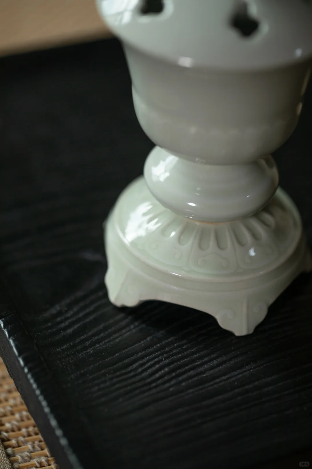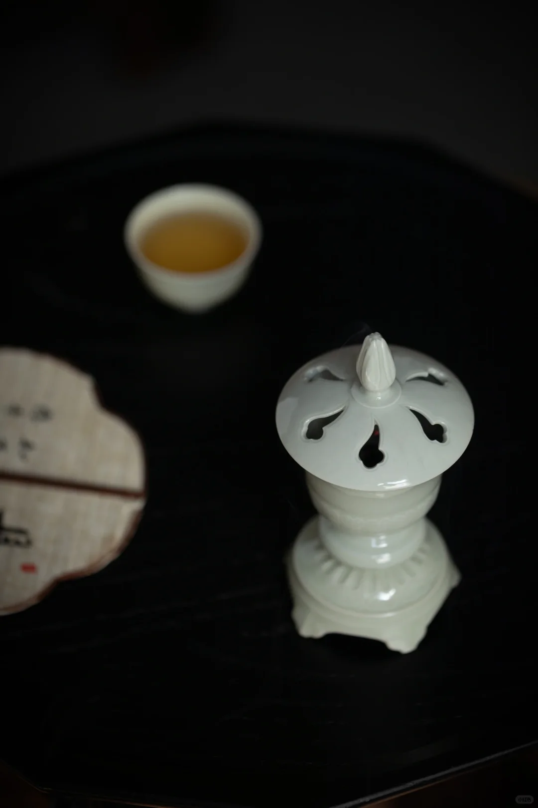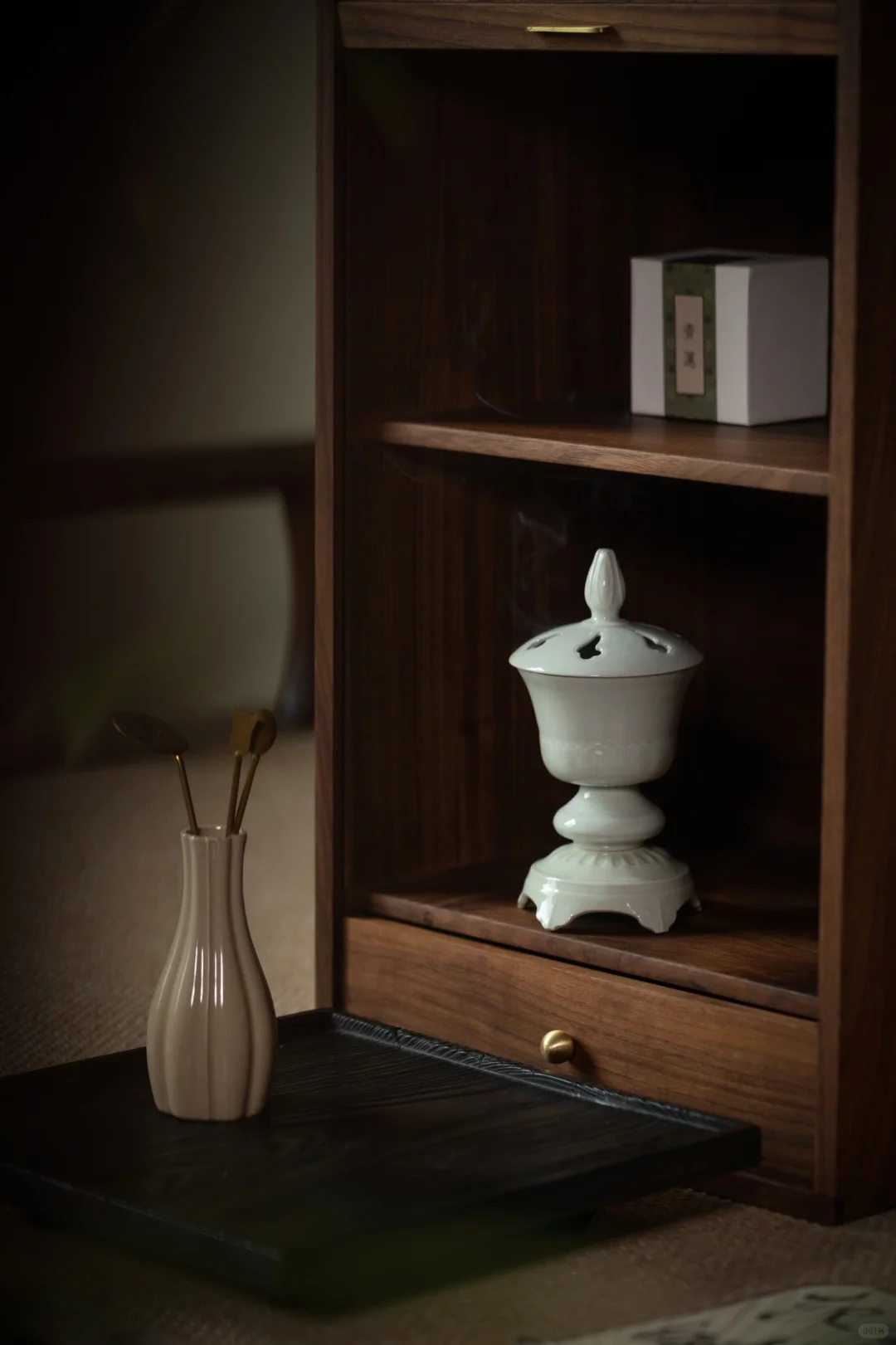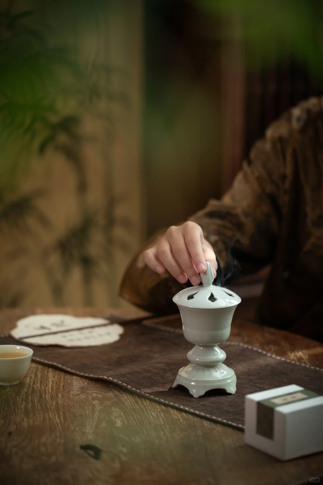 在画面中,抚琴者右侧有一黑色高几,上面摆放的香炉为白色,上部有盖,是封闭式的熏炉,底部有承盘。香炉的袅袅青烟与琴音交绕,营造出一种典雅富丽的氛围。