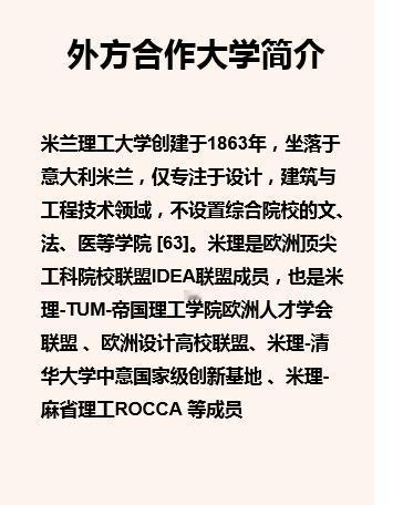 西安交通大学的中外合作办学是与意大利米兰理工大学合作共建非独立法人中外合作办学机构——西安交通大学米兰理工联合设计与创新学院(简称“西米学院”),英文名称XJTU-POLIMI Joint School of Design and Innovation, Xi’an Jiaotong University。 本科专业及招生计划 性质:计划内 联合设计与创新学院办学规模1080人,首届招生240人,开设2个本科专业,分别为工业设计(学制4年)、建筑学(学制5年) 本科学制与培养模式 采取“双学位”“双注册”“T+0”培养模式。 费用 学费为9万元(人民币)/人·年