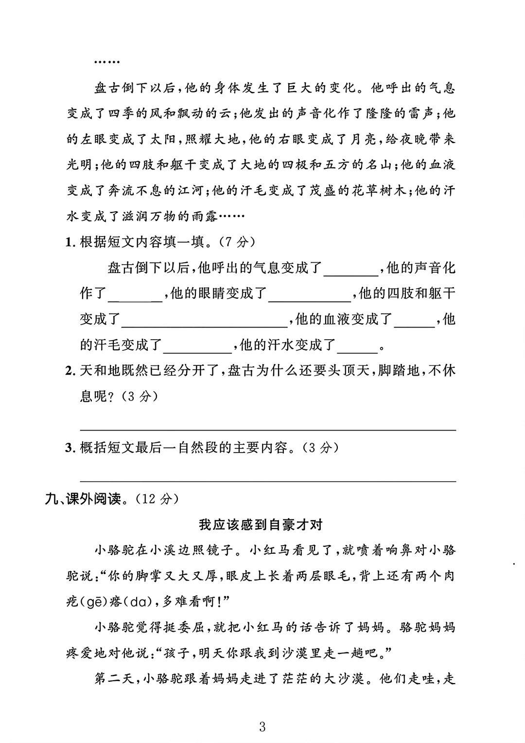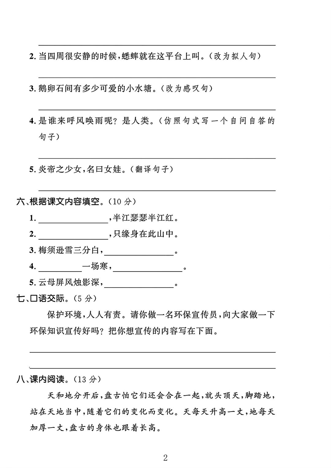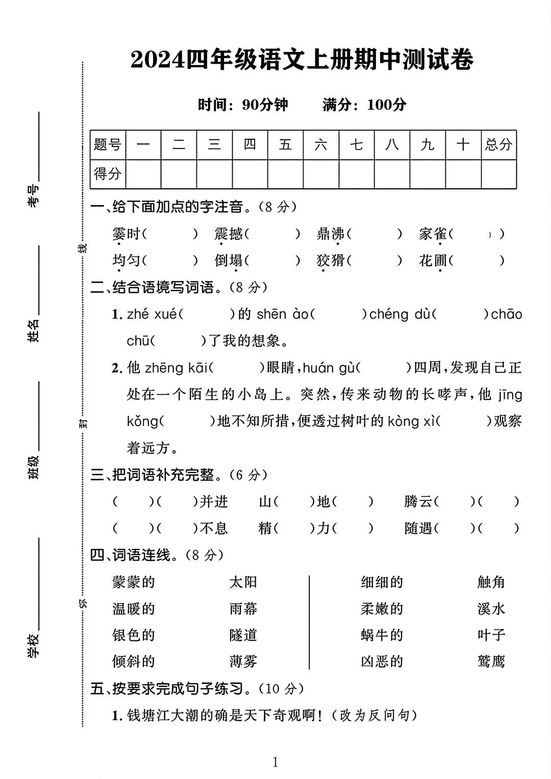 人教版 四年级上册语文 期中考试 期中测试卷 电子版可打印 试卷