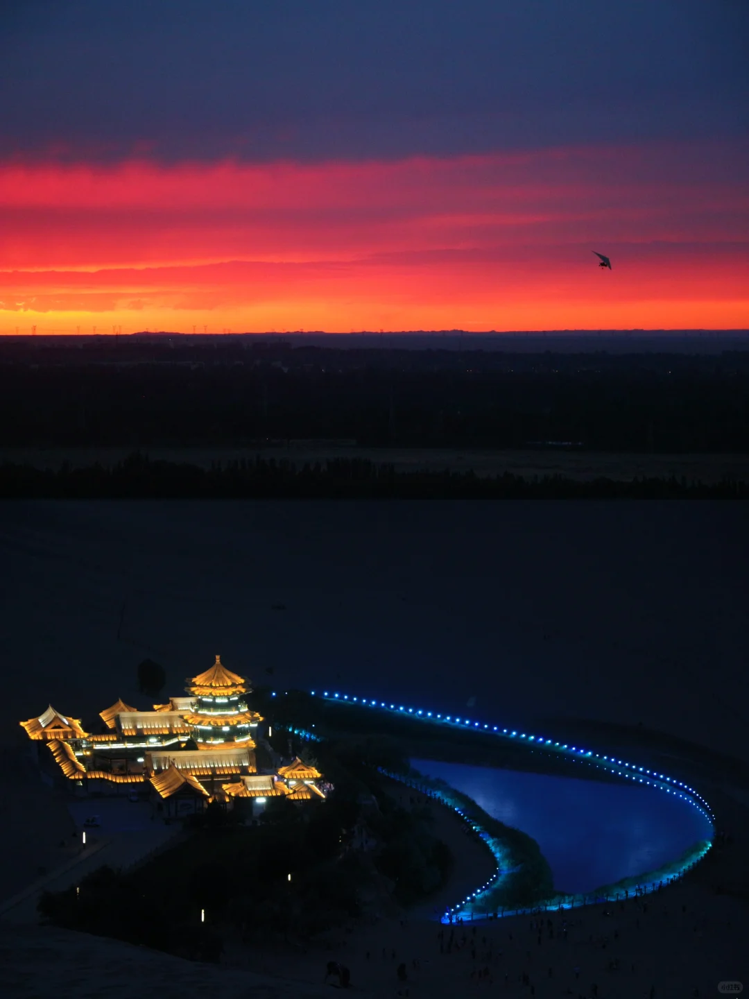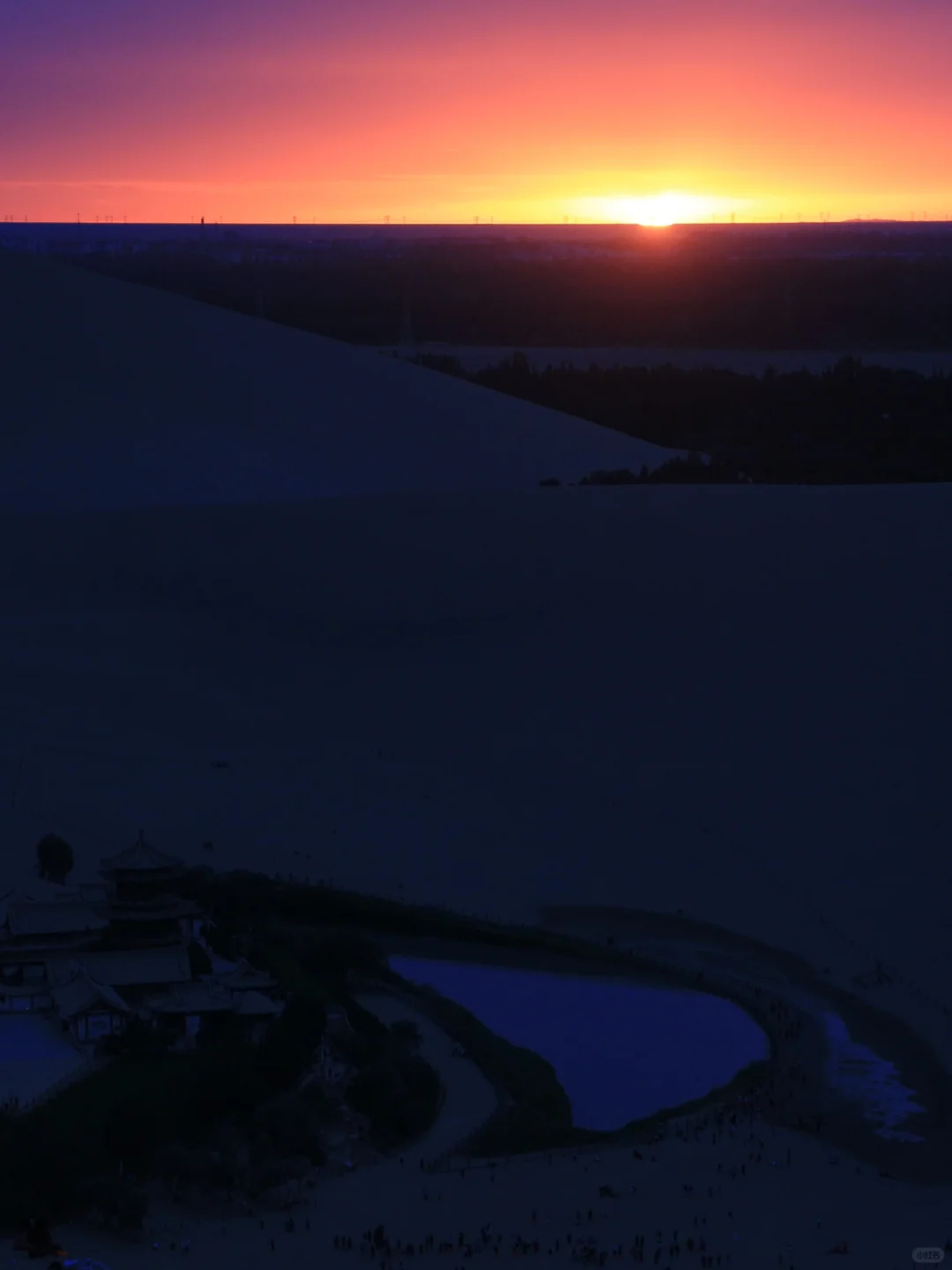 沙漠日落特别壮丽,真的可以体会大漠孤烟直,长河落日圆的氛围。日落时间比较晚,在鸣沙山上静静等待日落以及月牙泉的华灯初上,很放松。