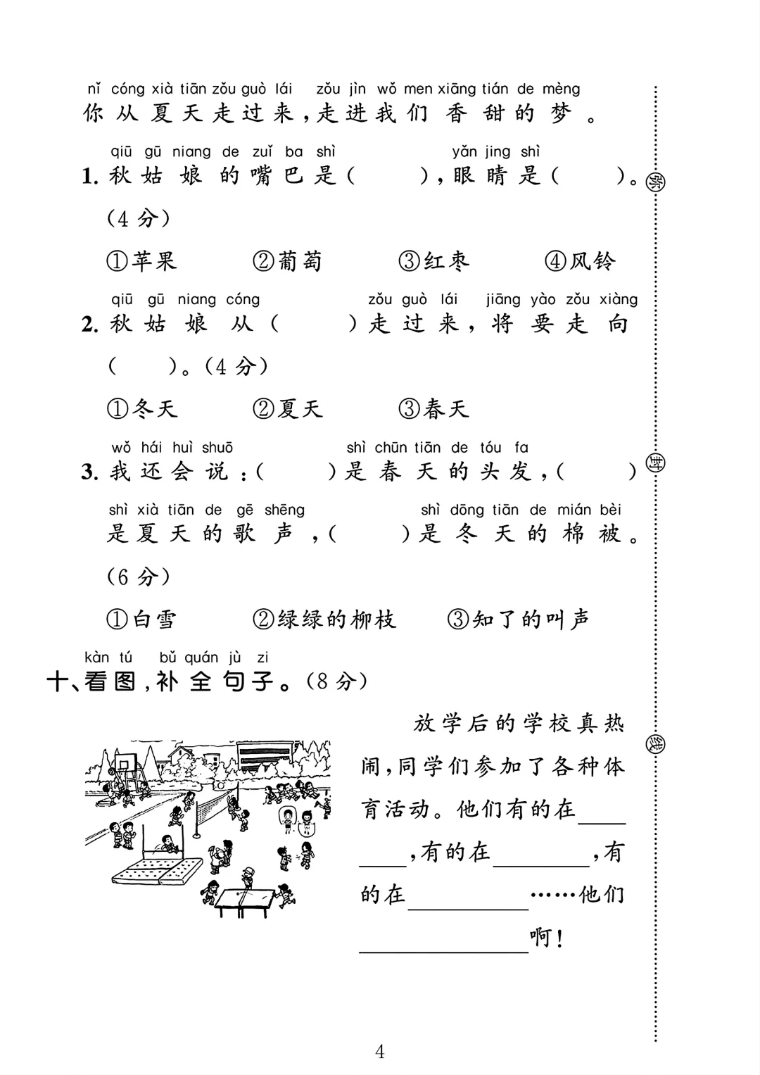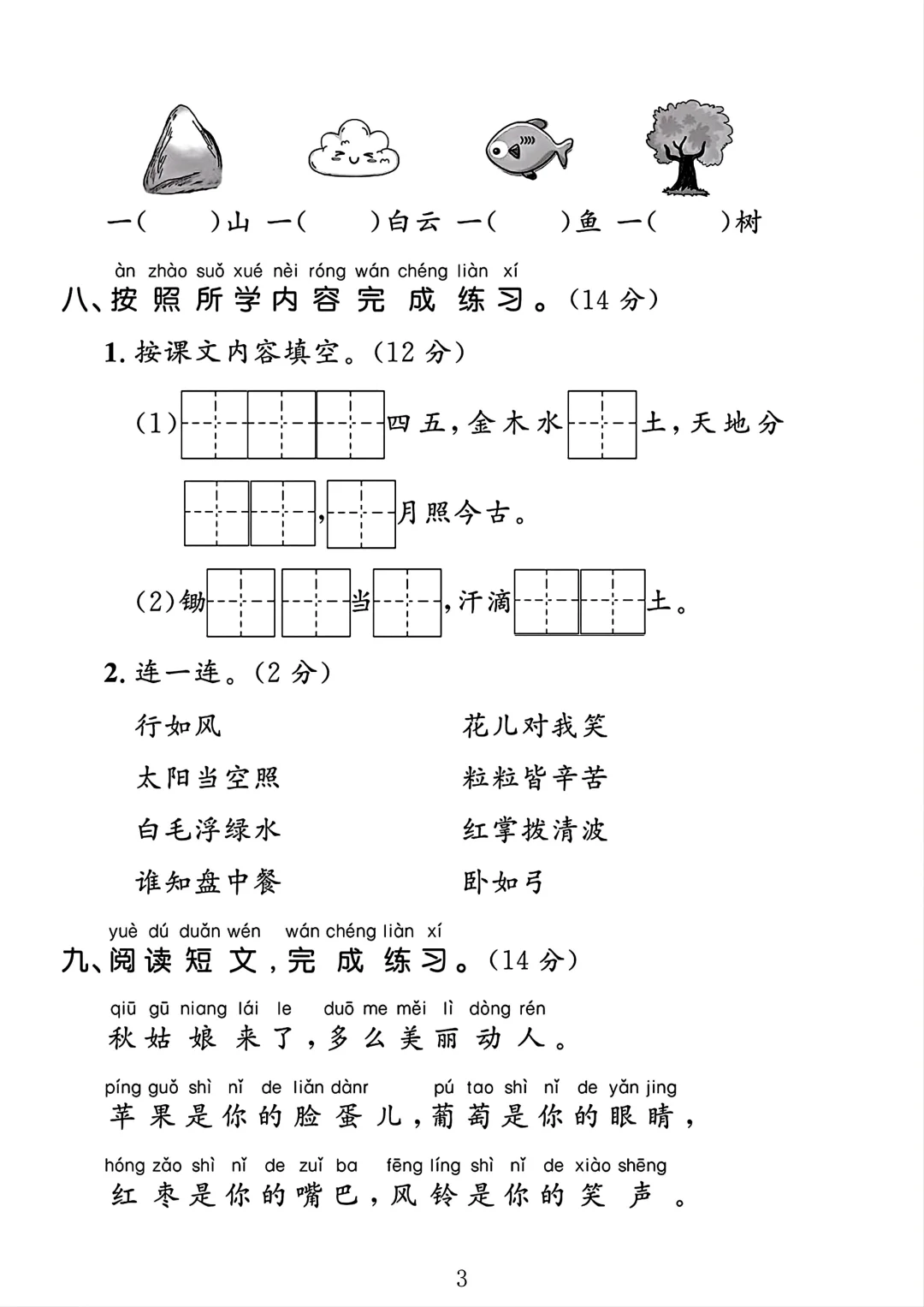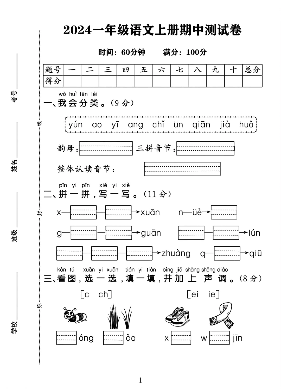 人教版 一年级上册语文 期中考试 期中测试卷 电子版可打印 试卷
