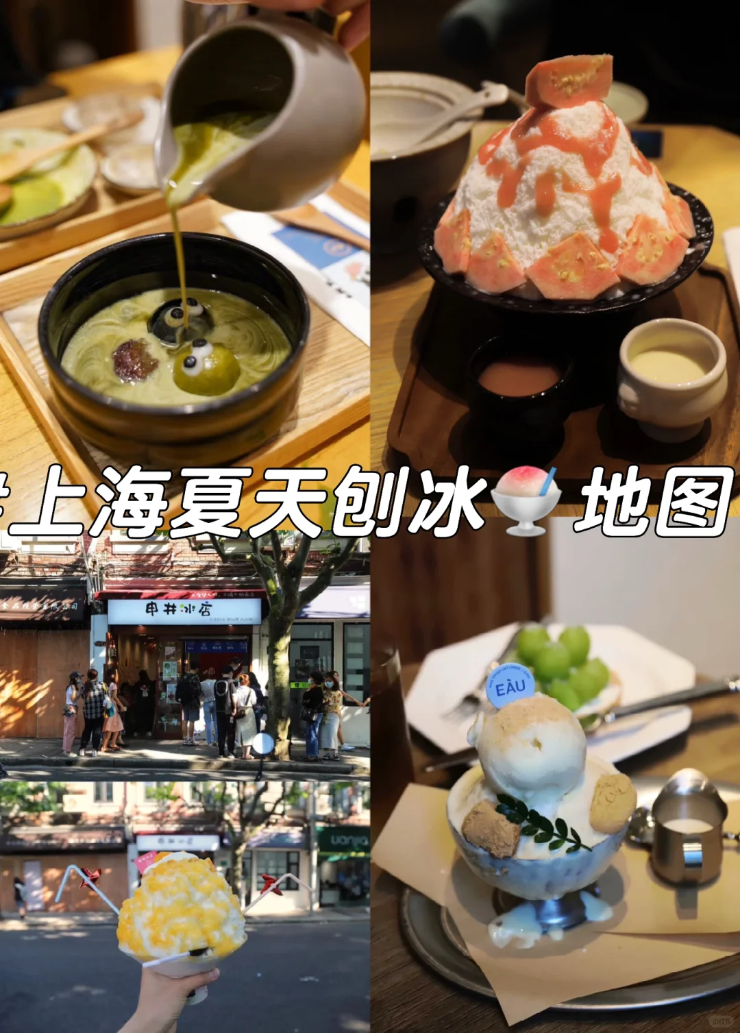 三伏天🌞我挖到了上海这些不同类型的刨冰🍧快去清凉一夏吧!主页还有冰淇淋合集,喜欢gelato的可以去看看! [一R]芭乐冰 今年闽南水果芭乐黄皮超火!推荐📍叙夏。是雪冰那种较绵密的口感,底下还有椰丝、椰肉脆。冰博克奶味和芭乐特殊香气融合,真的很清新!芭乐本身味道较淡,建议找店家多要一点芭乐汁淋上去。 [二R]榴莲冰 自从在新加坡🇸🇬吃了榴莲冰,就一直感叹上海怎么没有!挖到了📍叙夏有类似款!榴莲肉打成泥量超多!加上桃胶、椰奶、椰片、莲子,真的很难不爱! [三R]椰子冰 夏天当然要吃椰子🥥啦!这家📍yoco crush是那种炒冰。椰子冰加上太阳伞⛱️度假氛围拉满。 [四R]黄豆冰 黄豆粉和韩式雪冰那种绵密的口感真的绝搭!强烈推荐韩国街这家📍wid coffee。第一次吃那种绵绵沙沙入口即化的感觉,惊艳了我好久。 [五R]抹茶冰 喜欢苦口的推荐这家📍eau cafe。整个造型好漫画,顶上是茉莉冰淇淋,抹茶较苦较浓郁。喜欢微甜抹茶的,看这家📍露地怪物冰屋。造型太可爱了,可以get康熙来了同款。 [六R]豆乳冰 📍eau的这款,豆乳冰淇淋➕豆乳酱➕黄豆年糕的组合,豆奶香十足。 [七R]草莓冰 📍 Kooriya Shark,来自日本🇯🇵吉祥寺的网红刨冰店。好看是真好看,但料有点少。 [八R]芒果冰 安福路上老网红📍申井冰店。店内环境很温馨,这款芒果冰加了跳跳糖挺好玩的。