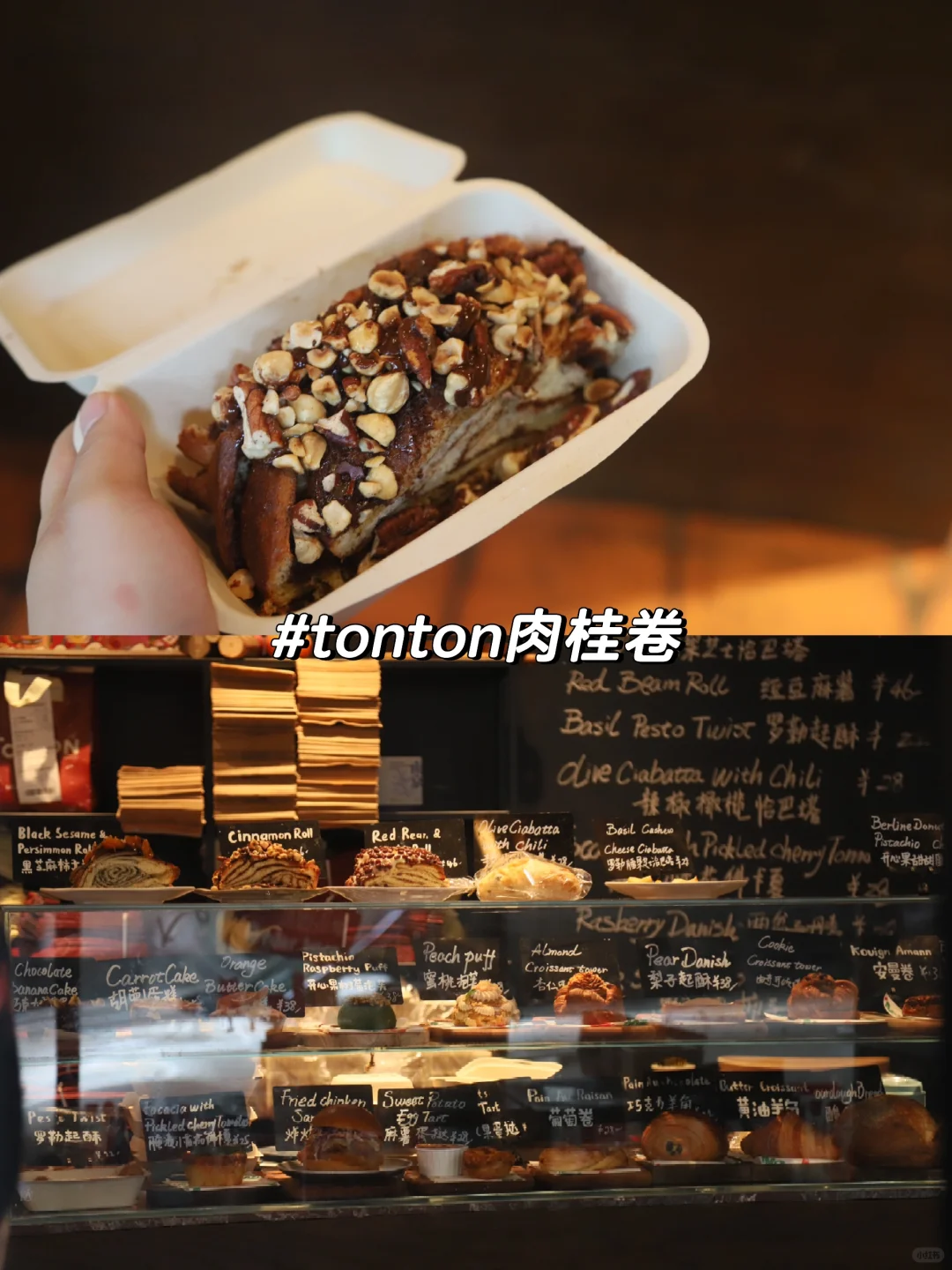 魔都排名第一的肉桂卷。造型层层叠叠,外层酥脆、里面松软,还有榛子、核桃超级丰富的坚果,肉桂味不冲,加上巧克力🍫,很难不好吃!建议早点去买,太晚会买不到。