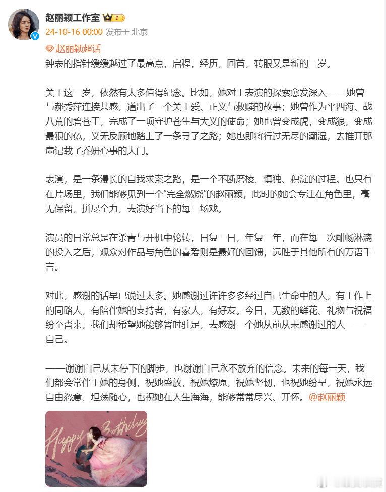 #工作室发文为赵丽颖庆生# 今日零点发文庆祝37岁生日:“未来的每一天,我们都会常伴于她的身侧,祝她盛放,祝她燎原,祝她坚韧,也祝她纷呈,祝她永远自由恣意、坦荡随心,也祝她在人生海海,能够常常尽兴、开怀。” 祝丽颖生日快乐!