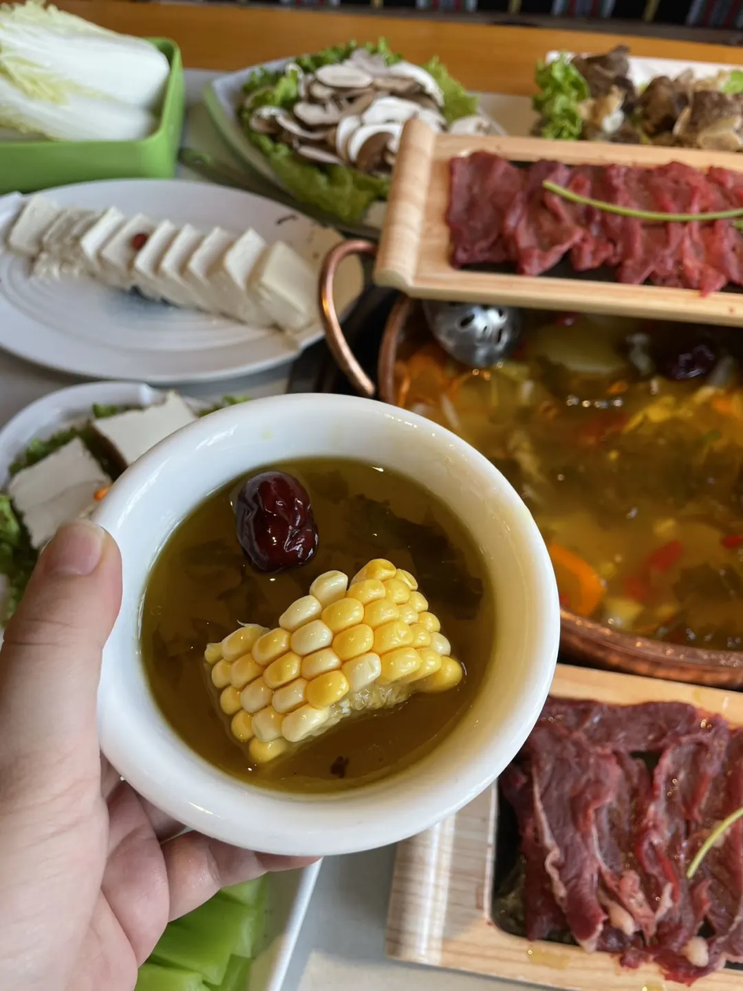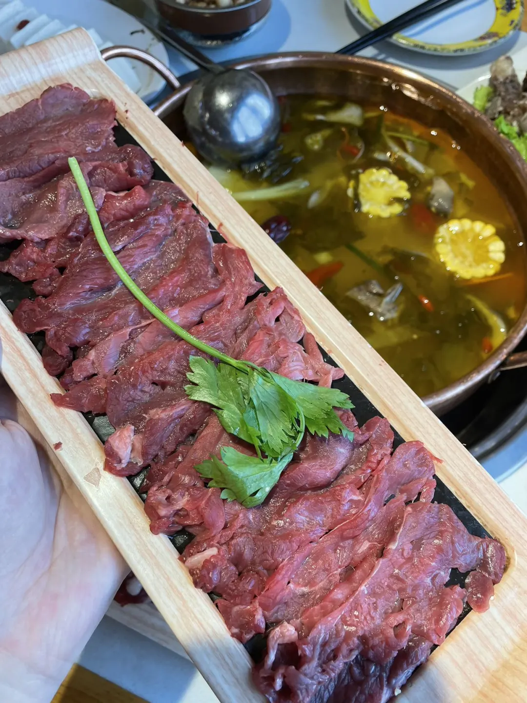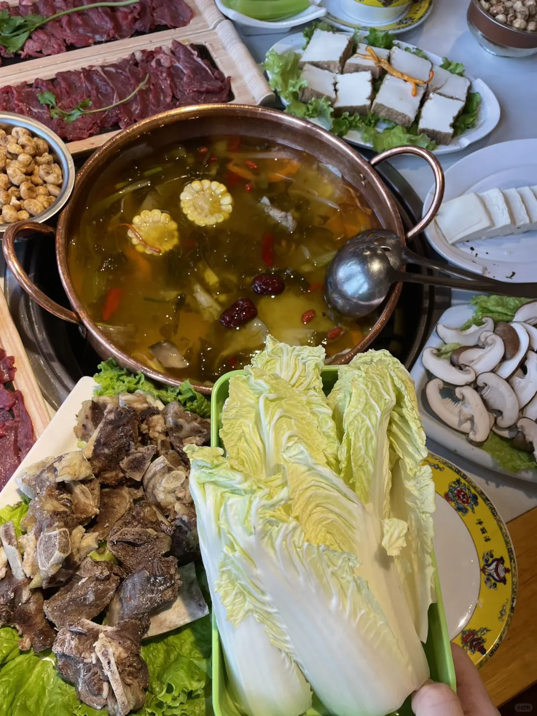 当地原生态放养的牦牛肉,每天现杀现切,口感鲜香无必,肉质紧实,搭配上自然发酵的酸汤,只需要几秒就能让你享受到最极致的美味!配上秘制蘸料,麻麻辣辣的也很好吃!