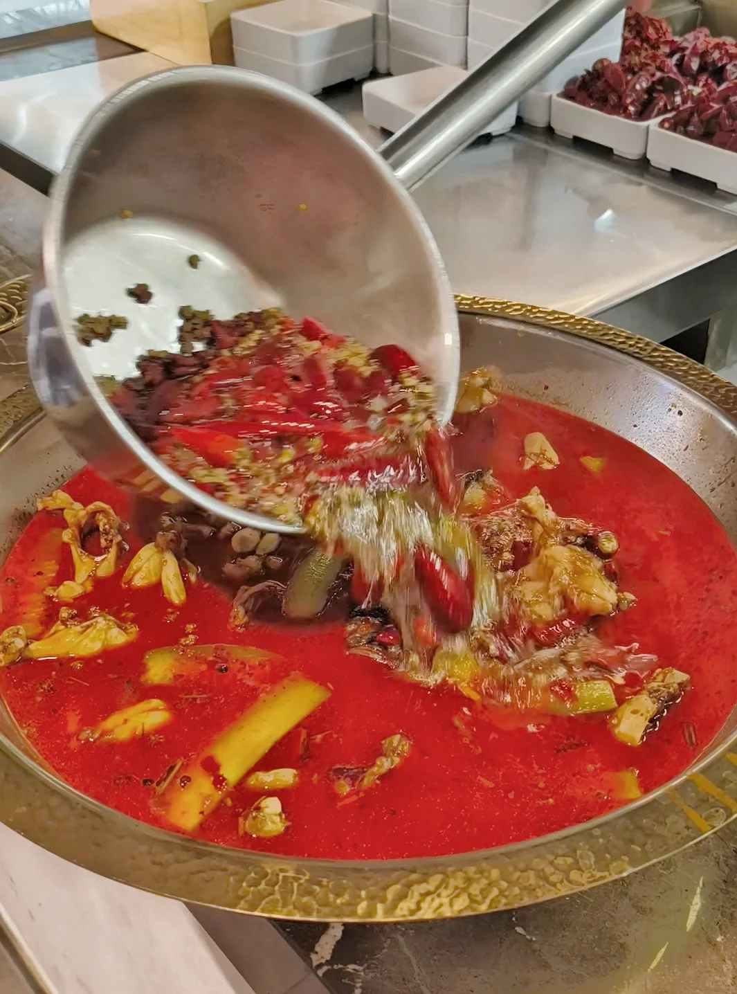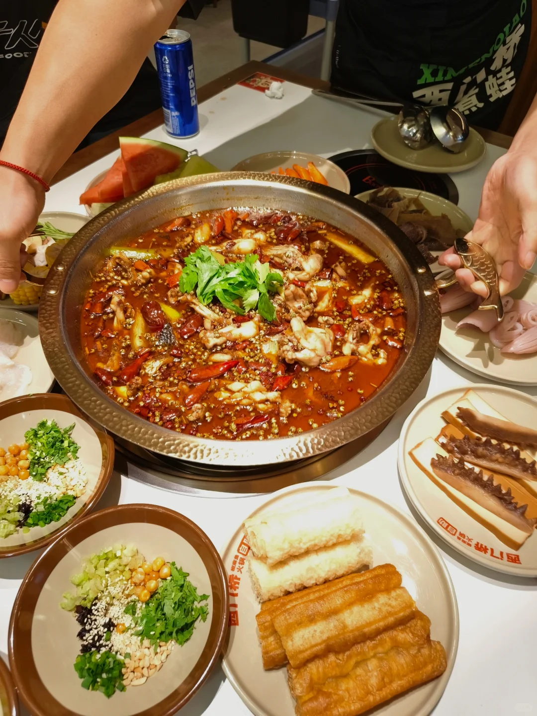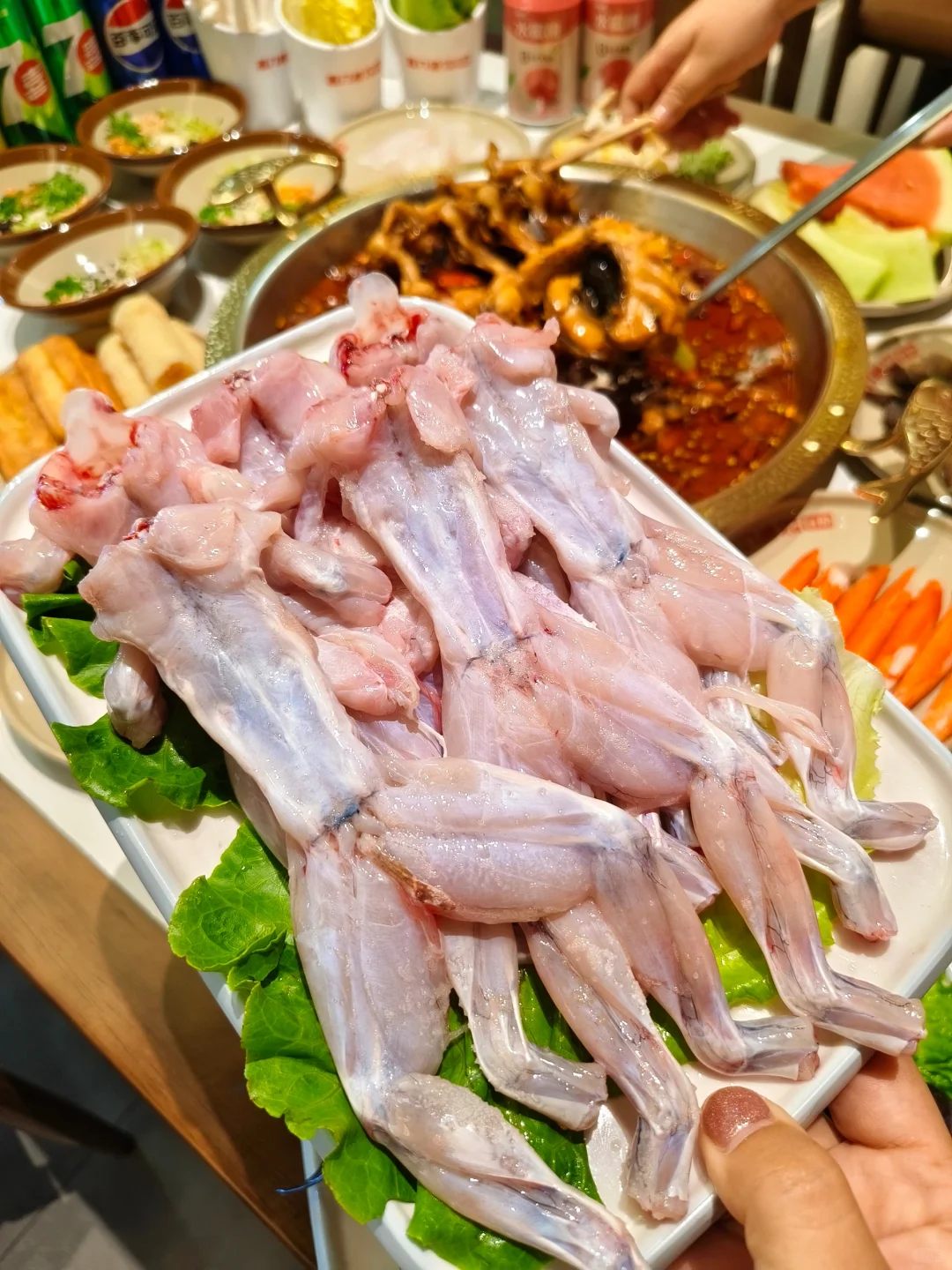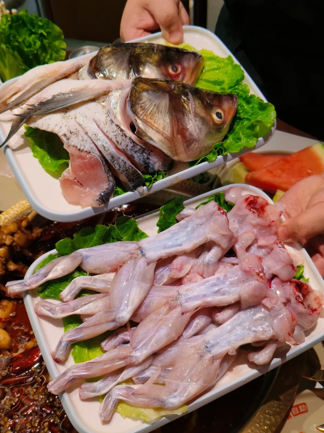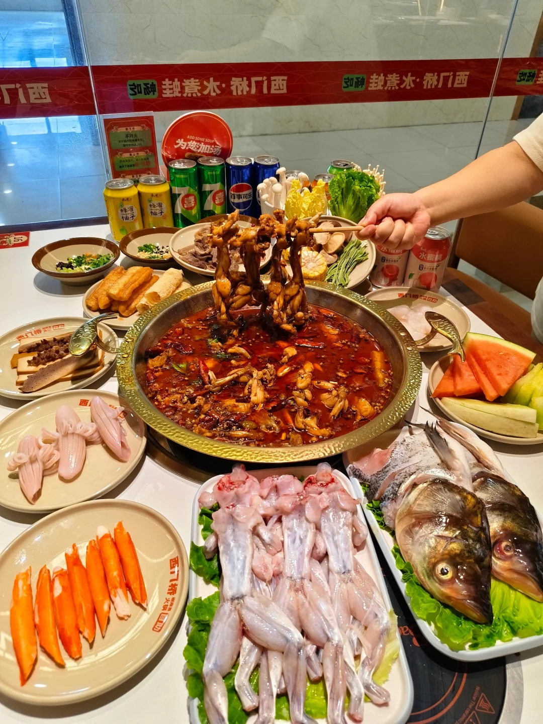 宝龙广场新开一家西门桥水煮蛙自助火锅,整锅牛蛙随便炫的快乐必须拿捏,同事几个相约来赛吃牛蛙‼️ ✅【牛蛙➕大朵黑鱼花】 自助畅吃,牛蛙全部鲜活现S,上桌还在跳舞💃🏻,锅底全部现炒,再用热油激香。 菜品自选去菜品补给及时,巴沙鱼,素毛肚,牛肉丸,培根🥓等品种丰富,食材也是肉眼可见新鲜。 🏠位置:宝龙广场4楼。 🍃环境:宽敞明亮,干净卫生。