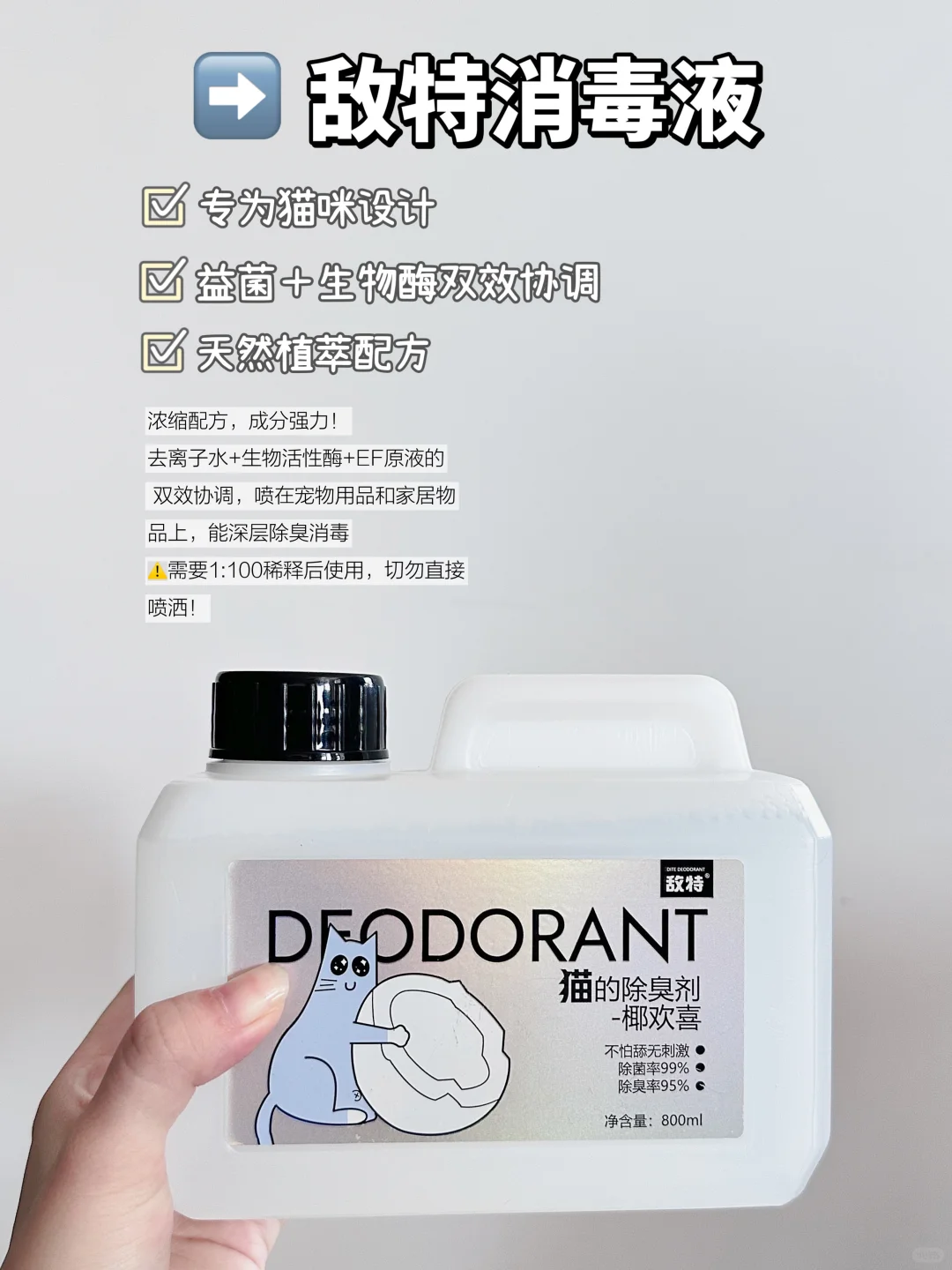 这款是浓缩型的消毒液,使用时要进行稀释,专为猫咪设计,主要用于物品的清洗不能直接喷洒,浸泡可深层祛味