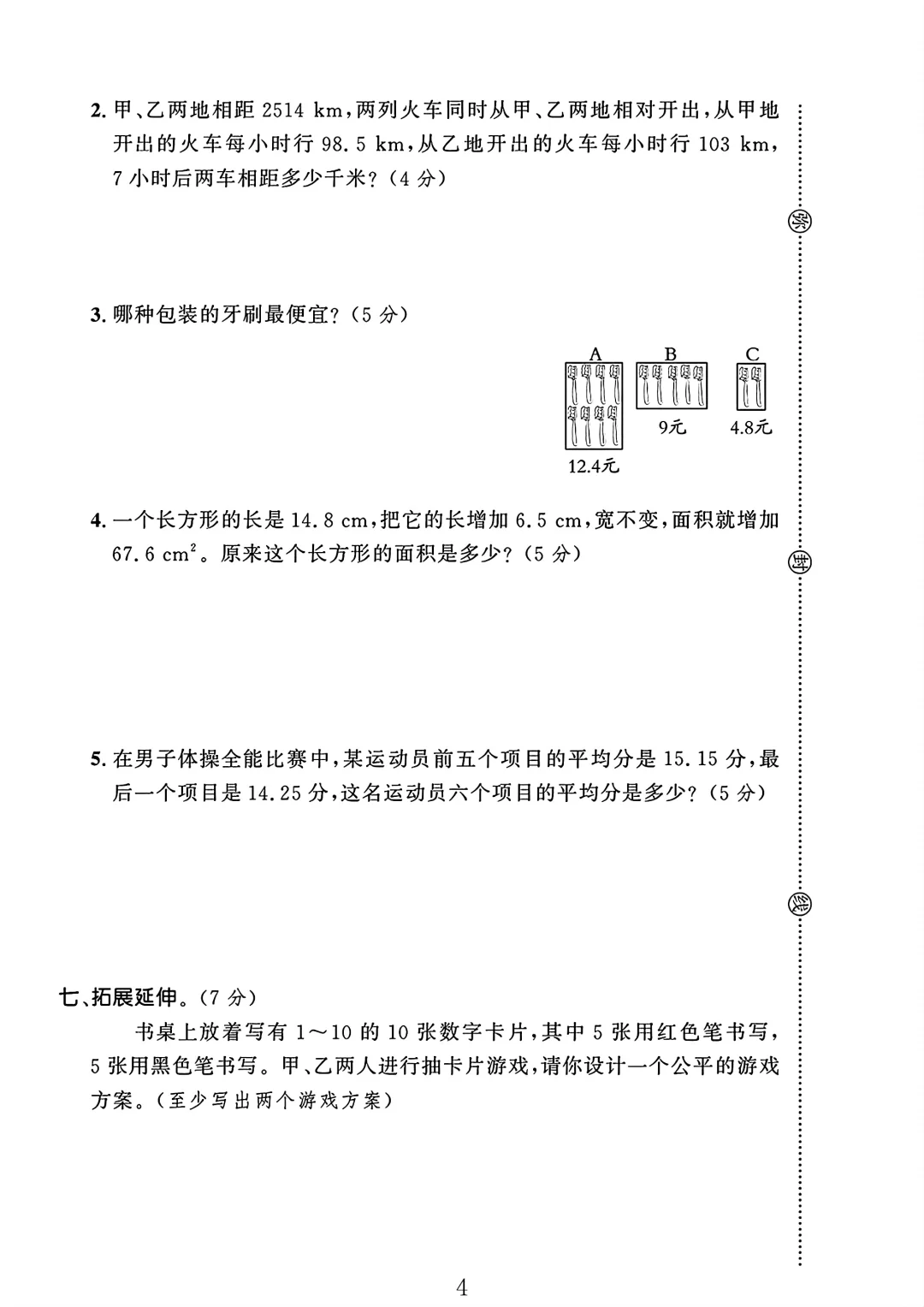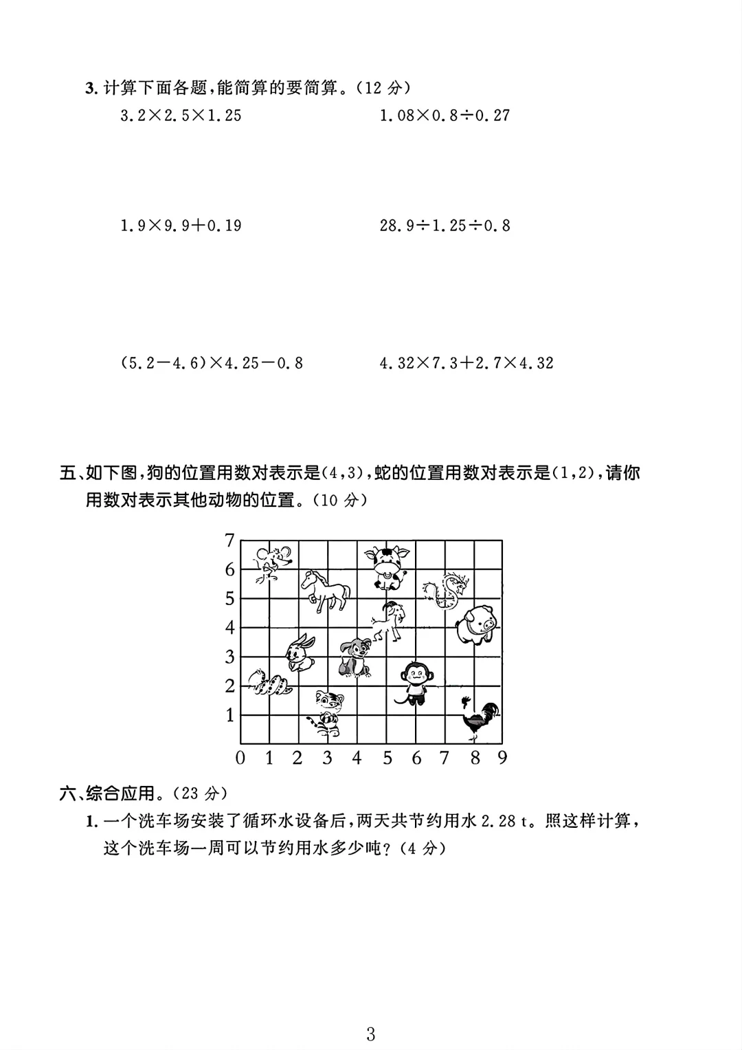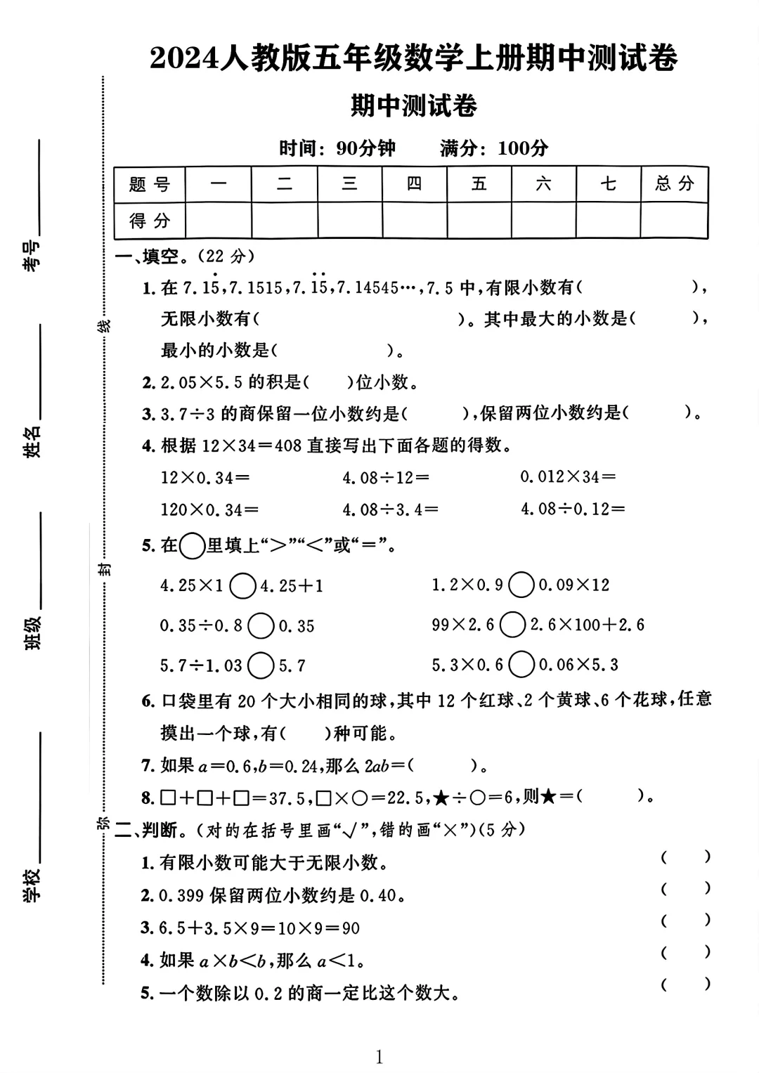 人教版 五年级上册数学 期中试卷 期中考试 试卷 电子版可打印