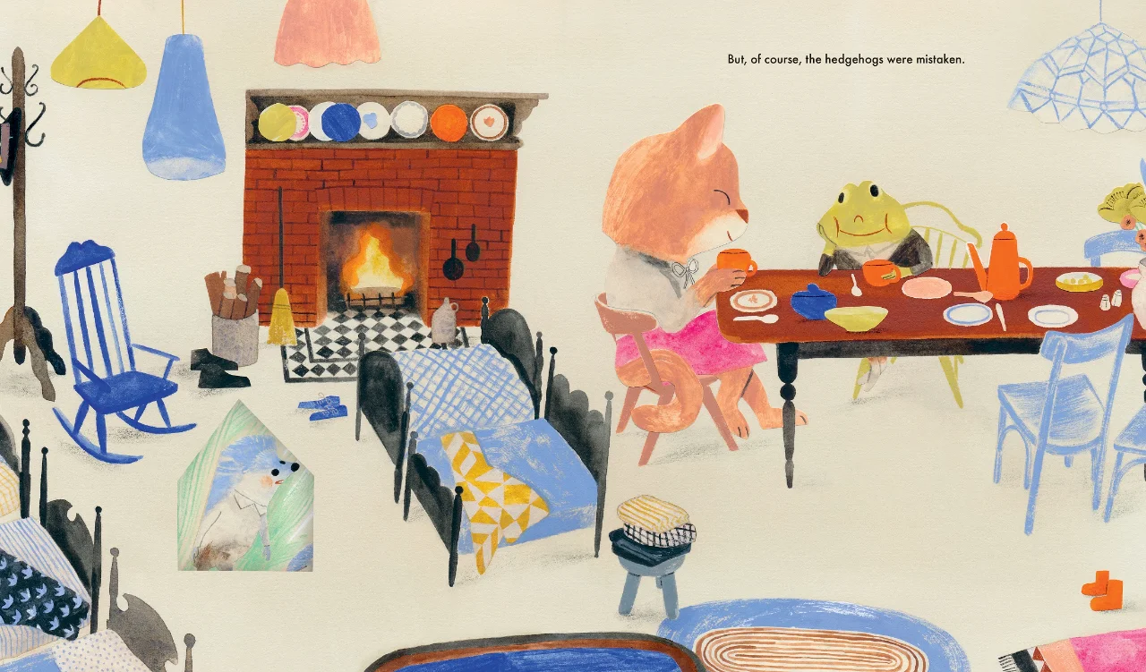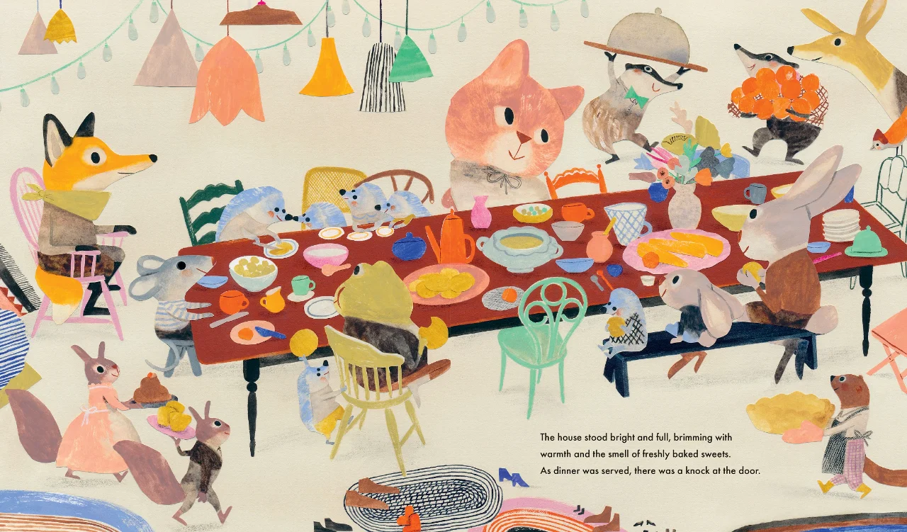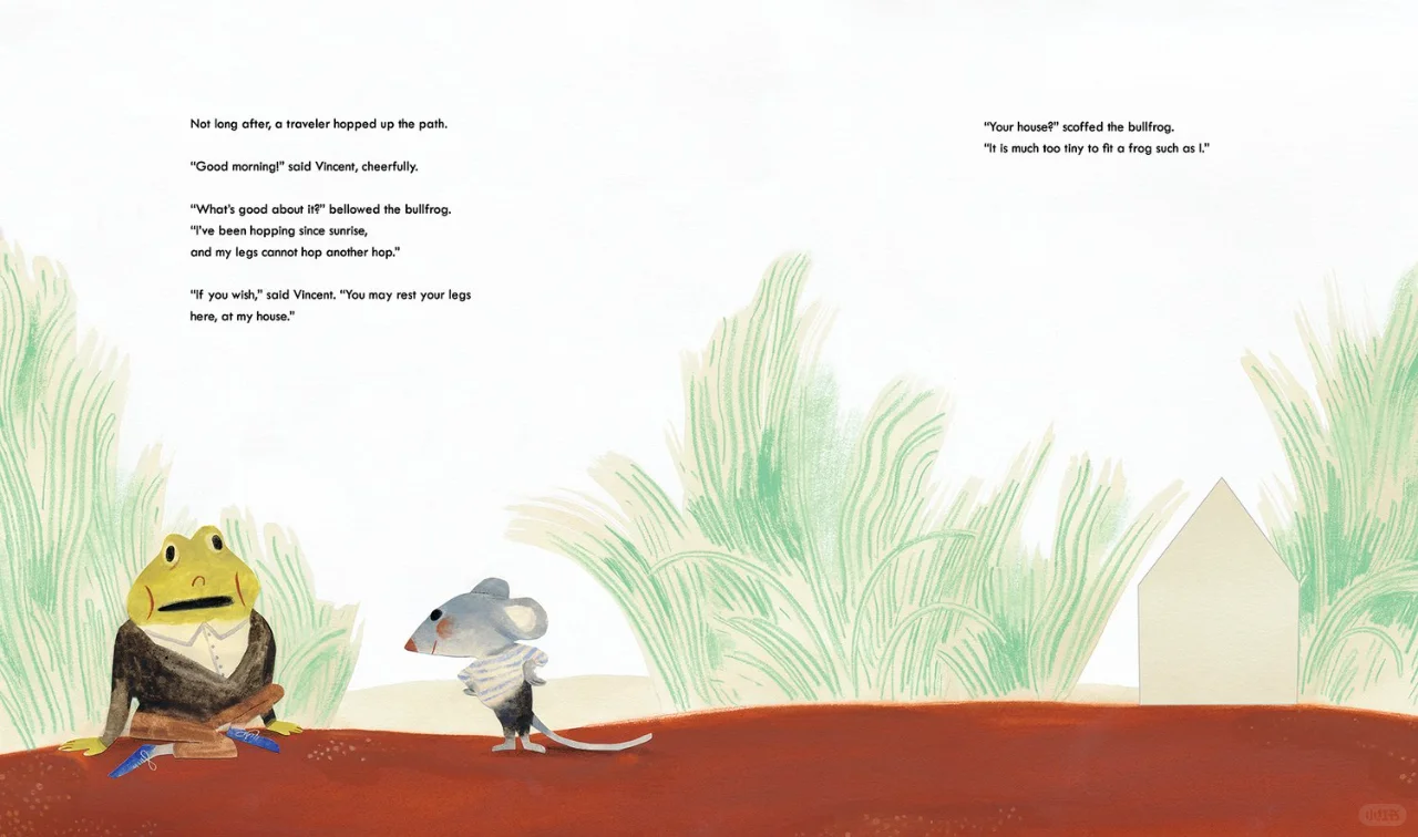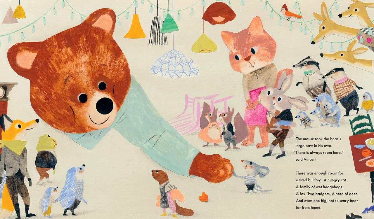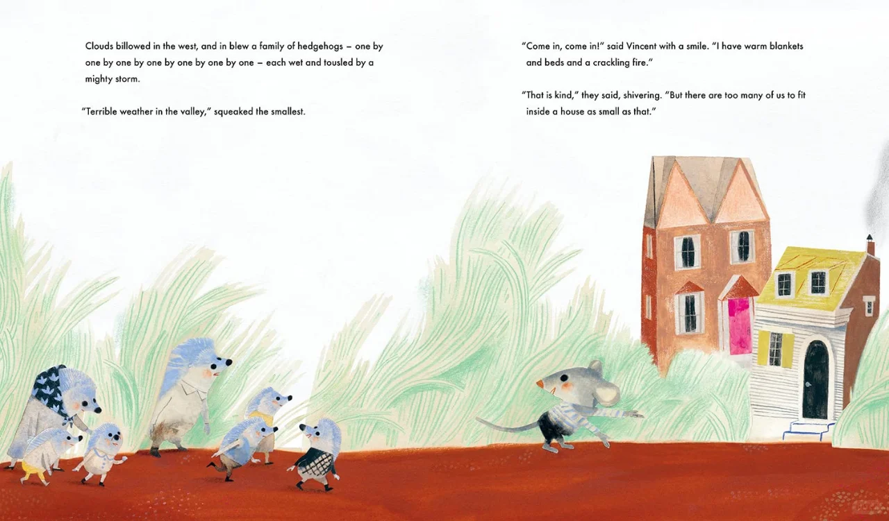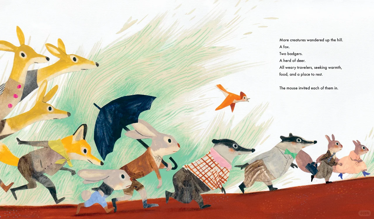 慷慨又热情的小鼠文森邀请动物们一个个进屋休息,看似小小的房子,没想到里面却宽敞无比,大家都能在文森的屋子找到位子,而且温暖又舒适。