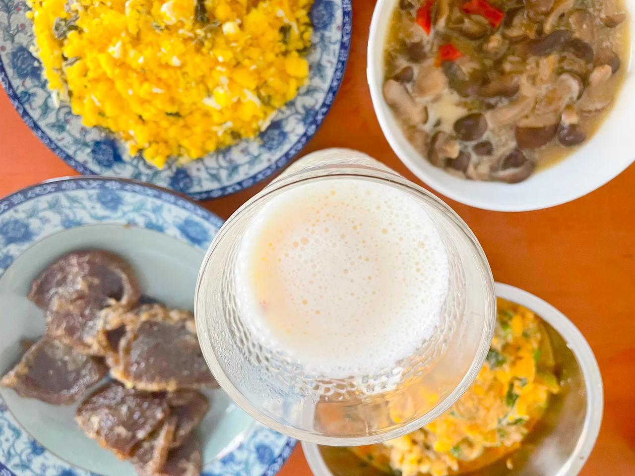 #秋日生活打卡季# #一人每日吃什么# 豆浆、豆渣、沙糖桔、干巴菌炒苞谷饭、洞菌等,一个人的午膳照自喜欢的做。