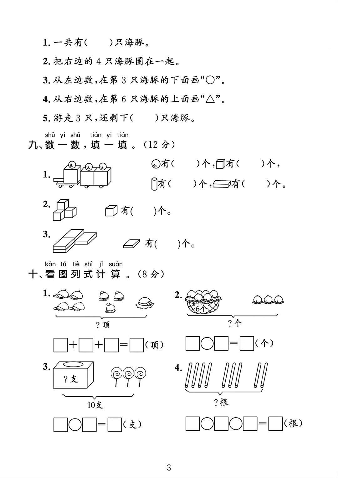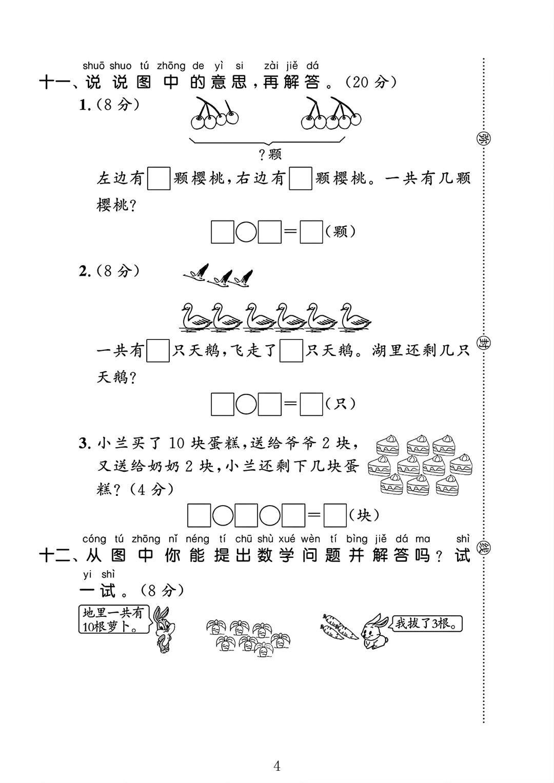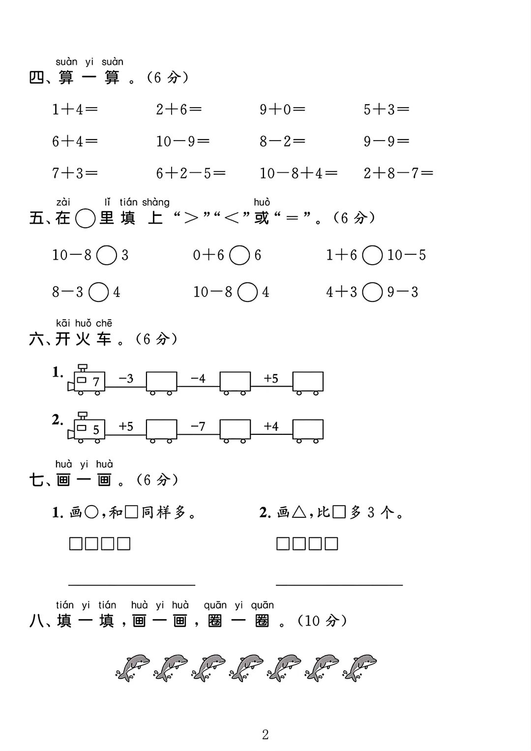 人教版 一年级上册数学 期中考试 期中试卷 电子版可打印 试卷